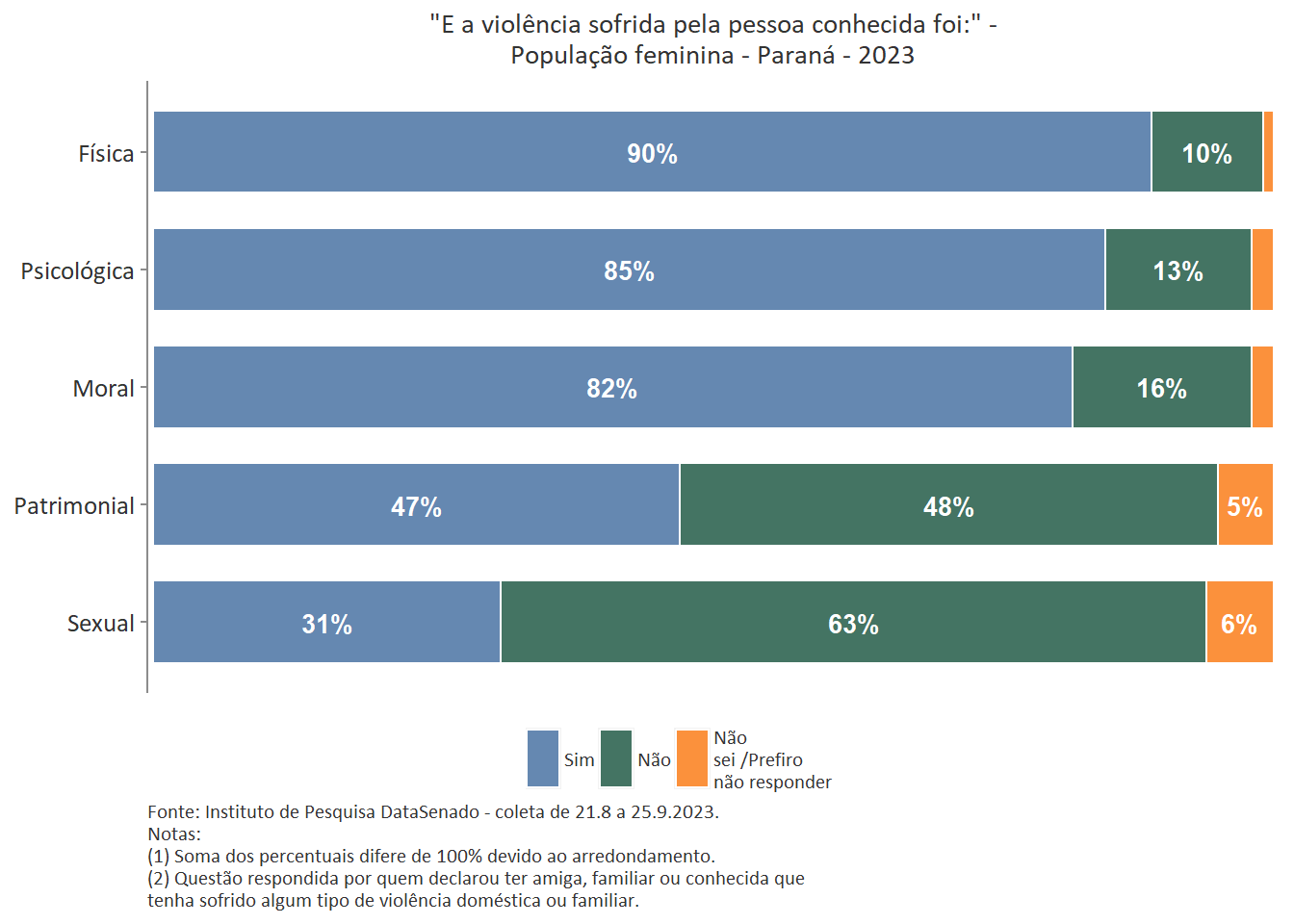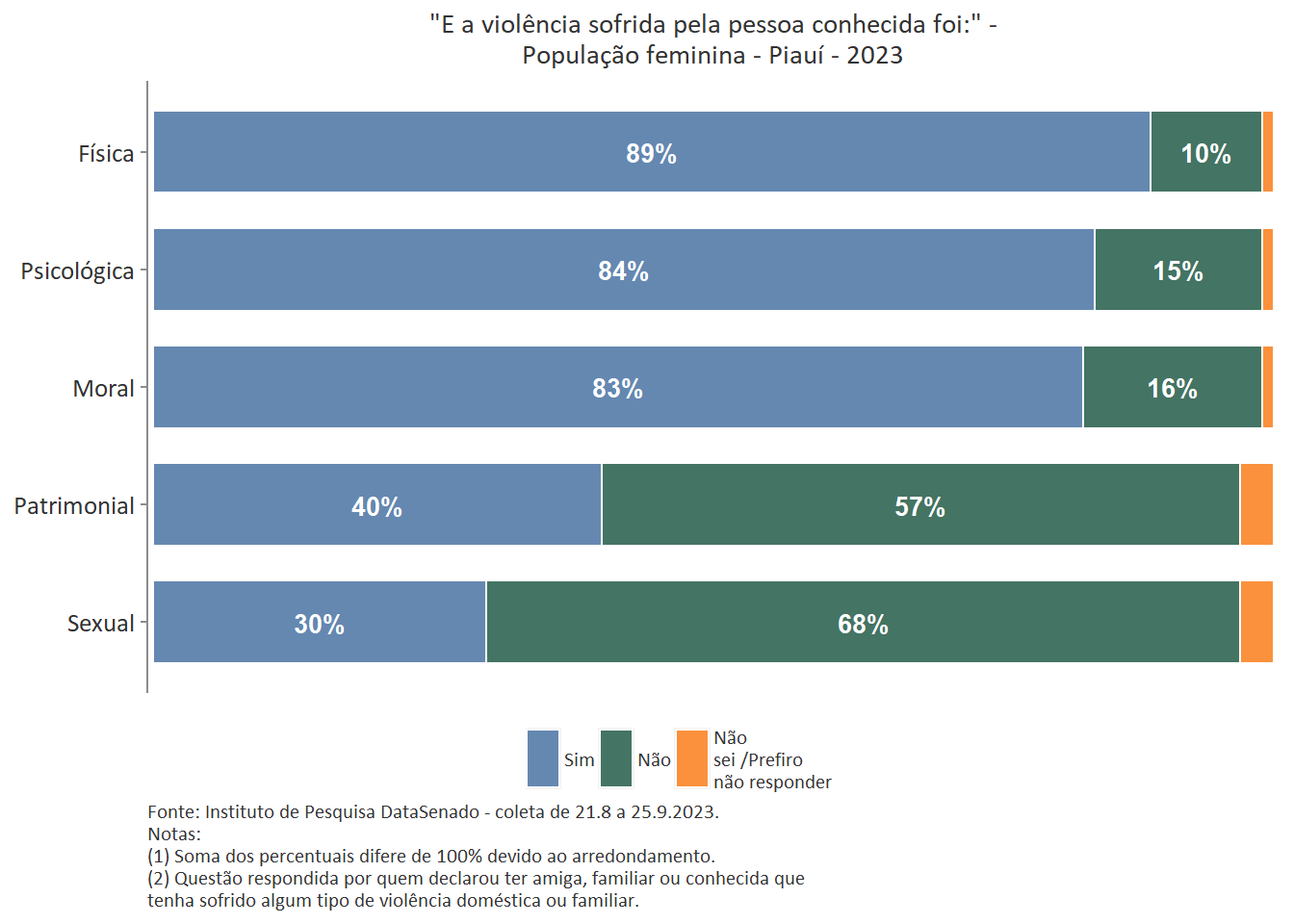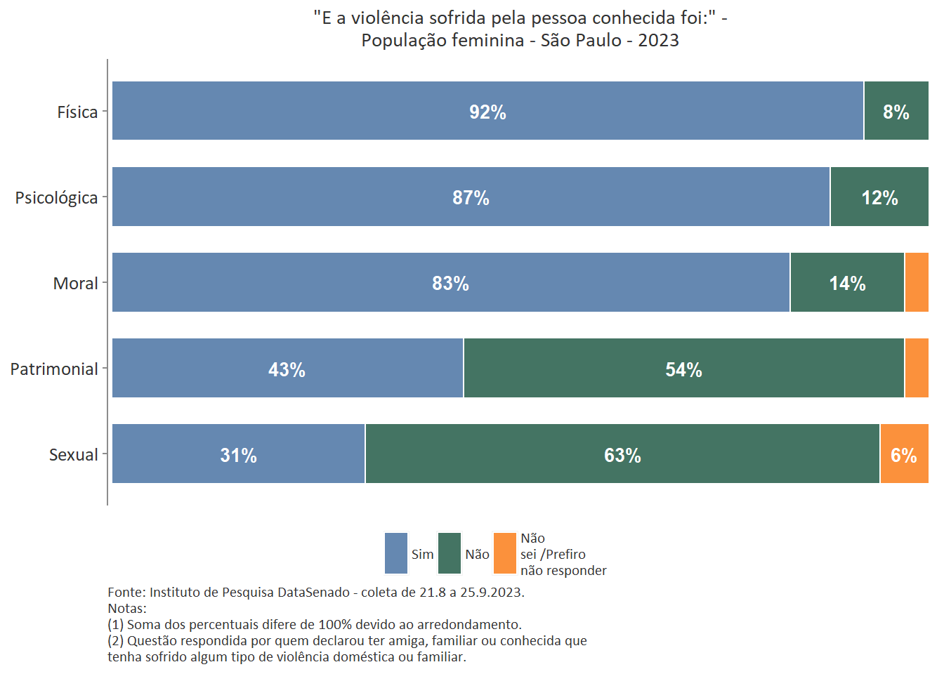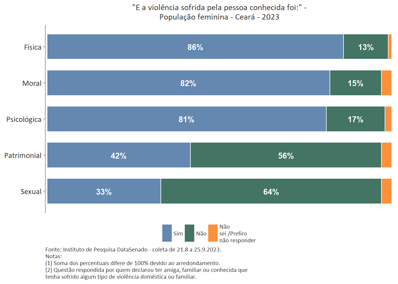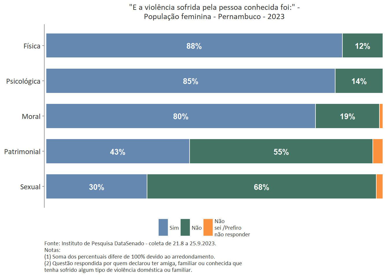 Quanto ao tipo de violência sofrida pela pessoa conhecida, a mais predominante é a violência física, reportada por 89% das brasileiras. Entre as amazonenses e as baianas esse patamar chega a 93%. Nas demais unidades federativas, o índice é estatisticamente equivalente ao nacional.