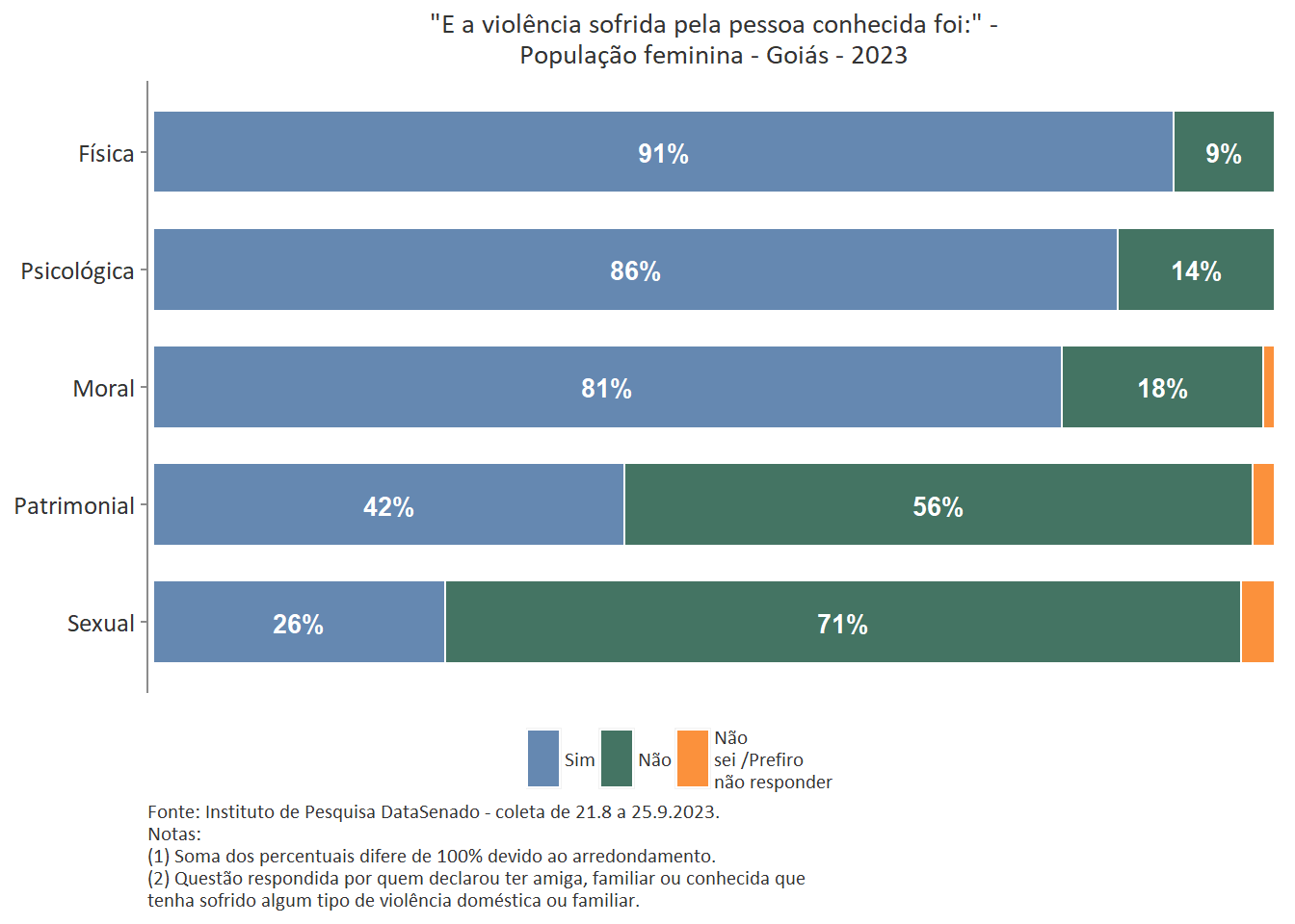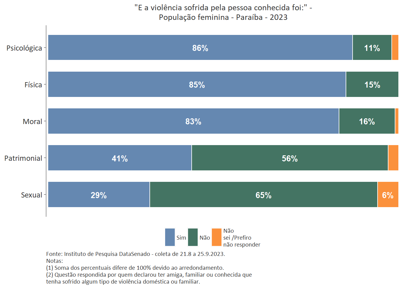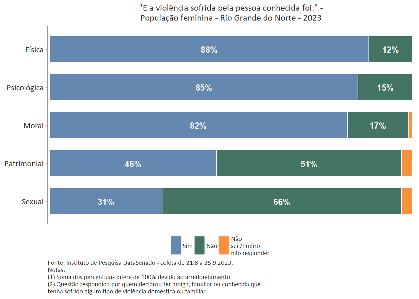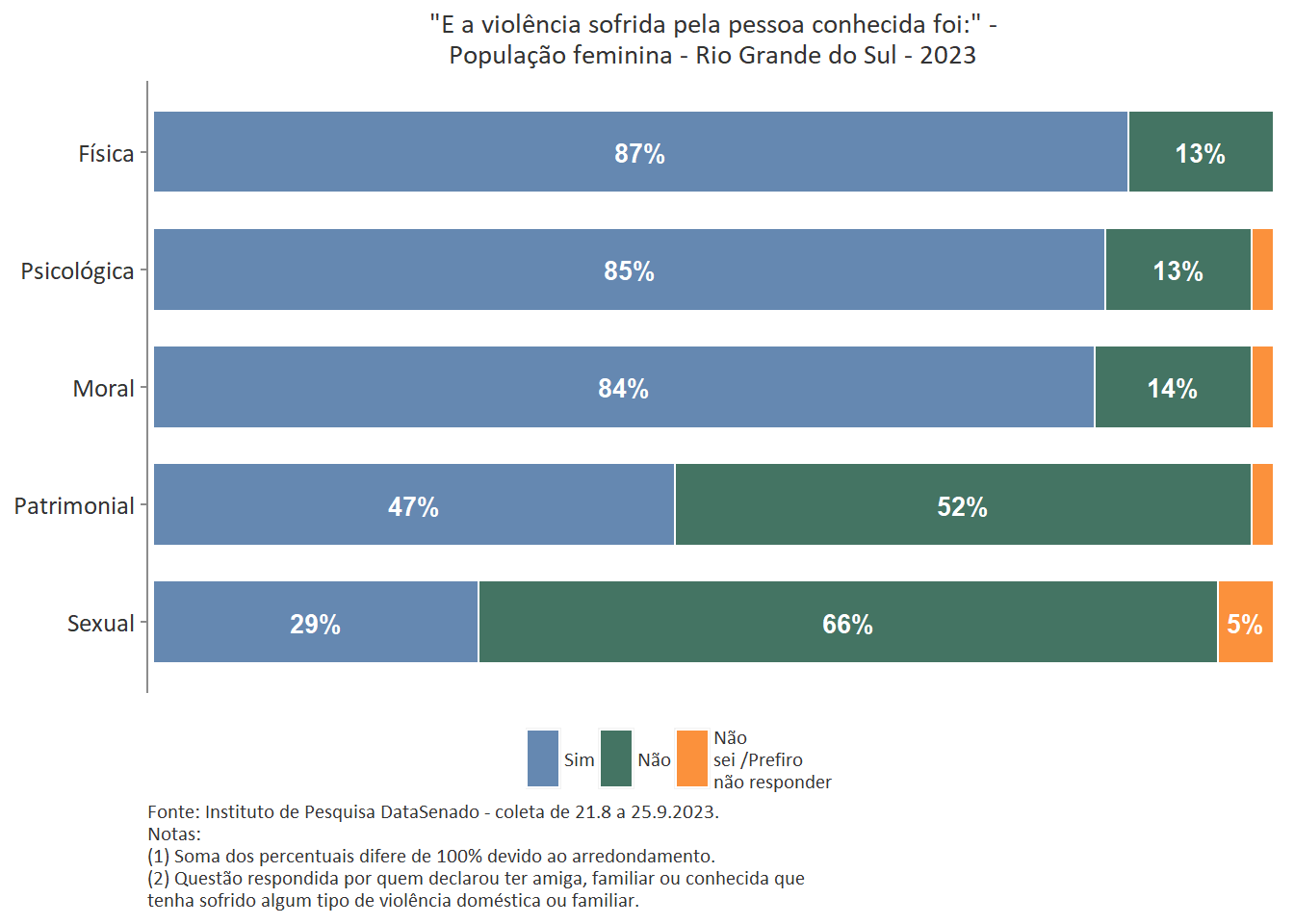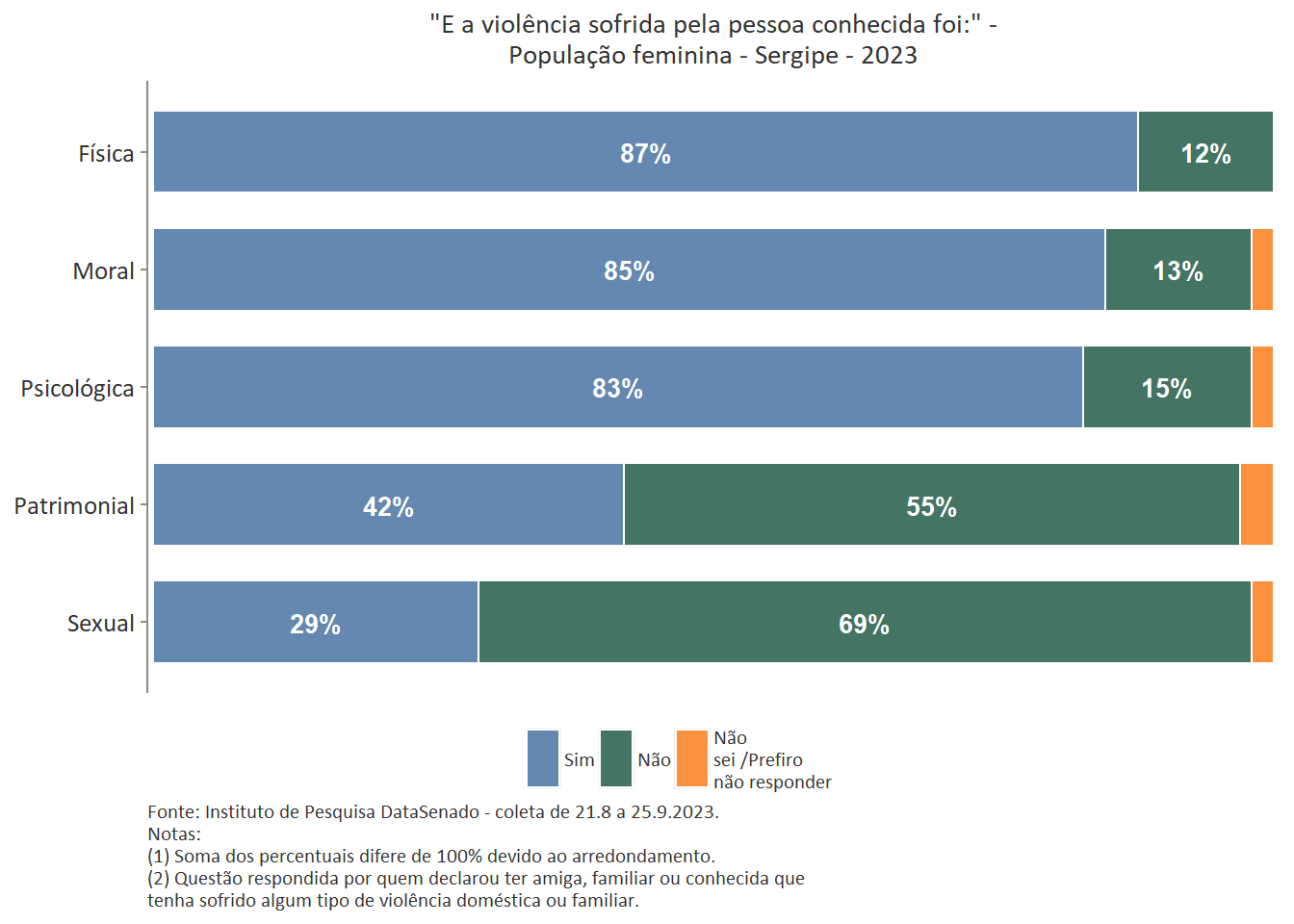 Quanto ao tipo de violência sofrida pela pessoa conhecida, a mais predominante é a violência física, reportada por 89% das brasileiras. Entre as amazonenses e as baianas esse patamar chega a 93%. Nas demais unidades federativas, o índice é estatisticamente equivalente ao nacional.