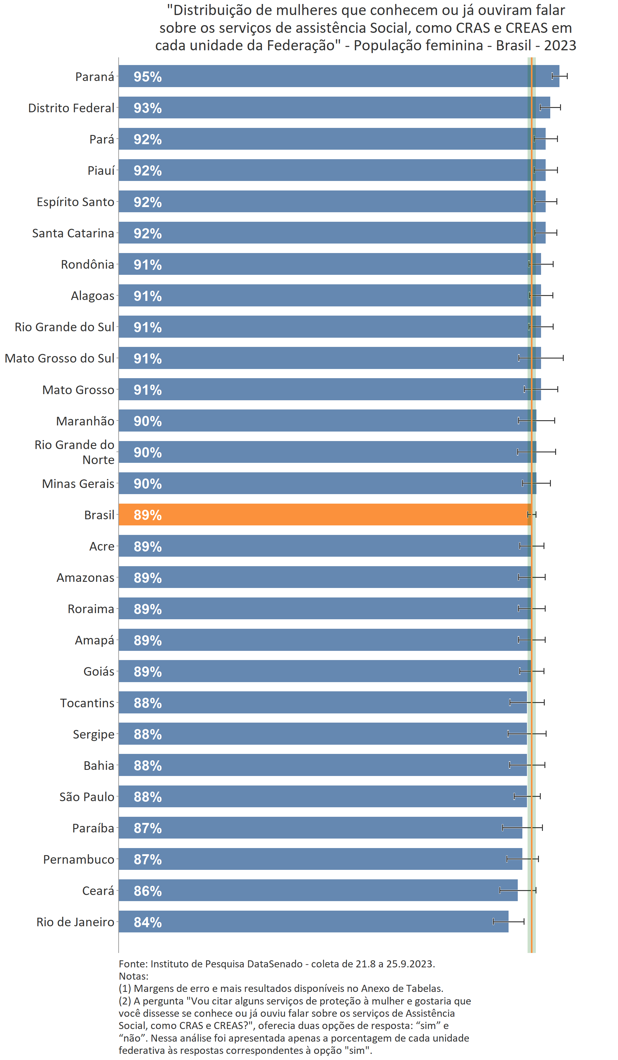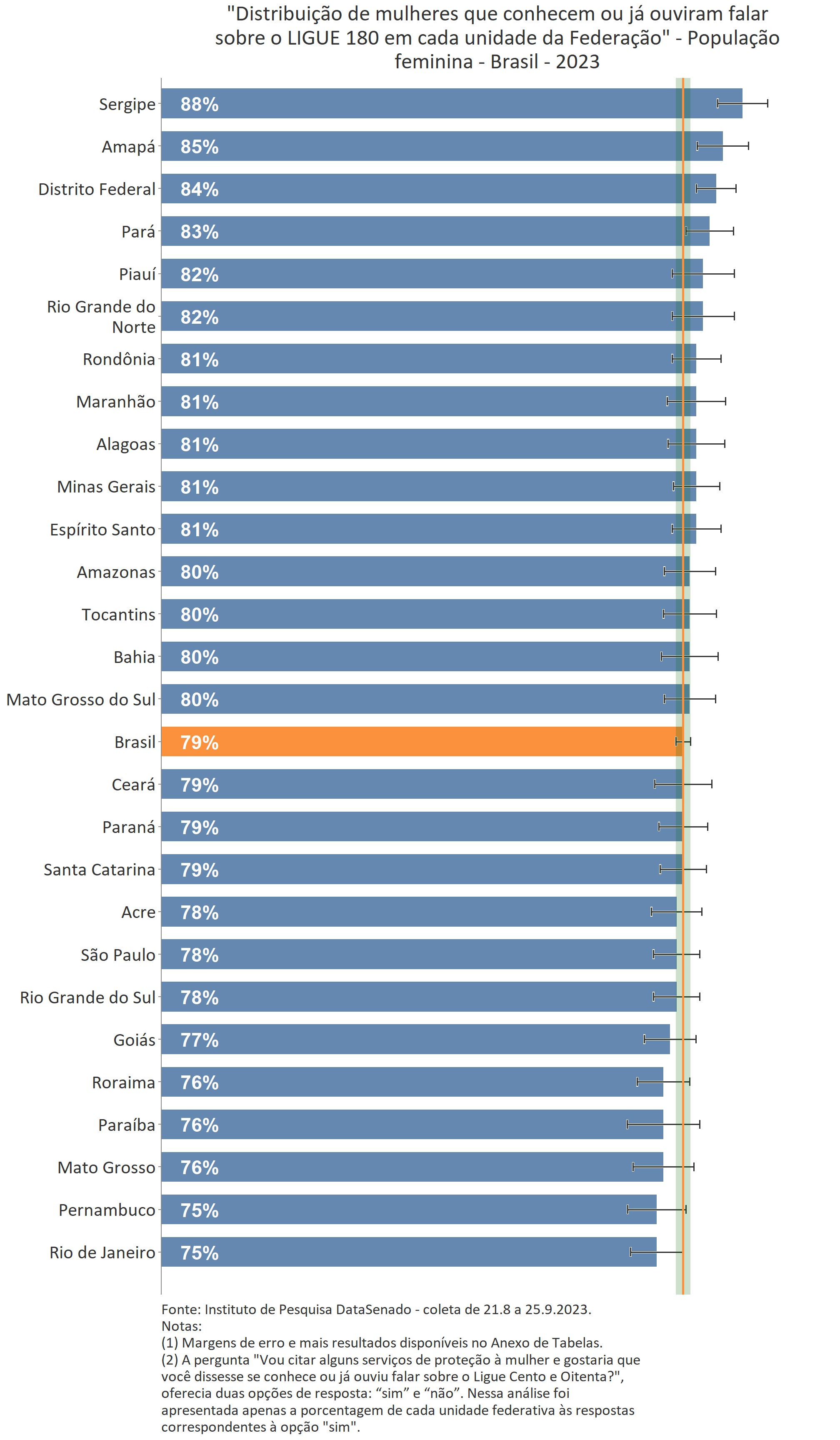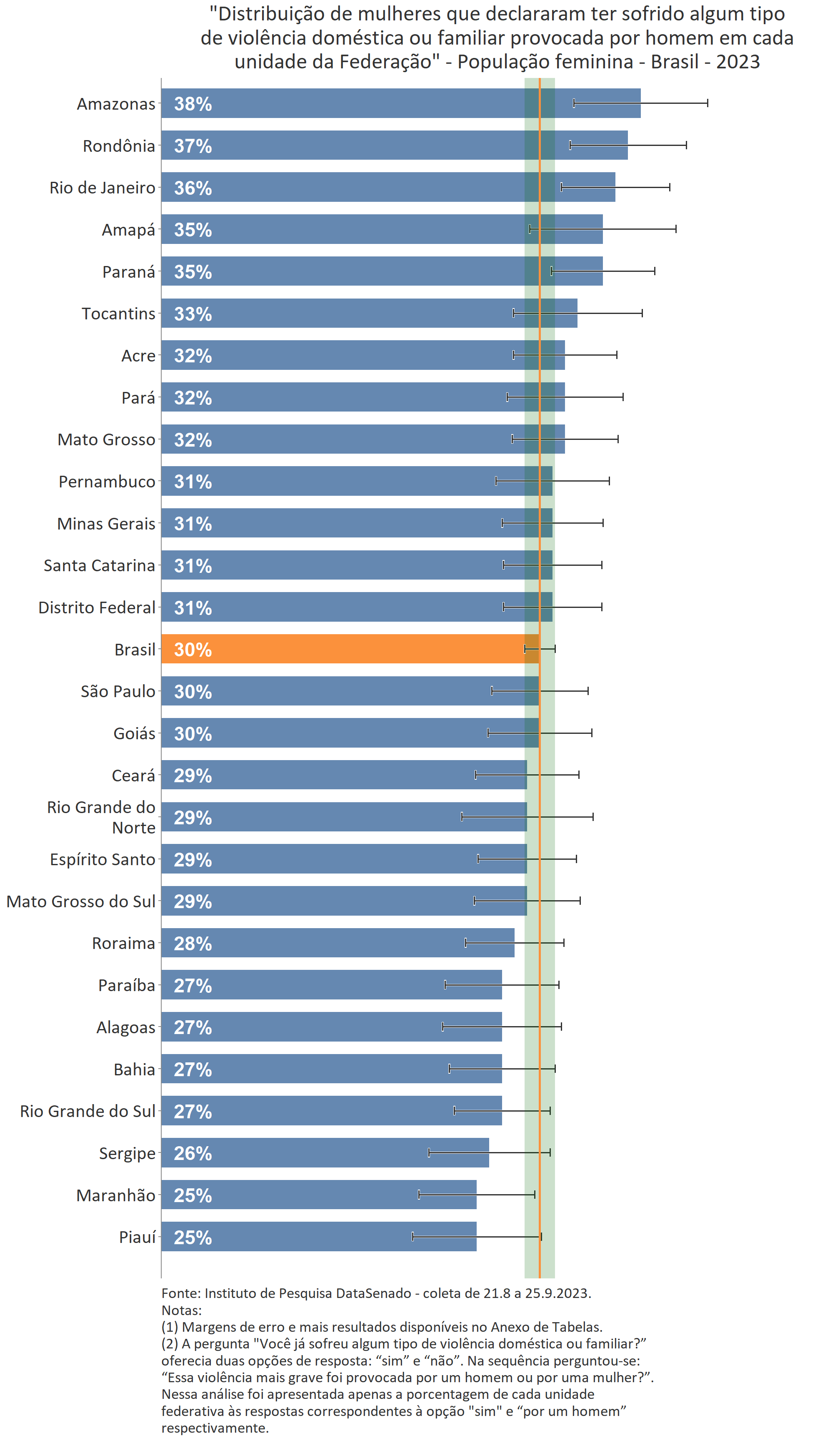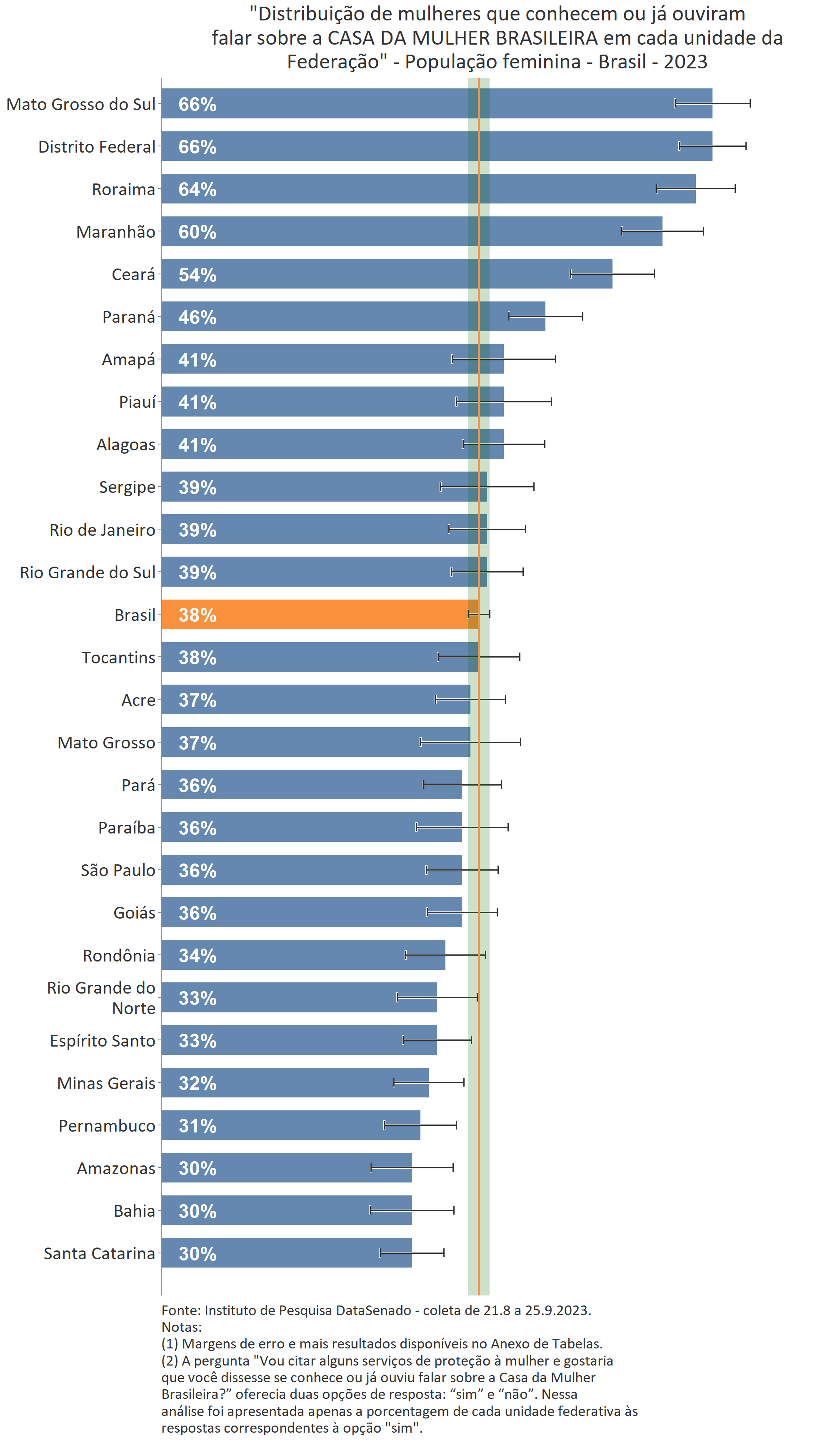 Ainda que o Mato Grosso atinja o mesmo patamar de 12%, tal como os estados de Santa Catarina e de Rondônia, a margem de erro encontrada para aquela unidade federativa é superior. Dessa forma, não há diferença estatisticamente significativa entre o índice nacional e o do Mato Grosso.↩︎