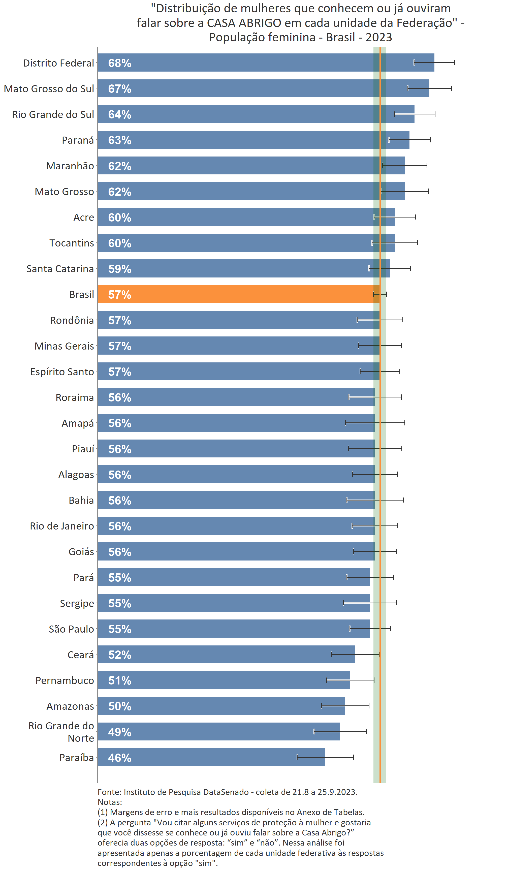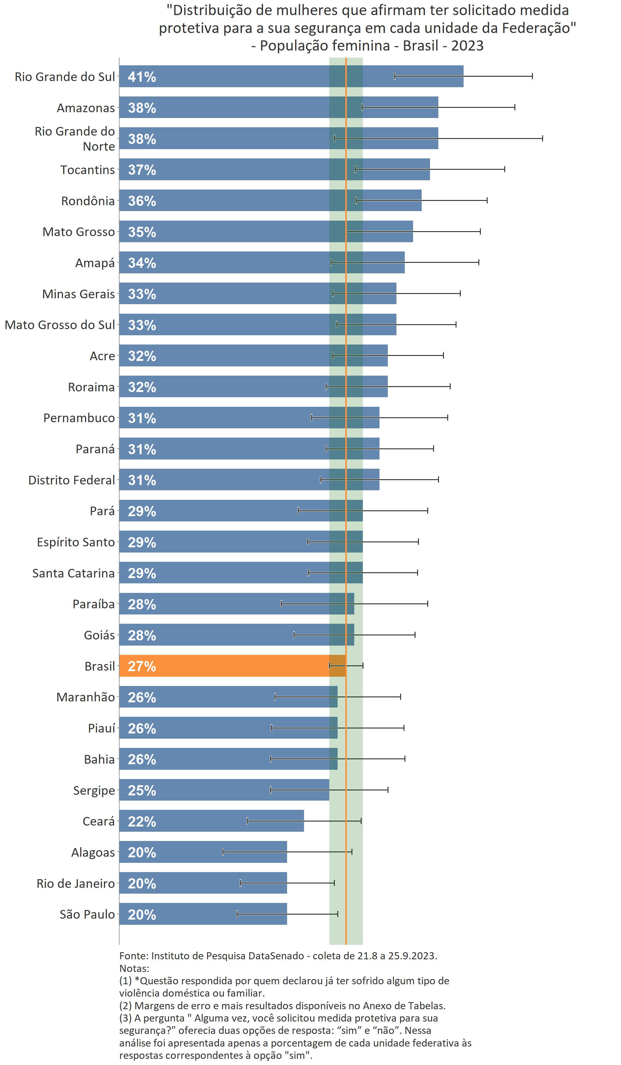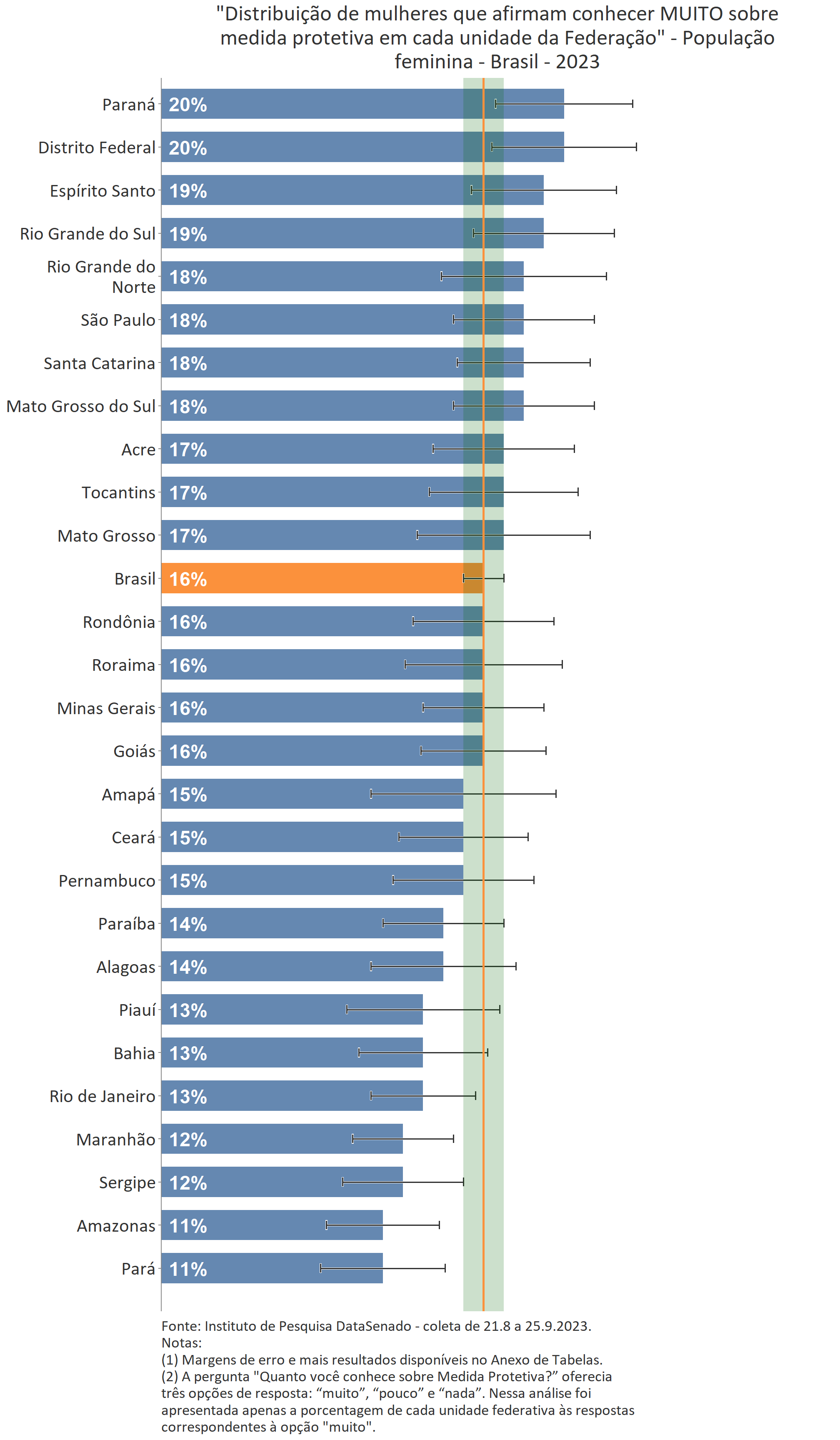 O levantamento mostra também que 16% das brasileiras afirmam conhecer muito sobre medida protetiva, patamar que se mantém em todo território nacional, considerando as margens de erro. A única exceção é o Pará, estado com o menor número de cidadãs que afirmam o mesmo (11%).