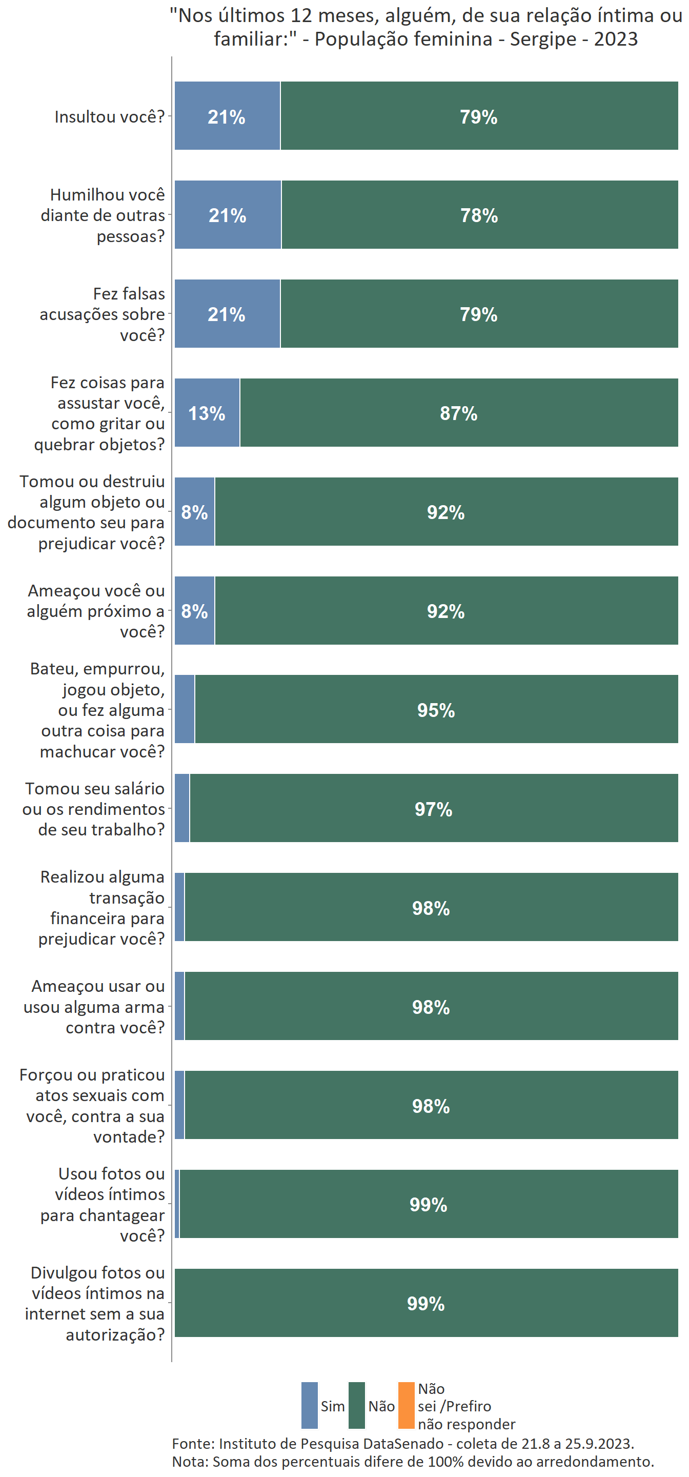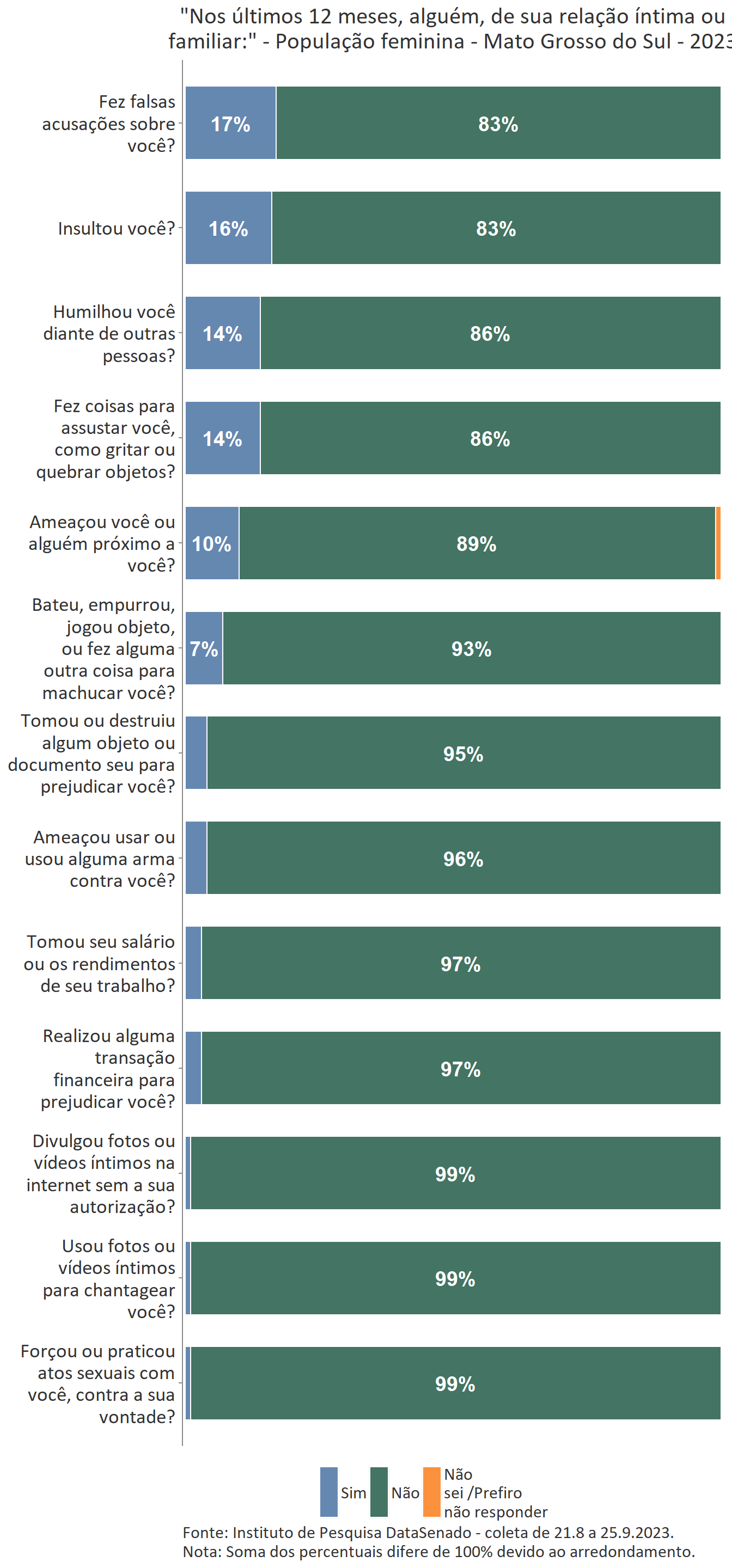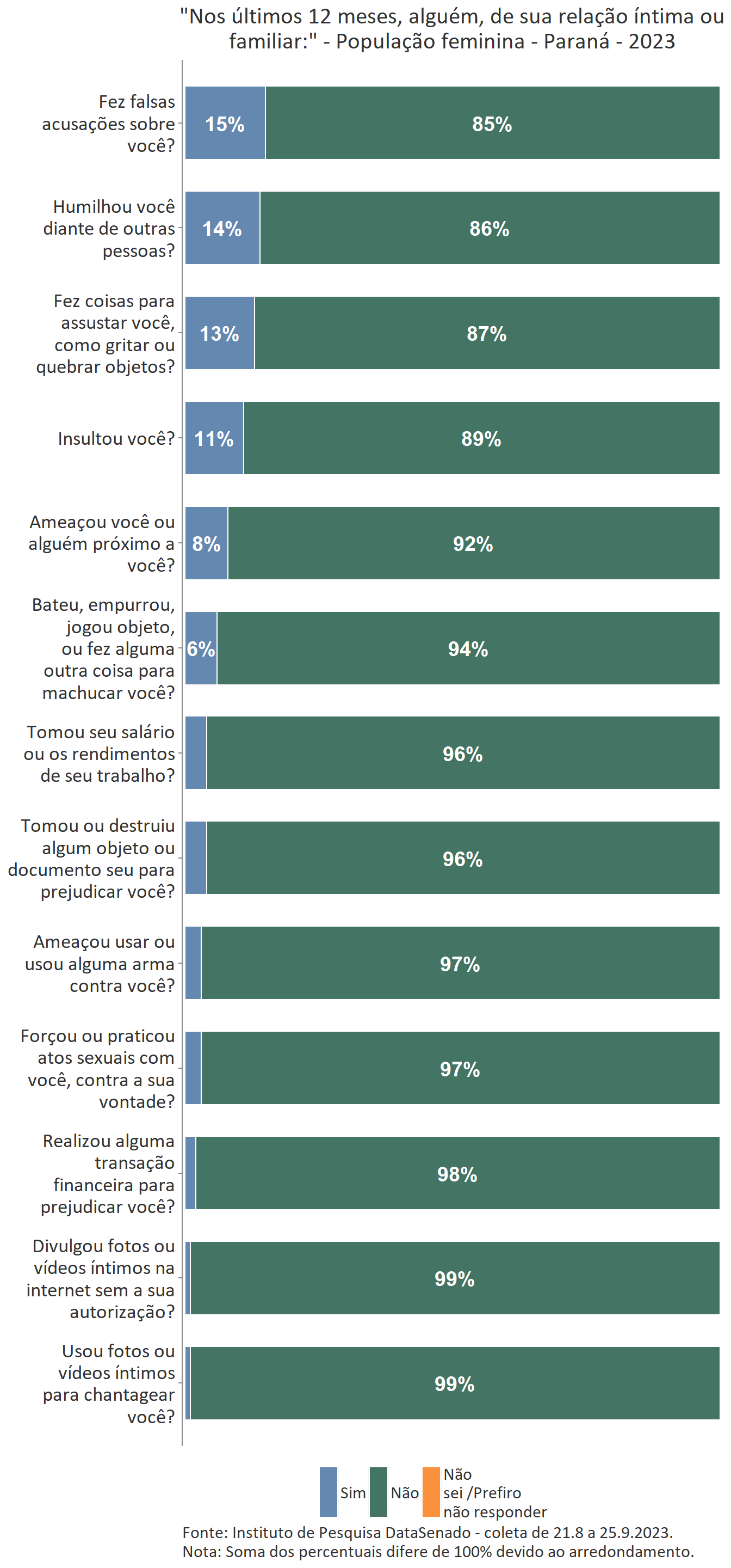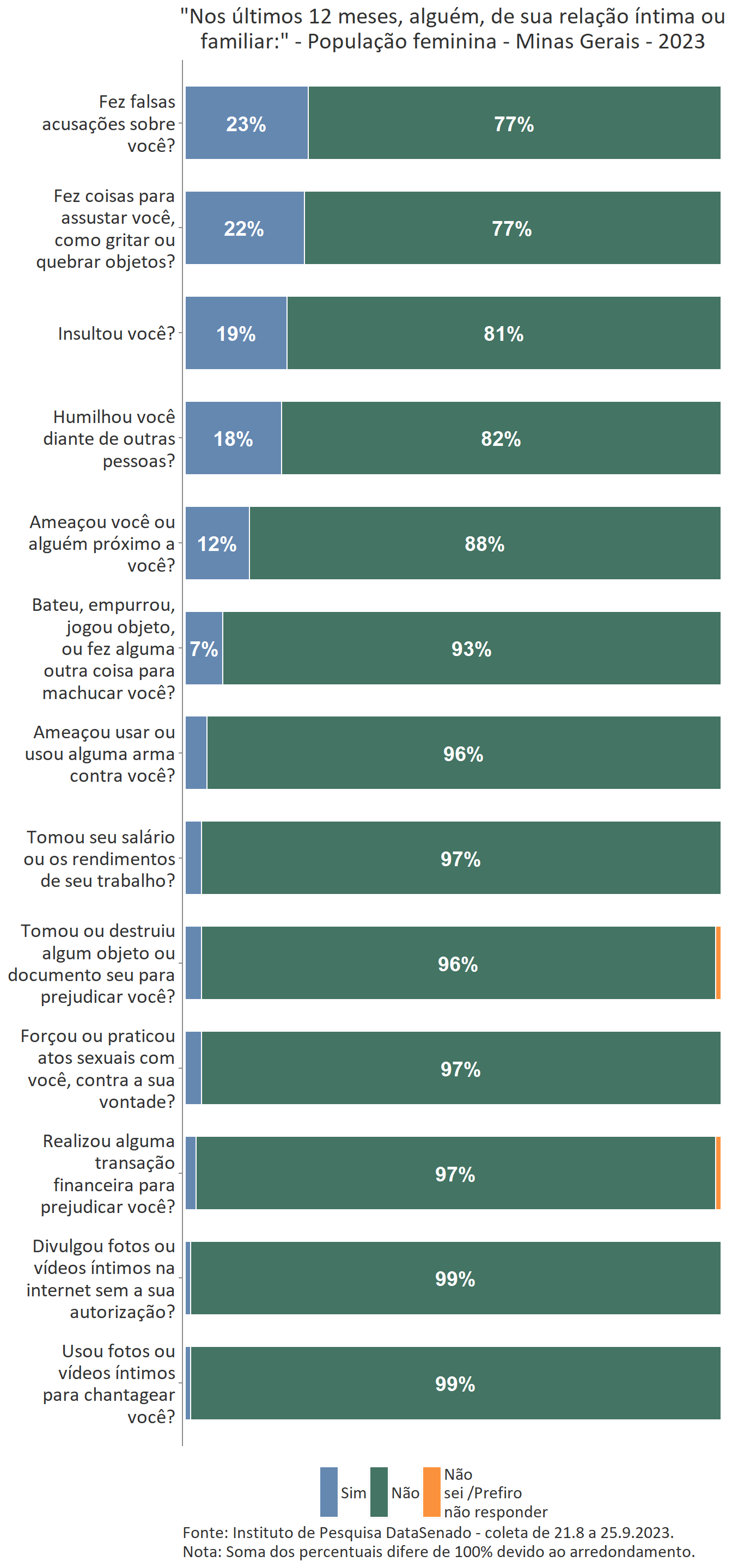 A pesquisa também buscou estudar agressões que, embora sofridas pelas mulheres, podem não ser prontamente reconhecidas como tais. Com esse objetivo, todas as entrevistadas, incluindo aquelas que não declararam ter sofrido violência doméstica ou familiar, foram apresentadas a uma lista de 13 situações de violência, como insultos e ameaças feitos por alguém de relação íntima ou familiar, e perguntadas se vivenciaram alguma delas nos últimos 12 meses.