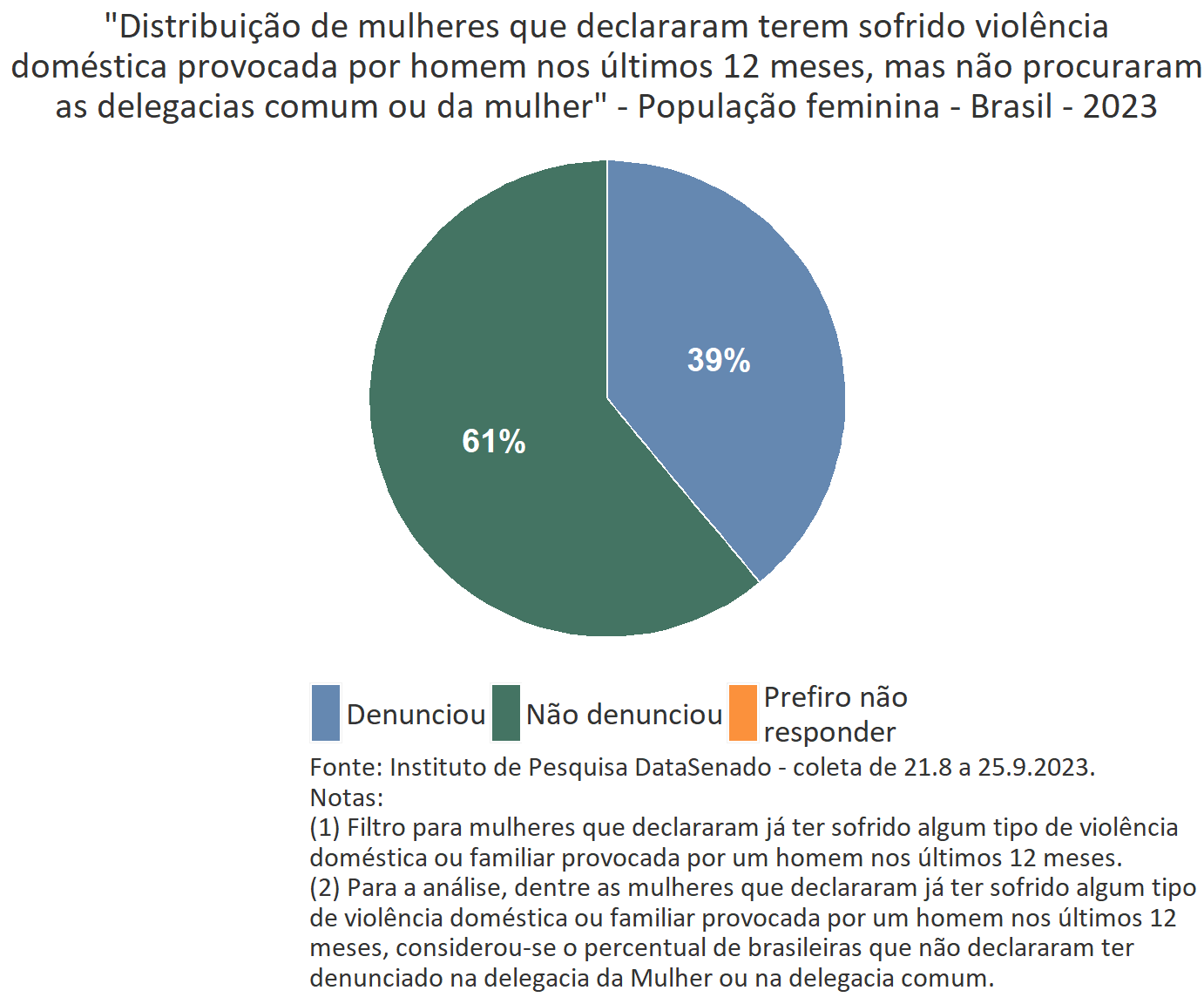 Para o cálculo da subnotificação policial, verificou-se quantas mulheres declararam já ter sofrido algum tipo de violência doméstica ou familiar provocada por um homem nos últimos 12 meses e quantificou-se, dentre essas, as que afirmaram ter denunciado e as que afirmaram não ter denunciado na delegacia da Mulher e/ou na delegacia comum. Nessa análise, percebe-se que 61% das brasileiras agredidas nos últimos 12 meses não notificaram a autoridade policial.