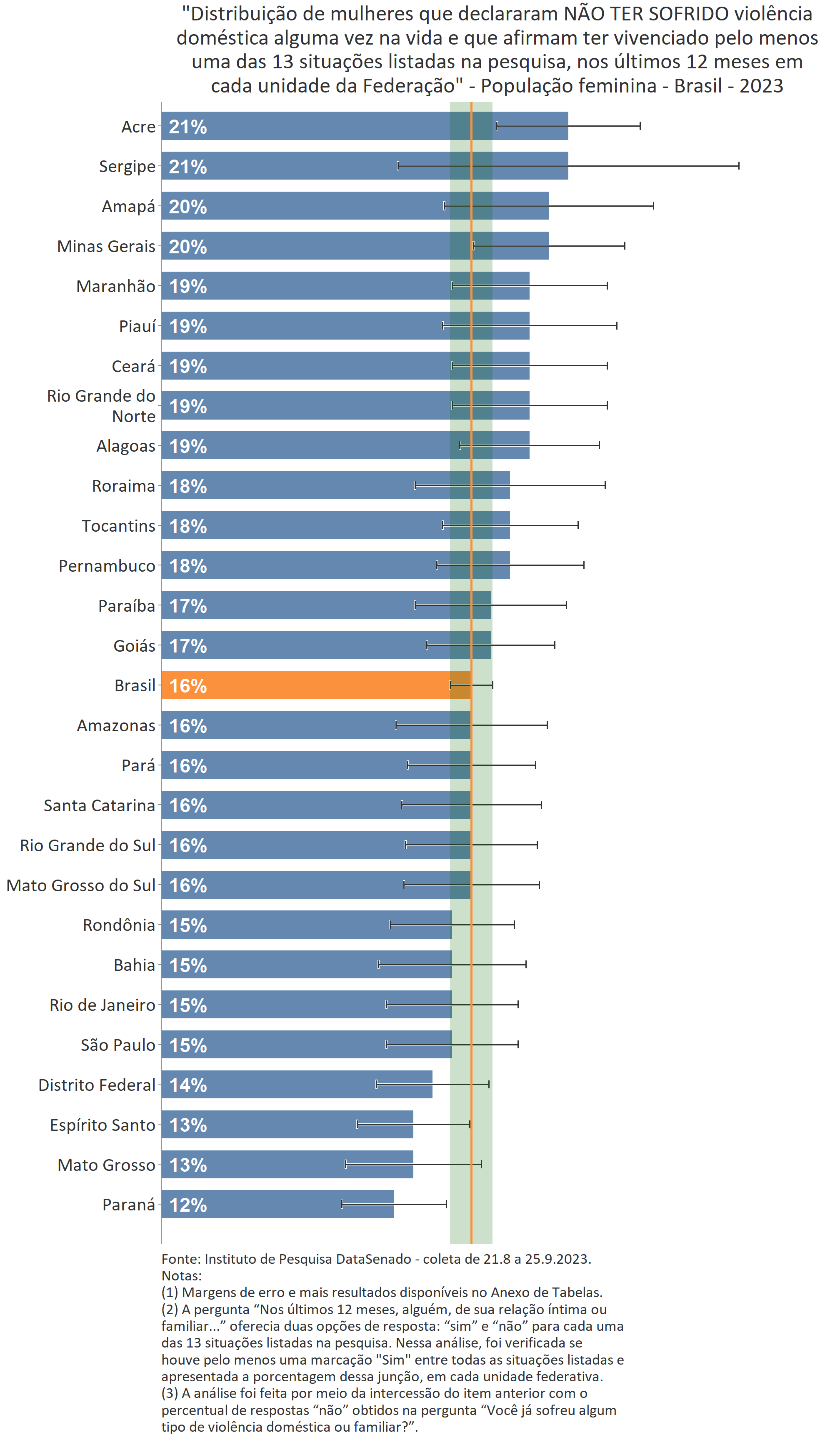 Ao se comparar os resultados nacionais com os estaduais, percebe-se que os valores encontrados para as mulheres que declararam não ter sofrido violência doméstica ou familiar em algum momento da vida, mas que afirmam ter vivenciado, nos últimos 12 meses, pelo menos uma das 13 situações listadas pela pesquisa são estatisticamente equivalentes em quase todos os estados e no Distrito Federal. As duas únicas exceções são o Paraná, em que há o menor índice (12%) e no Acre, onde há o maior índice (21%).