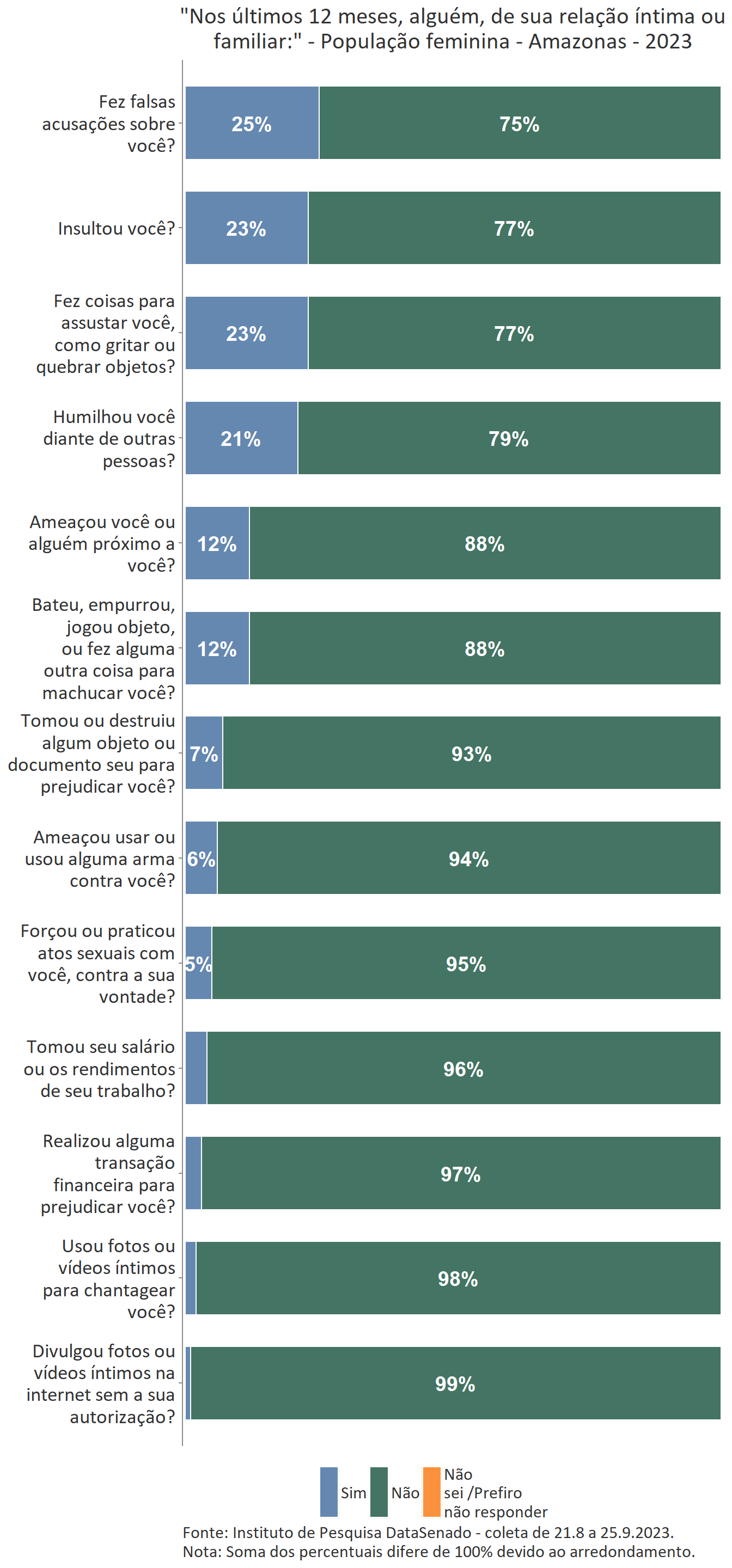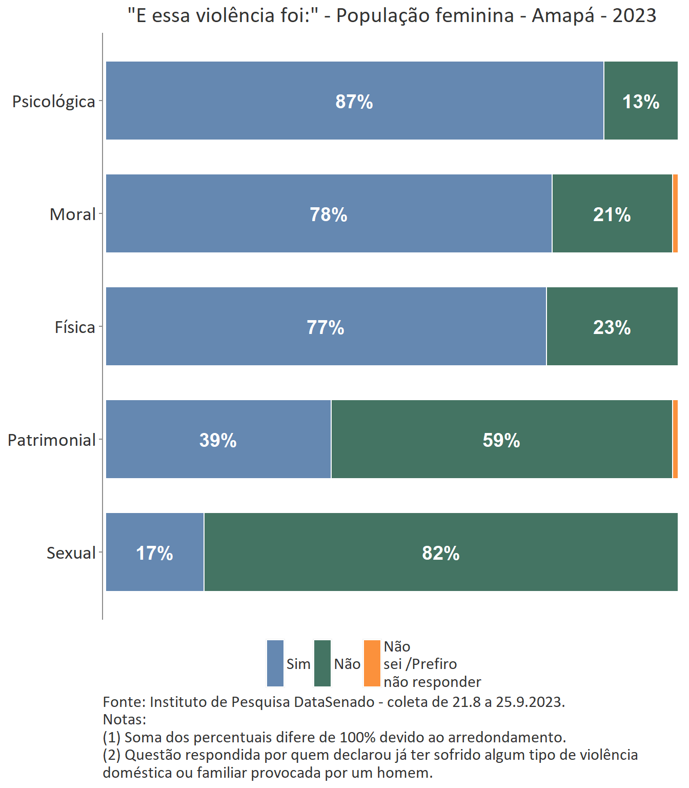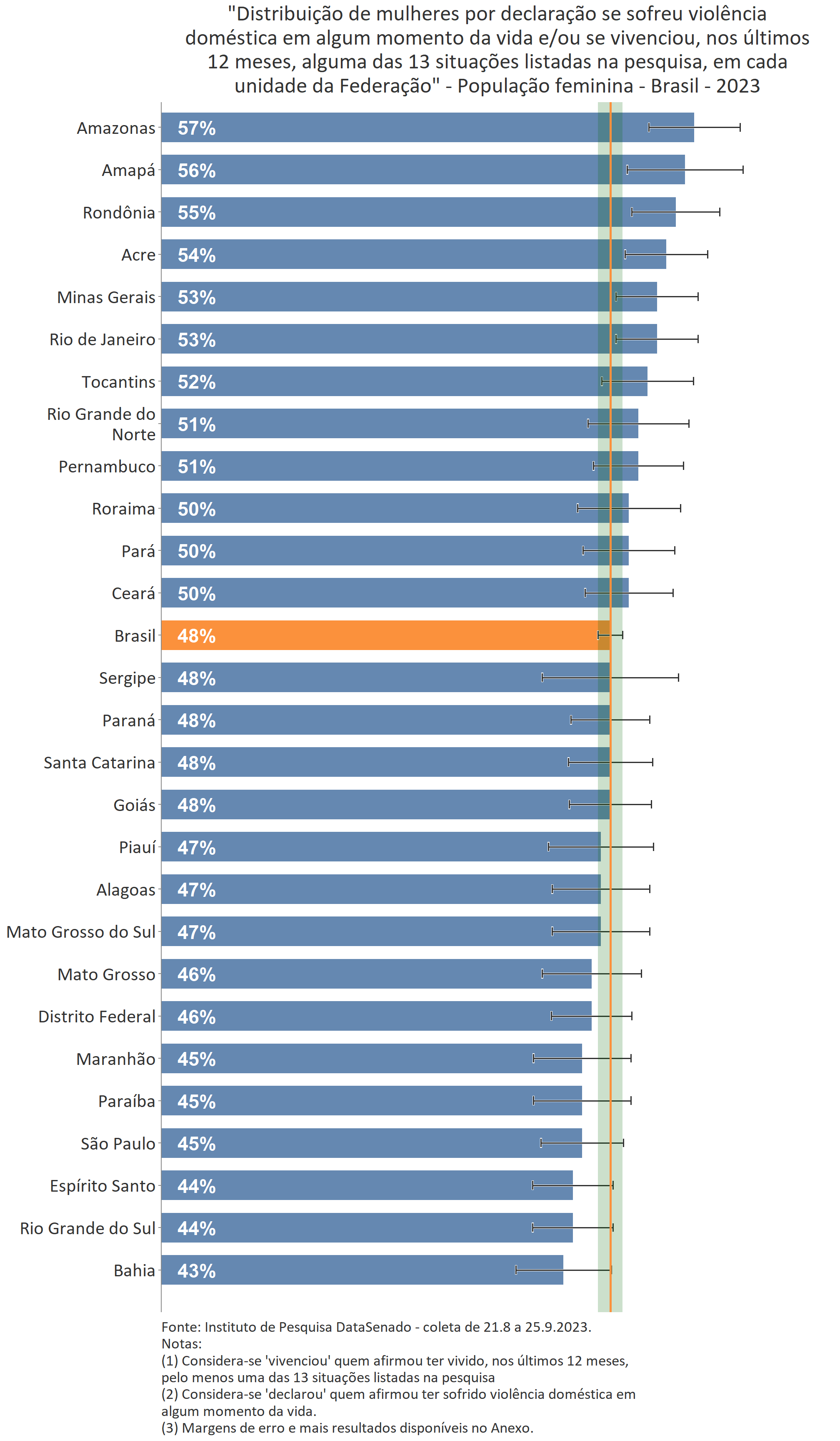 É importante notar que nos estados do Amazonas (57%), do Amapá (56%), de Rondônia (55%) e do Acre (54%), quando somadas as mulheres que declaram ter sofrido violência doméstica em algum momento da vida com as que, apesar de não declararem ter sofrido violência, afirmam ter vivenciado, nos últimos 12 meses, pelo menos uma das 13 situações listadas na pesquisa, encontram-se patamares ainda maiores que os nacionais.