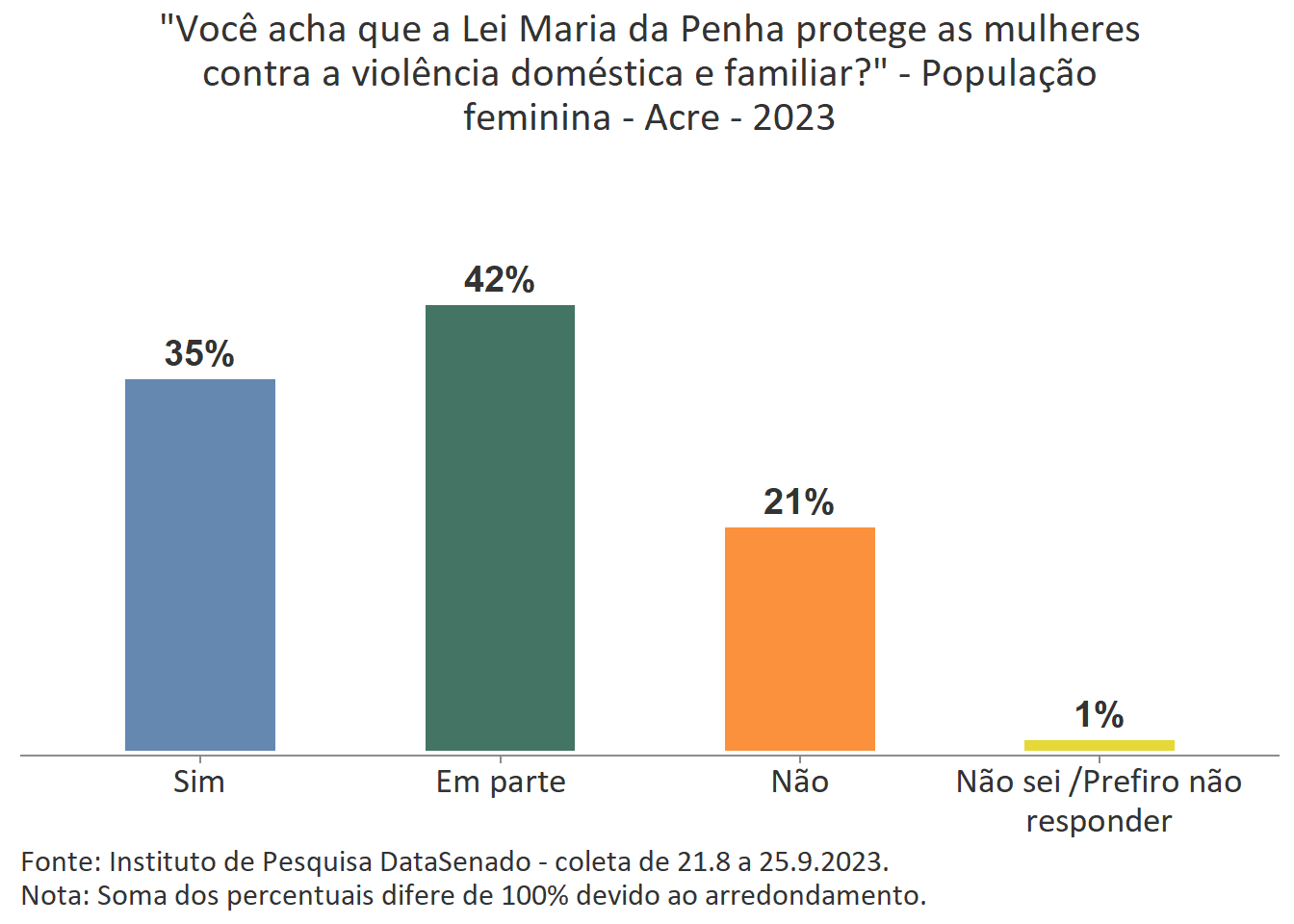 A pesquisa também investigou o grau de conhecimento e a percepção sobre os instrumentos de proteção às mulheres. O levantamento mostra que 68% das mulheres do Acre conhecem pouco sobre a Lei Maria da Penha e que na percepção de 42% delas a lei protege apenas em parte as mulheres contra a violência doméstica e familiar.