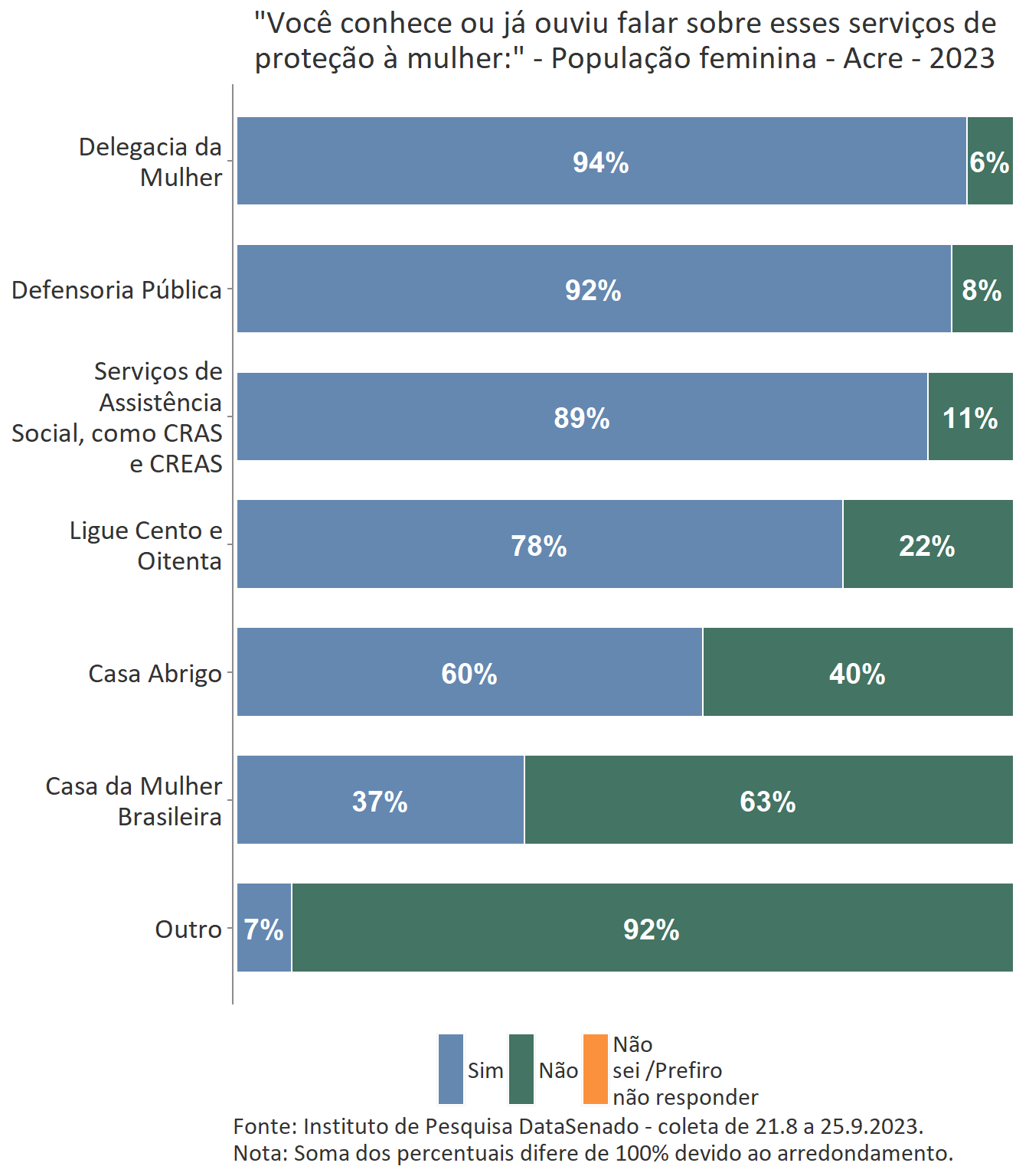 Entre as cidadãs acreanas, o serviço de proteção mais conhecido são os prestados pela delegacia da Mulher, conhecidos por 94% delas.