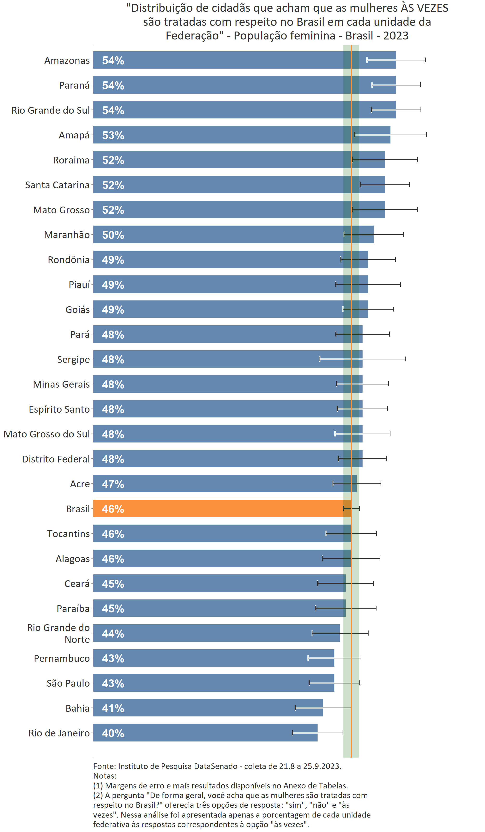 Alguns estados também se diferenciam em relação ao resultado nacional na percepção de que as mulheres são tratadas com respeito no Brasil apenas às vezes. Enquanto o patamar nacional é de 46%, ele é superior nos estados do Amazonas, Paraná e Rio Grande do Sul (54%) e inferior no Rio de Janeiro (40%).
