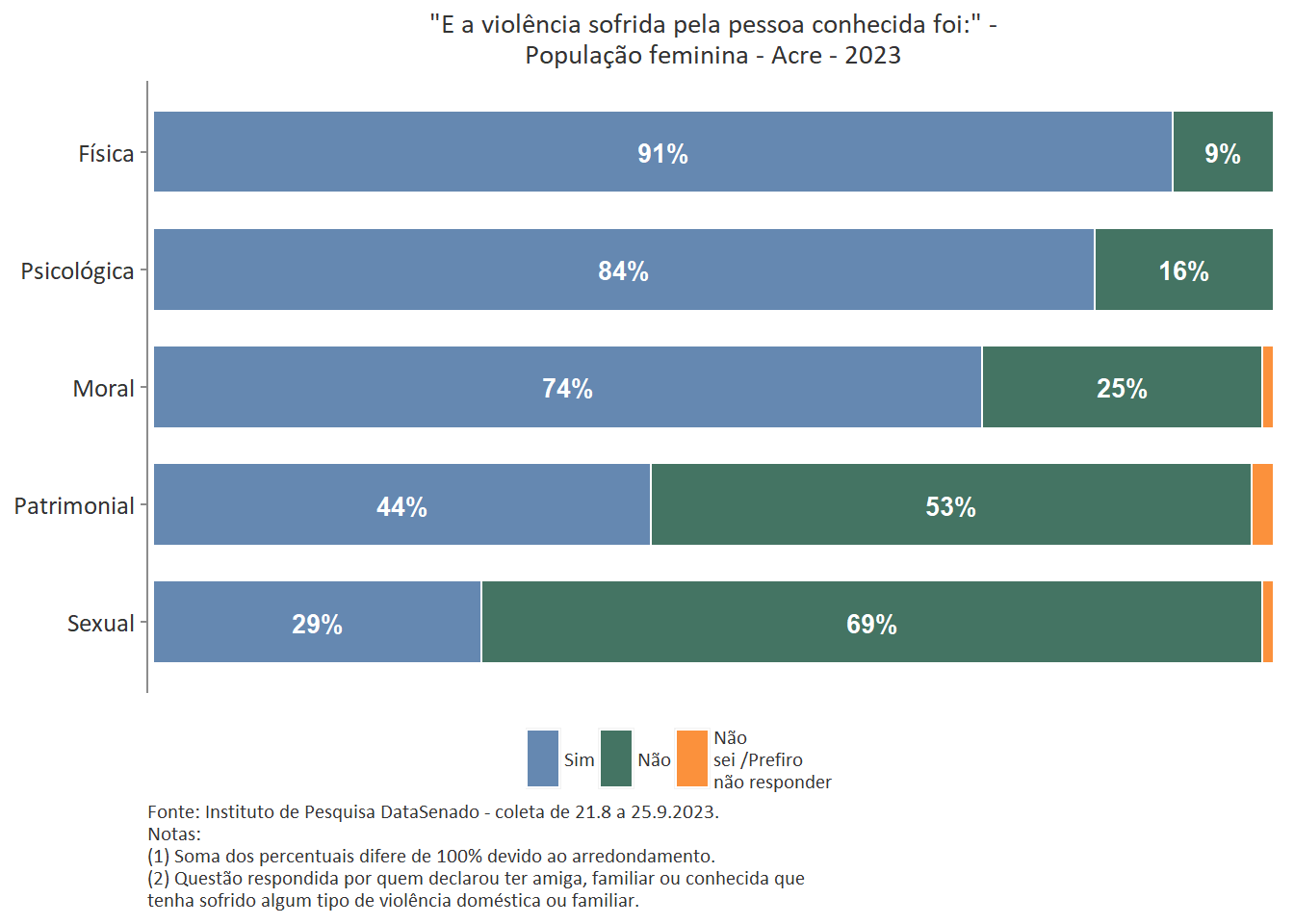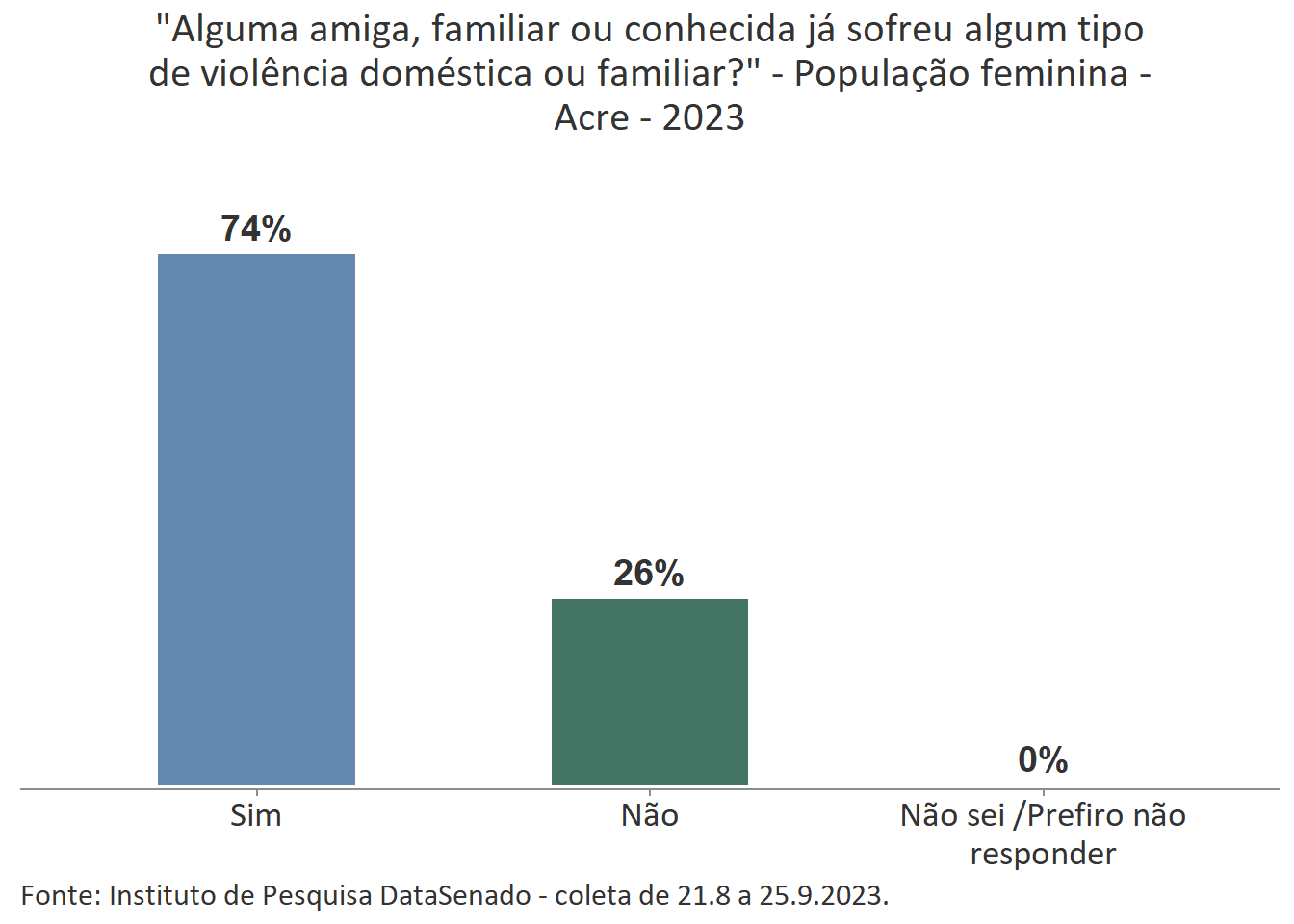 Entre as mulheres do Acre, 74% afirmam que uma amiga, familiar ou conhecida já sofreu algum tipo de violência doméstica ou familiar.