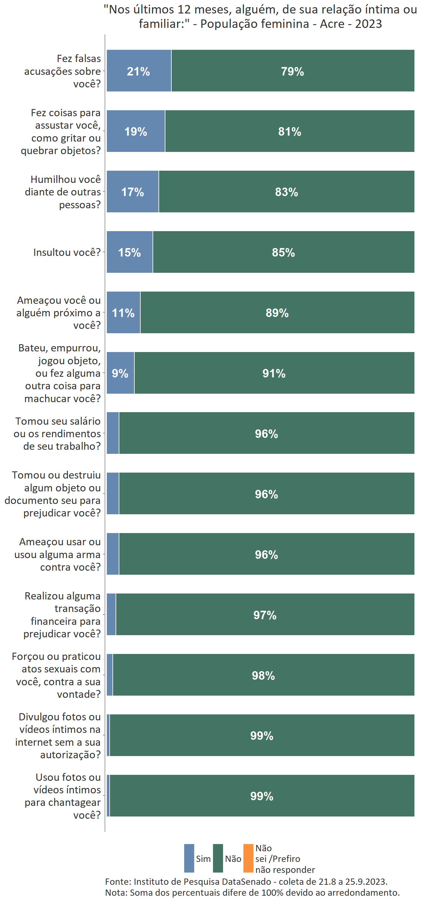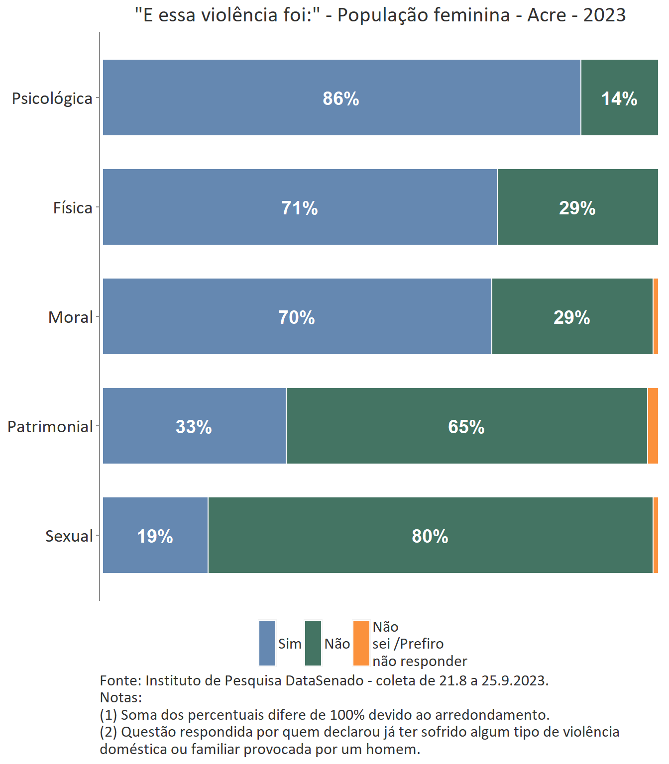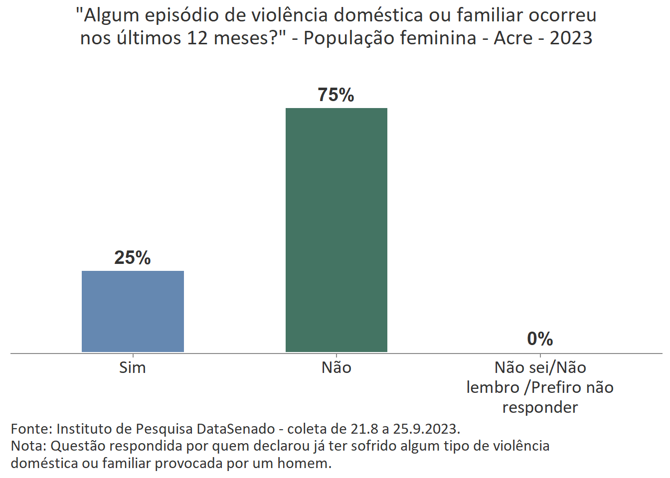 A pesquisa mostra que 32% das mulheres do Acre declararam ter sofrido violência doméstica ou familiar provocada por um homem, sendo que 25% delas afirmam que algum episódio de violência ocorreu nos últimos 12 meses.