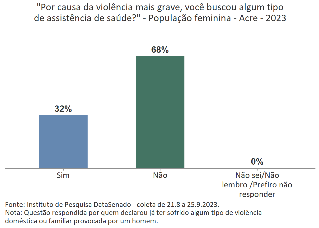 Entre as mulheres agredidas do Acre, 32% buscaram algum tipo de assistência à saúde e 80% afirmam não conviver mais com a pessoa que as agrediu.