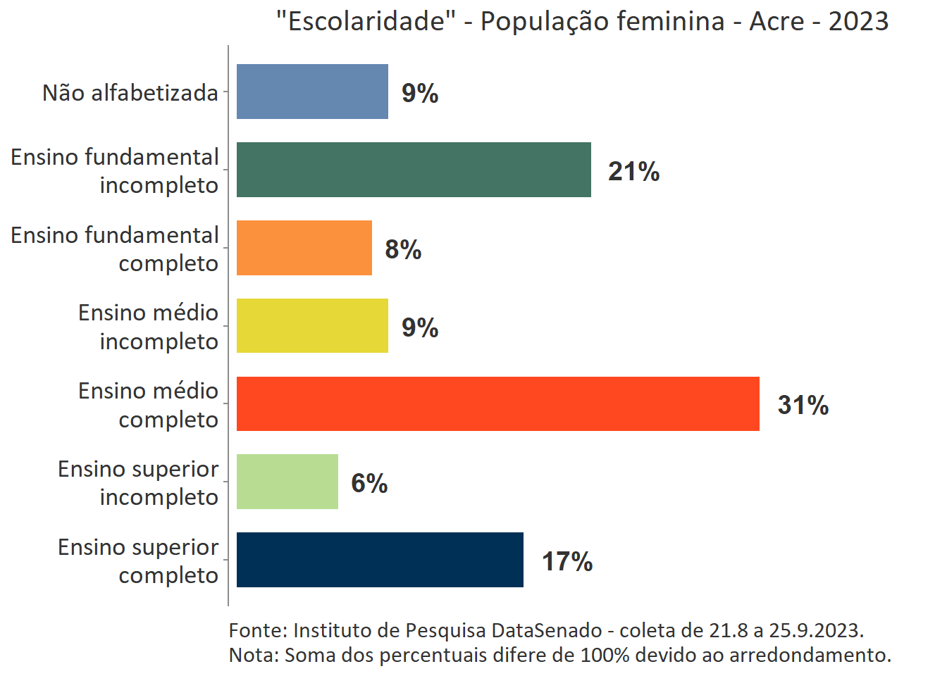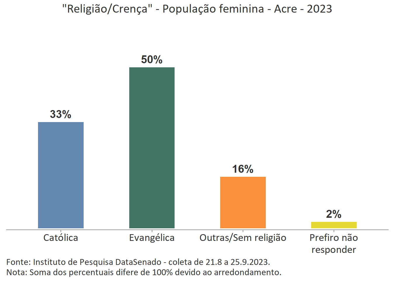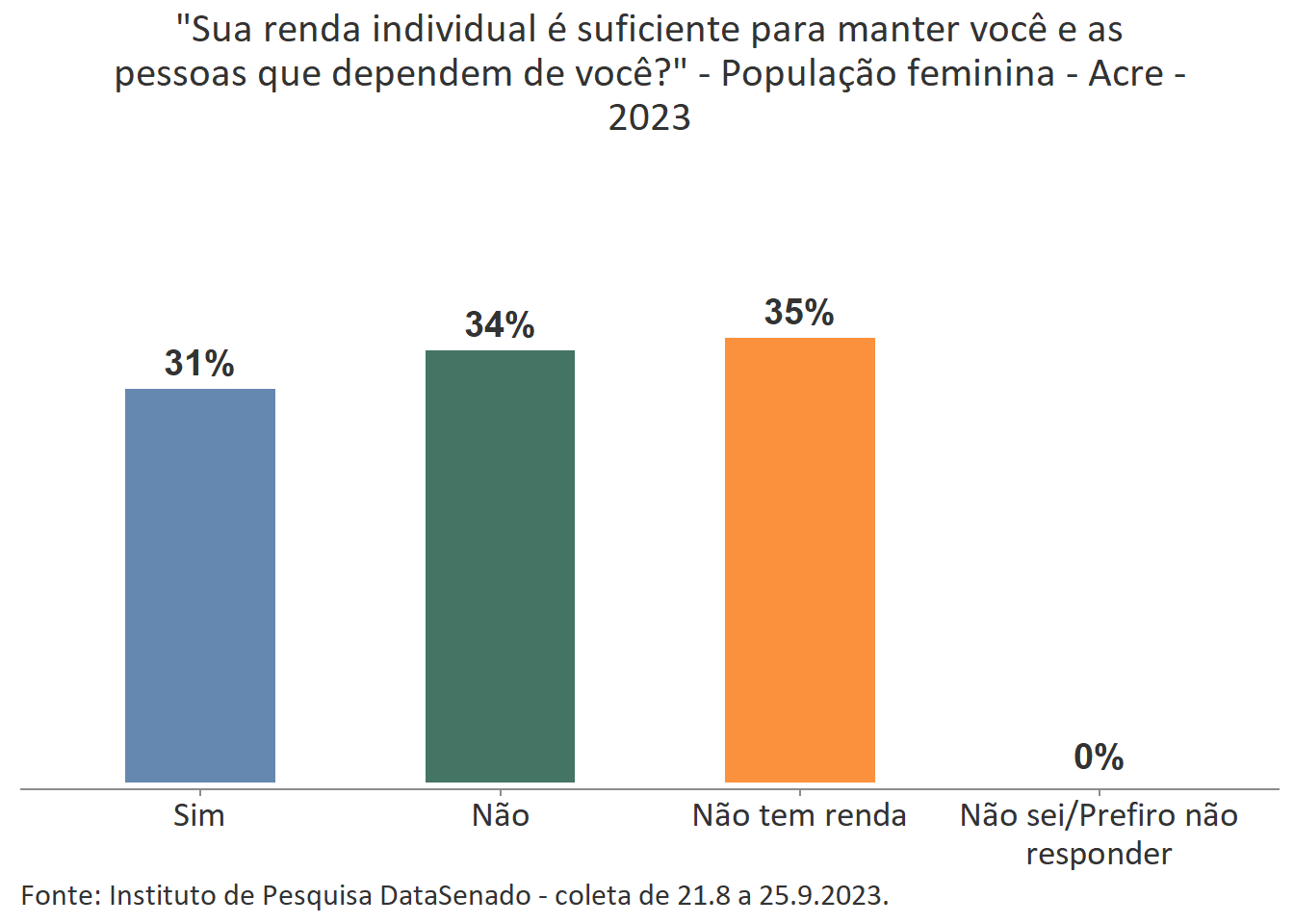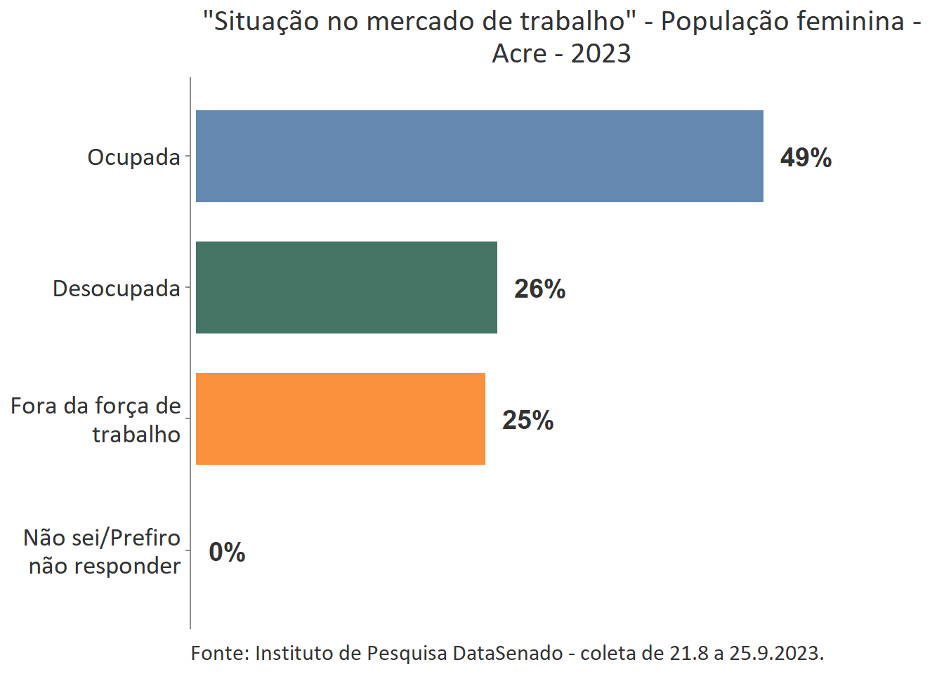 Pesquisa nacional realizada em 2023 pelo Instituto de Pesquisa DataSenado mostra que 47% das cidadãs do Acre consideram que as mulheres às vezes são tratadas com respeito no Brasil.