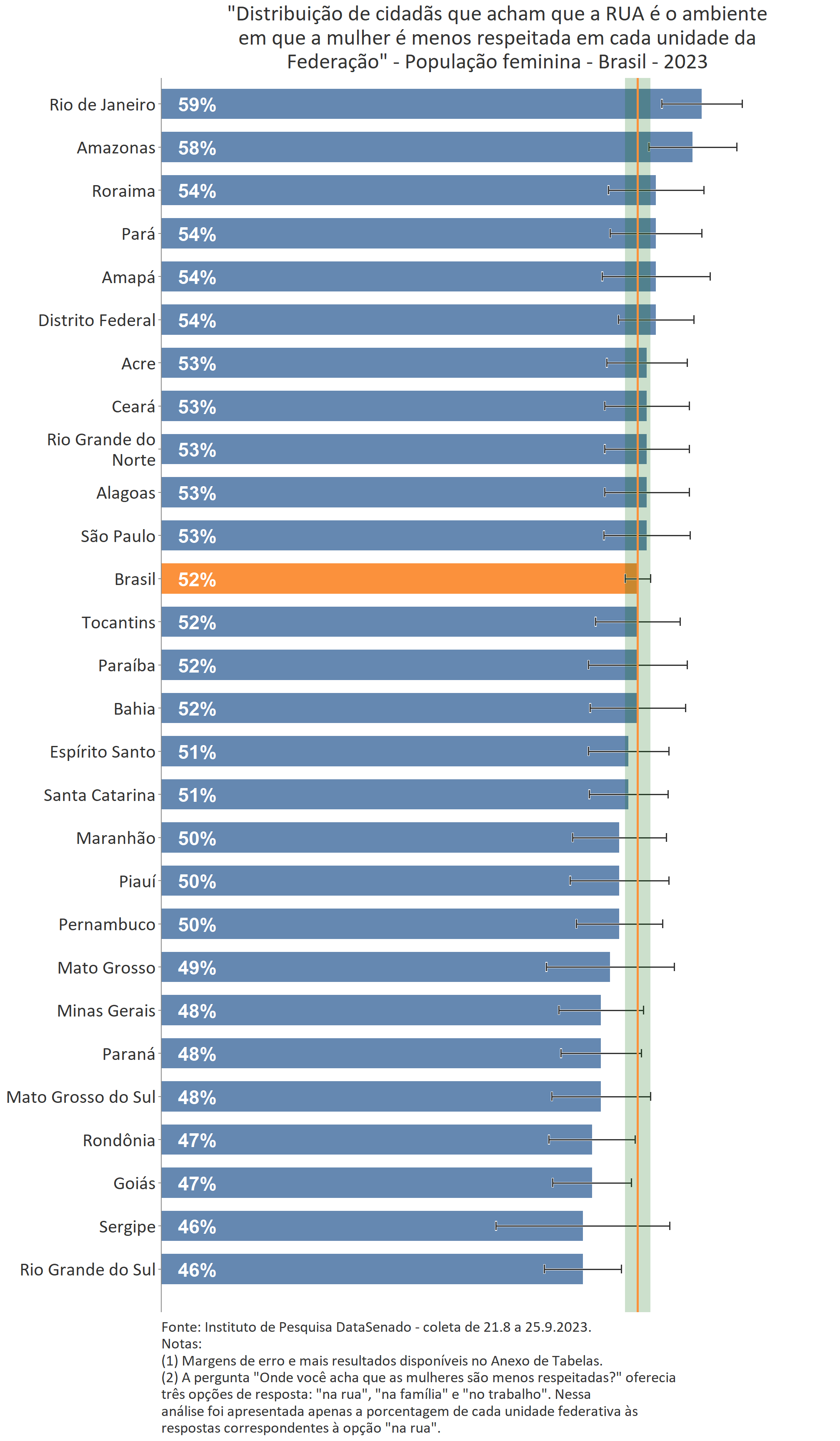 Mais da metade das brasileiras (52%) apontam a rua como o lugar em que as mulheres são menos respeitadas. No estado do Rio de Janeiro esse patamar é ainda maior, chegando a 59%. Já no Rio Grande do Sul esse índice cai para 46%. Entre as demais unidades da Federação essa percepção é compartilhada de maneira estatisticamente uniforme.