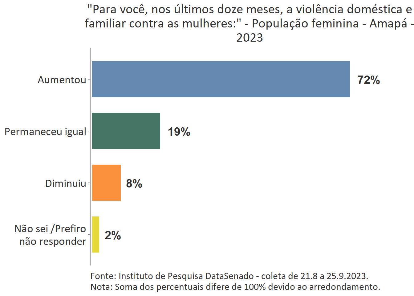 De forma geral, as amapaenses consideram o Brasil um país muito machista (61%) e que nos últimos 12 meses a violência doméstica aumentou (72%).
