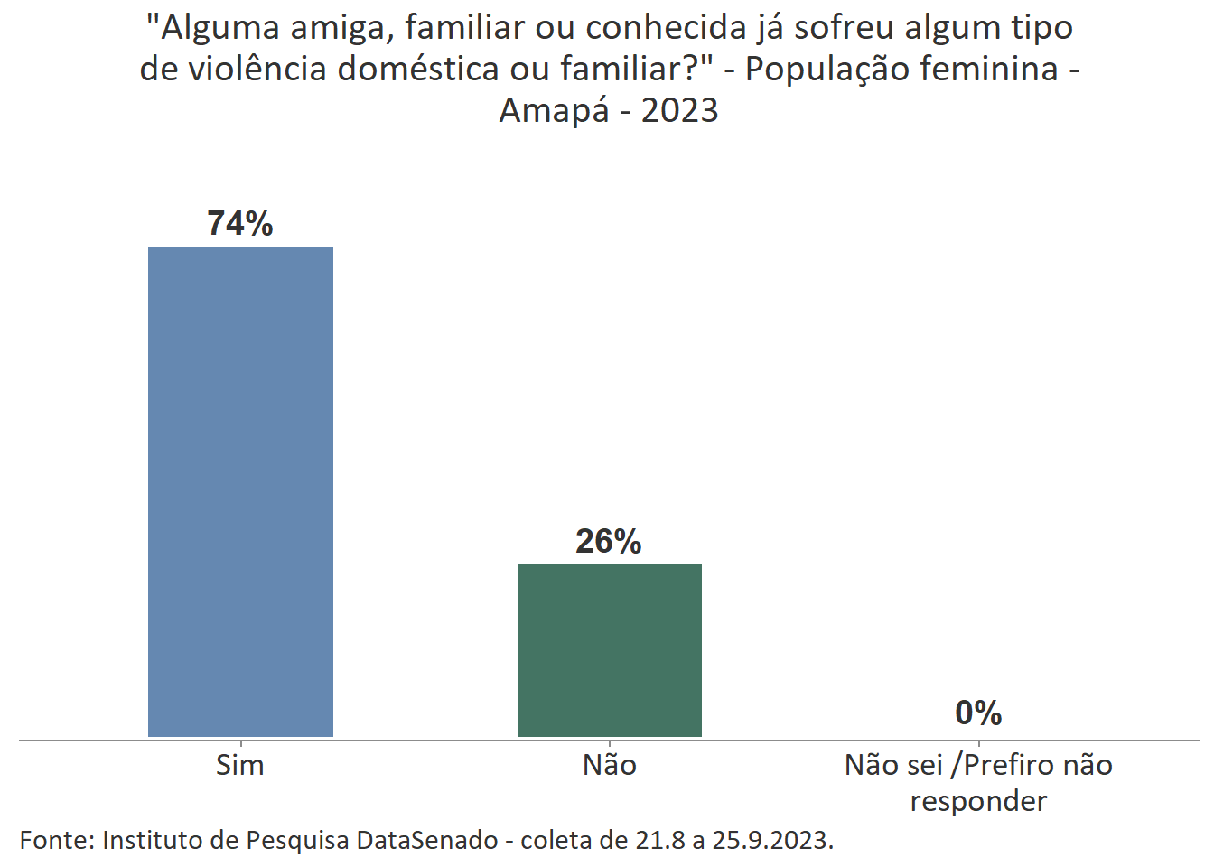 Entre as mulheres do Amapá, 74% afirmam que uma amiga, familiar ou conhecida já sofreu algum tipo de violência doméstica ou familiar.