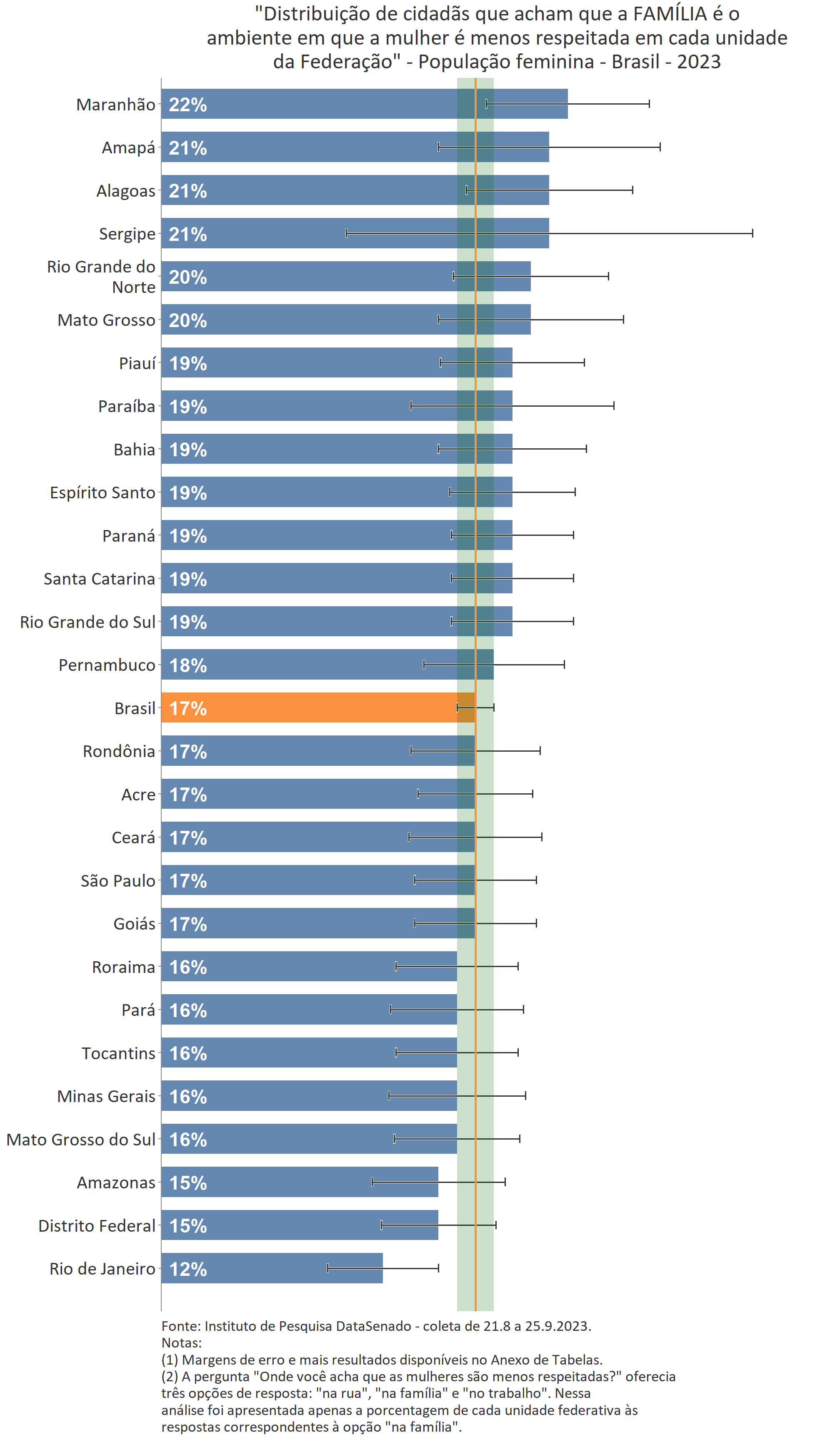 Conforme apresentado no relatório nacional, para 17% das brasileiras, a família é o ambiente em que a mulher é menos respeitada, e para outros 25%, o trabalho. Na análise dos dados regionais, não se percebe diferenças estatisticamente relevantes entre as unidades federativas, exceto no estado do Rio de Janeiro, em que 12% das fluminenses consideram a família como sendo o ambiente em que a mulher é menos respeitada, patamar inferior ao nacional.