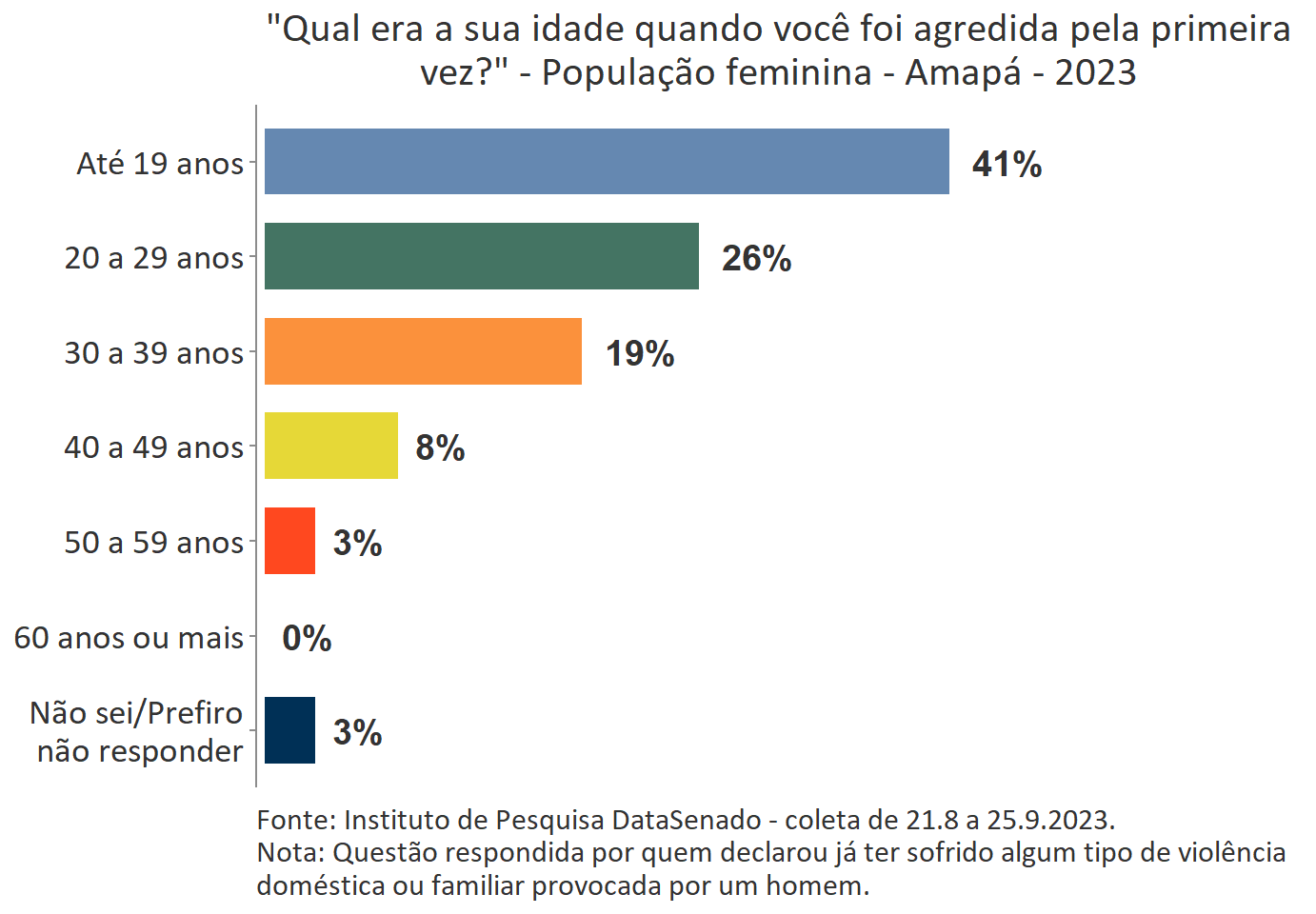 O levantamento mostra também que boa parte das vítimas do estado do Amapá, a exemplo do que ocorre no Brasil, vivencia a primeira agressão ainda muito jovem. Para 41%, a primeira ocorrência se deu quando tinham até 19 anos de idade.