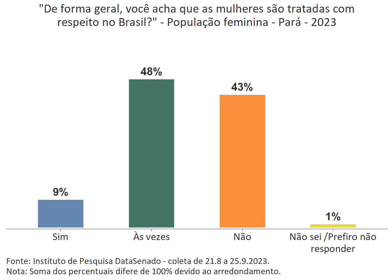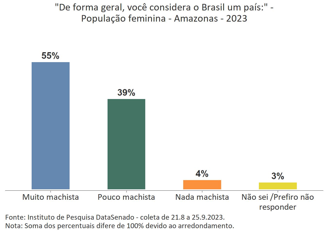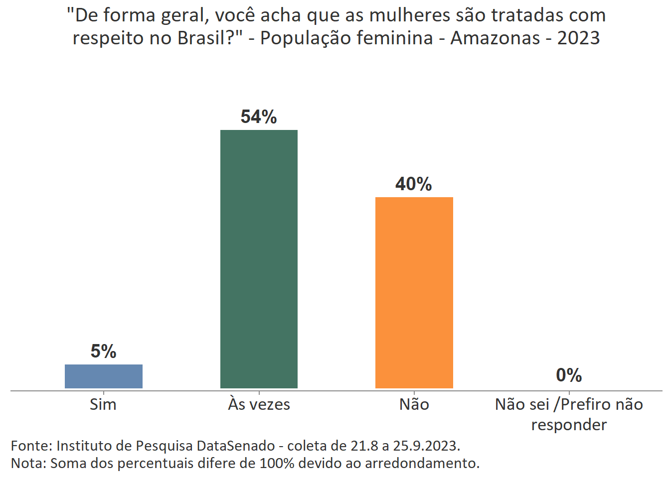 Pesquisa nacional realizada em 2023 pelo Instituto de Pesquisa DataSenado mostra que 54% das cidadãs do Amazonas consideram que as mulheres às vezes são tratadas com respeito no Brasil.