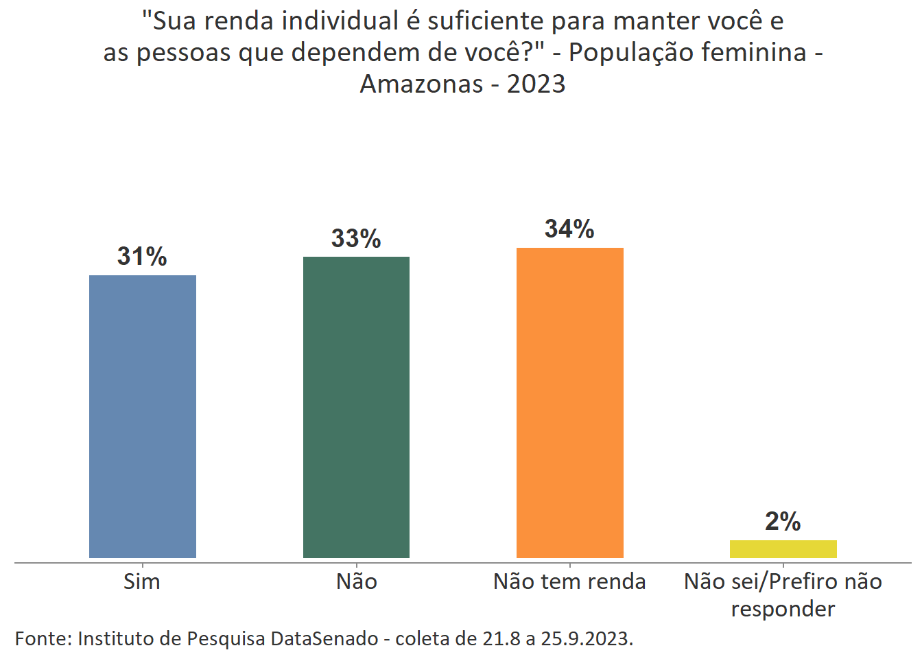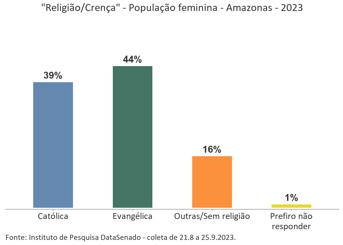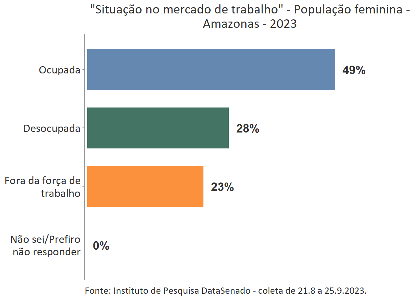 Pesquisa nacional realizada em 2023 pelo Instituto de Pesquisa DataSenado mostra que 54% das cidadãs do Amazonas consideram que as mulheres às vezes são tratadas com respeito no Brasil.