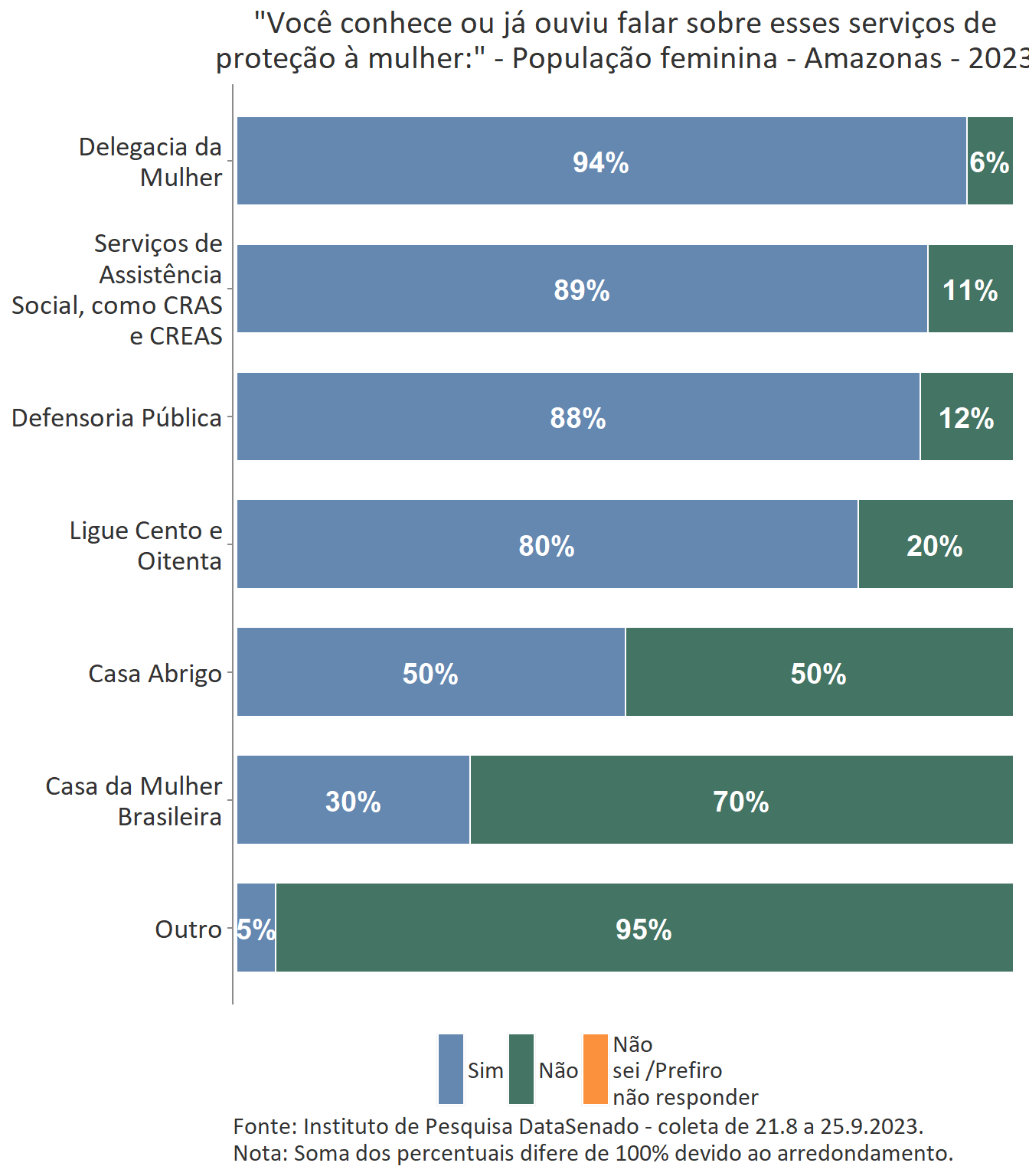 Entre as cidadãs amazonenses, o serviço de proteção mais conhecido são os prestados pela delegacia da Mulher, conhecidos por 94% delas.