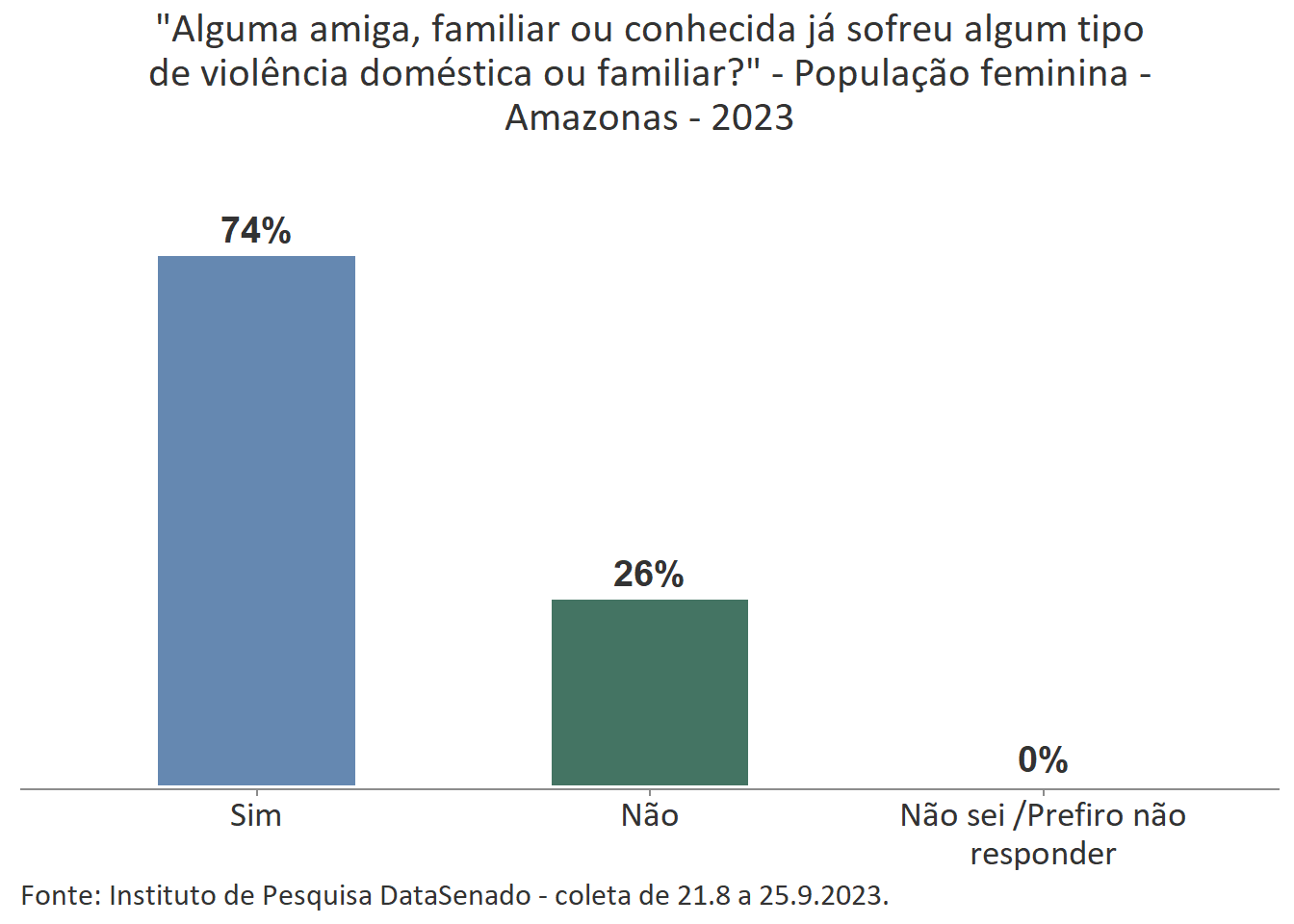Entre as mulheres do Amazonas, 74% afirmam que uma amiga, familiar ou conhecida já sofreu algum tipo de violência doméstica ou familiar.