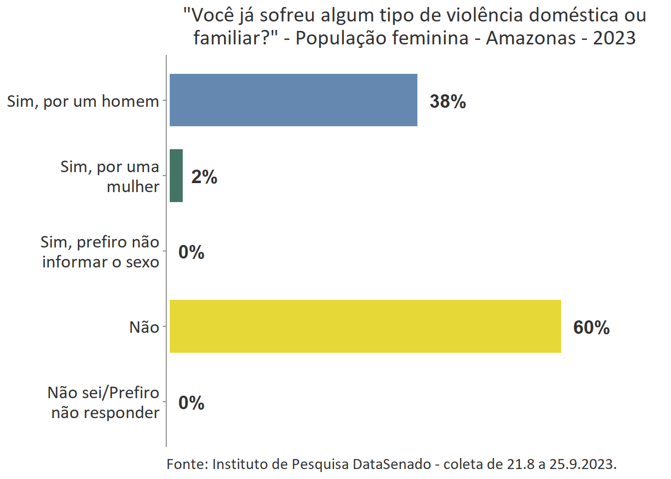 A 10ª edição da Pesquisa Nacional de Violência contra a Mulher mostra que 38% das mulheres do Amazonas já sofreram algum tipo de violência doméstica ou familiar provocada por um homem. Patamar superior ao encontrado na pesquisa nacional (30%), mesmo considerando as margens de erro.