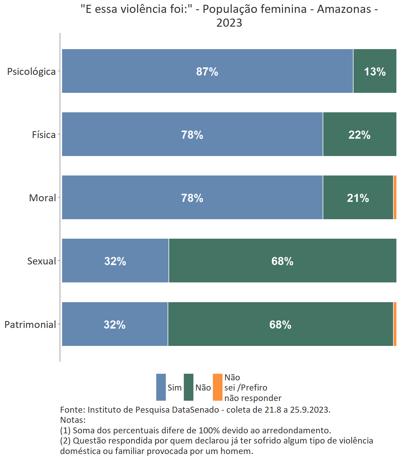 Em relação ao tipo de violência sofrida, a mais recorrente é a violência psicológica, declarada por 87% das mulheres do Amazonas que sofreram violência doméstica ou familiar provocada por homem, seguida pelas violências moral (78%) e física (78%).