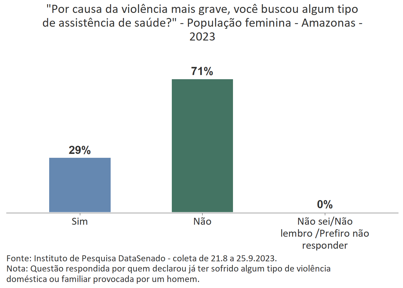 Entre as mulheres agredidas do Amazonas, 29% buscaram algum tipo de assistência à saúde e 83% afirmam não conviver mais com a pessoa que as agrediu.