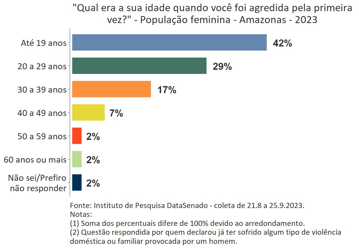 O levantamento mostra que boa parte das vítimas do Amazonas, a exemplo do que ocorre no Brasil, vivencia a primeira agressão ainda muito jovem. Para 42%, a primeira ocorrência se deu quando tinham até 19 anos de idade.