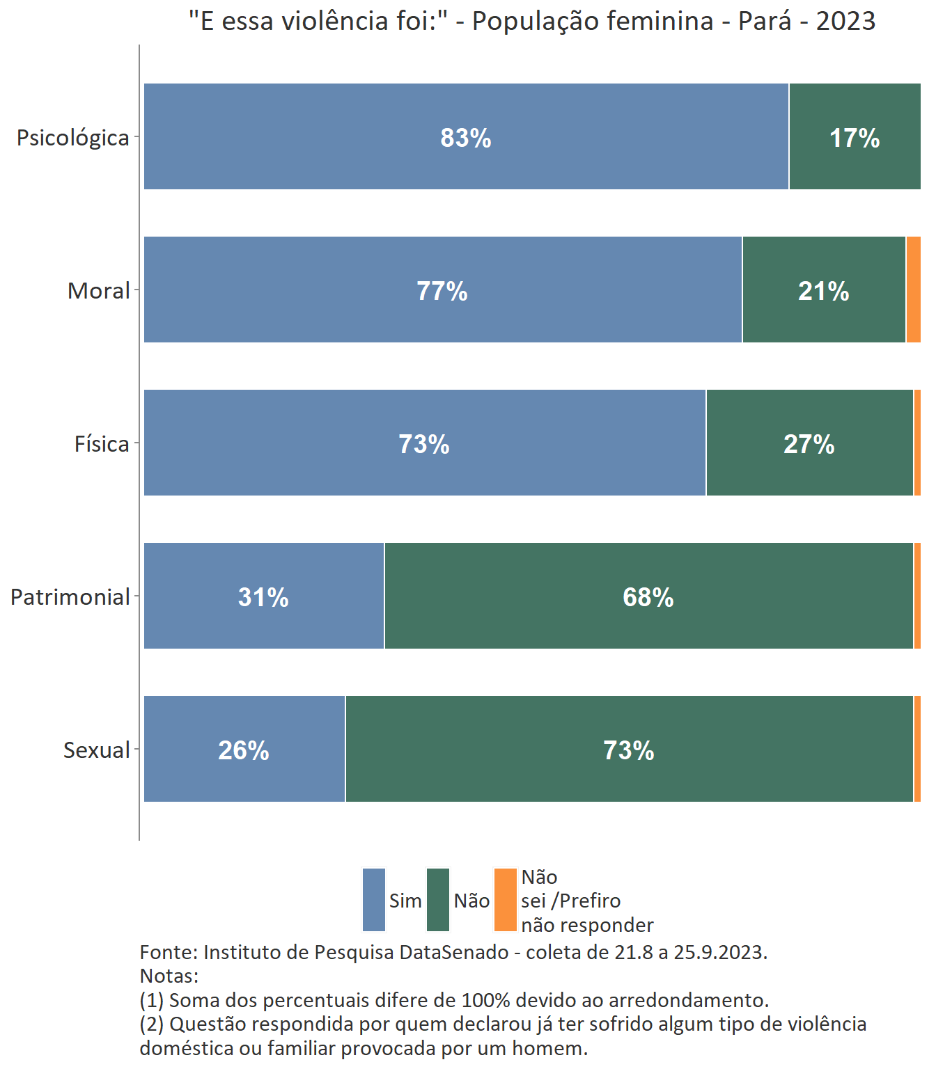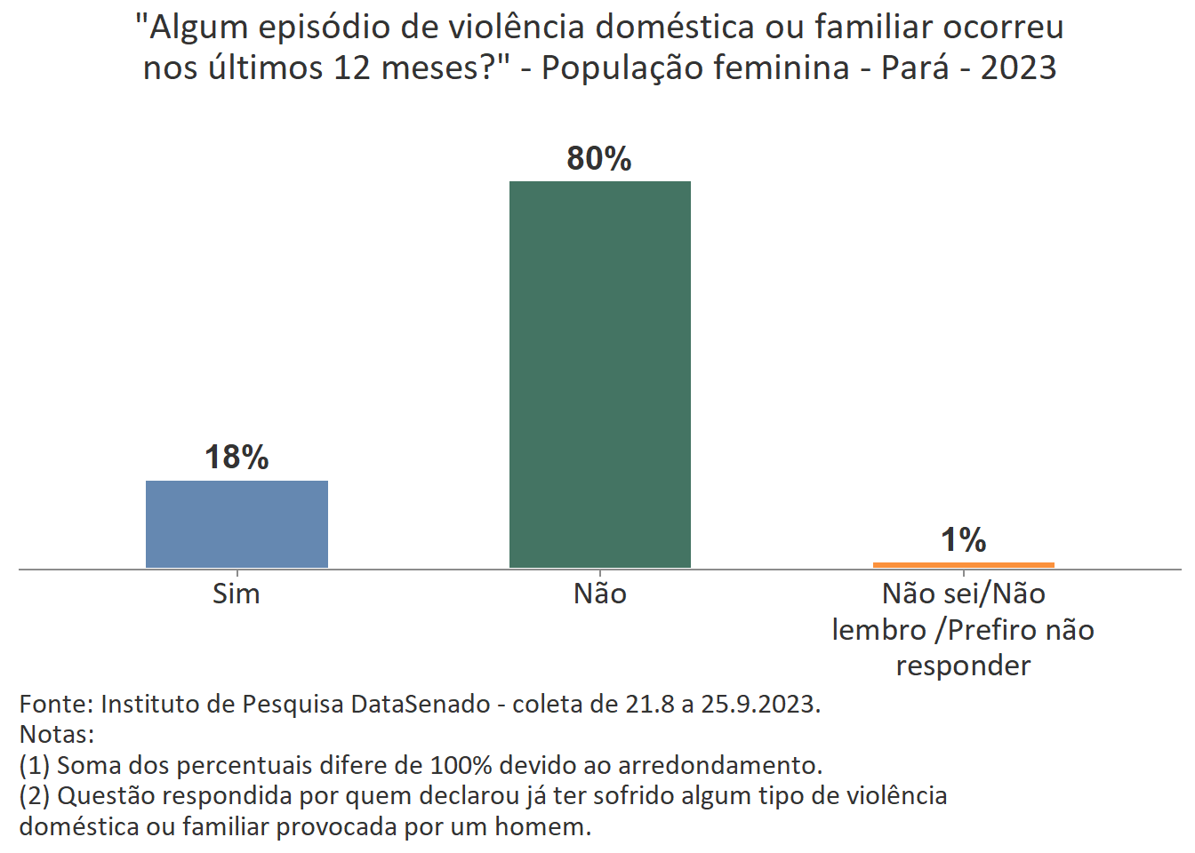 A 10ª edição da Pesquisa Nacional de Violência contra a Mulher mostra que 32% das mulheres do Pará já sofreram algum tipo de violência doméstica ou familiar provocada por um homem. Dentre elas, 18% sofreram violência nos últimos 12 meses. Esses índices são estatisticamente equivalentes aos encontrados na pesquisa nacional, considerando as margens de erro.