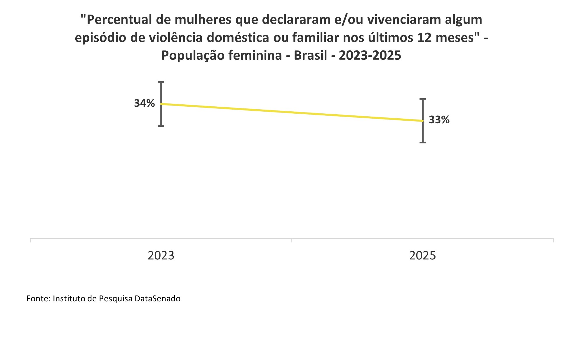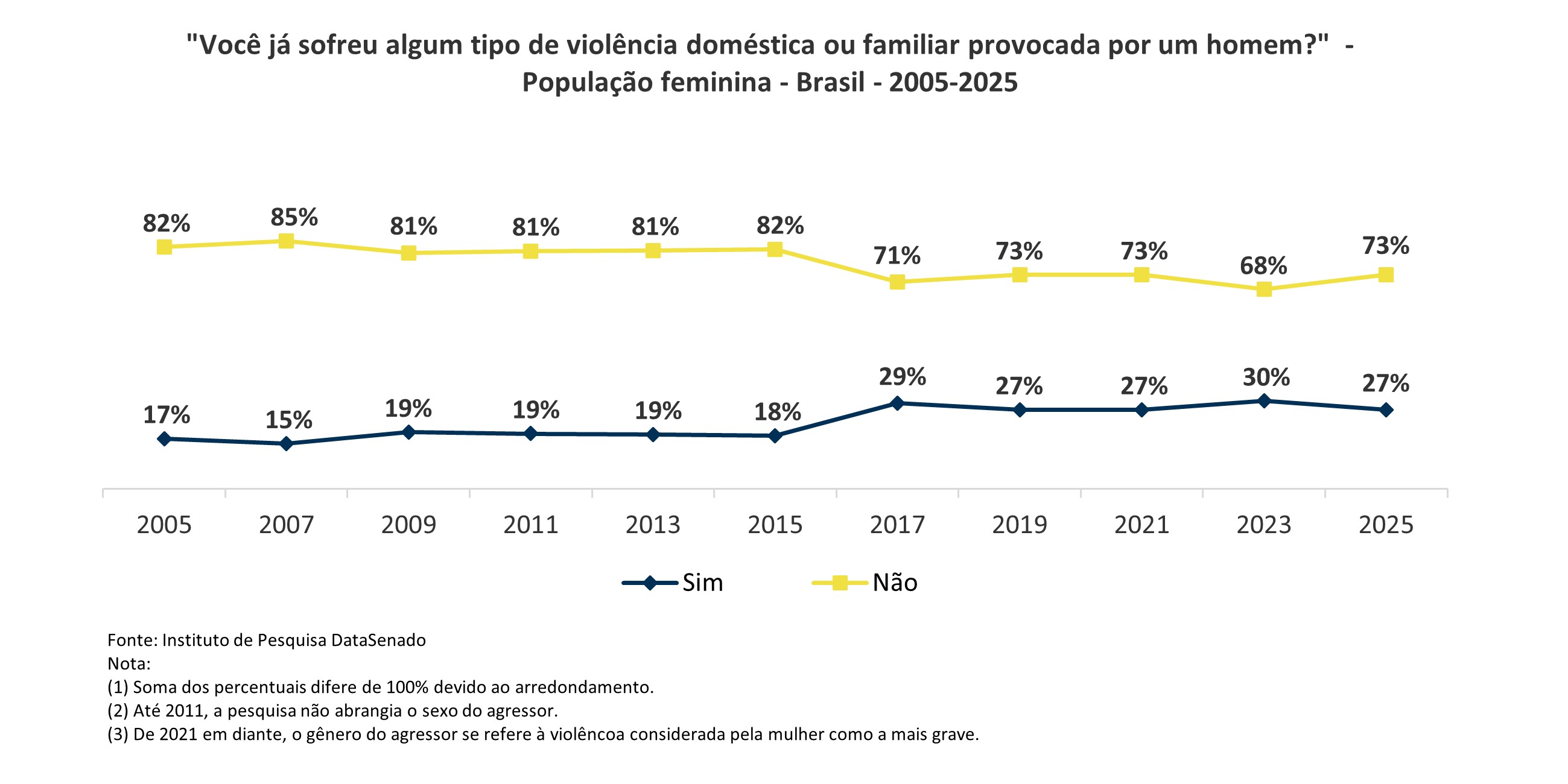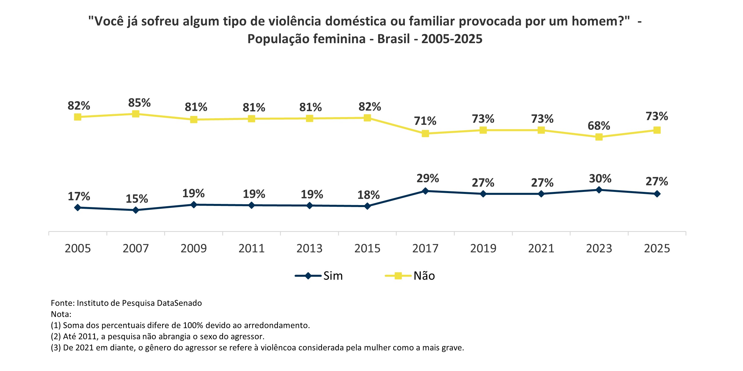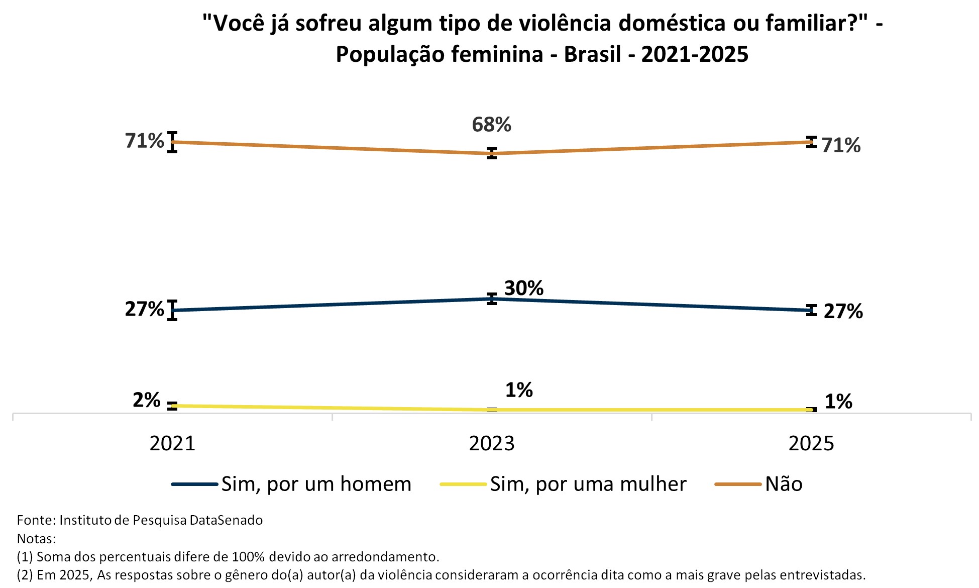 Em relação à violência declarada em algum momento da vida, estima-se que, em 2025, 27% das brasileiras já tenham passado por essa agressão. Esse percentual teve redução significativa quando comparado aos resultados de 2023, e agora retorna ao patamar observado em 2021.