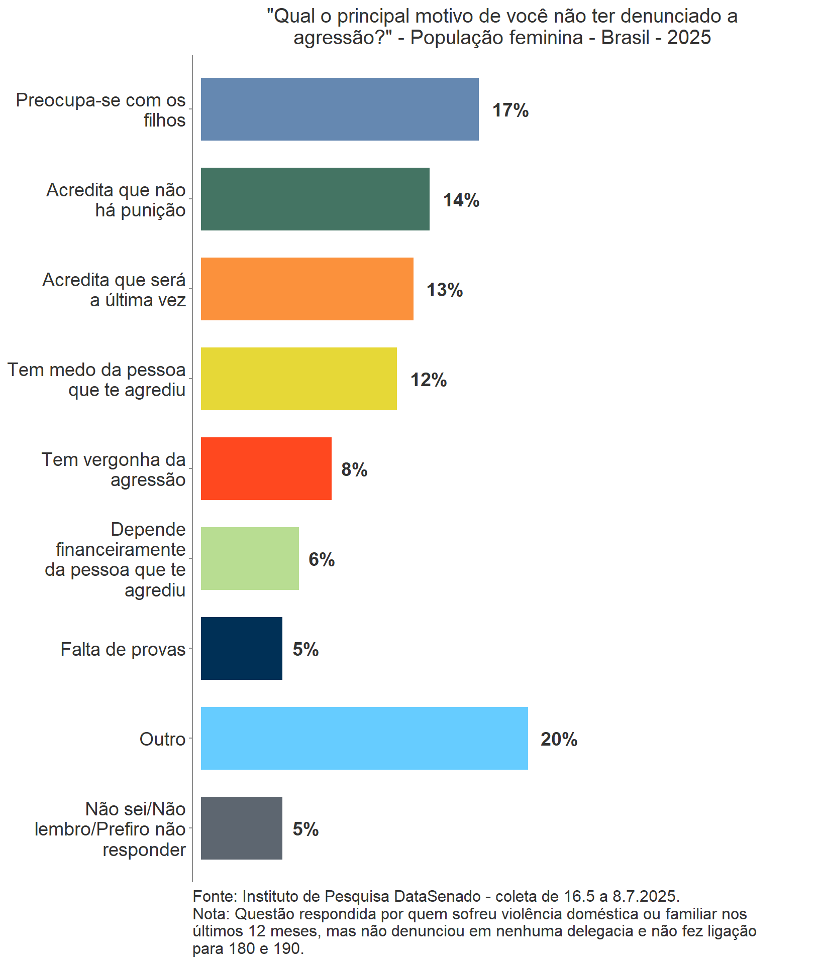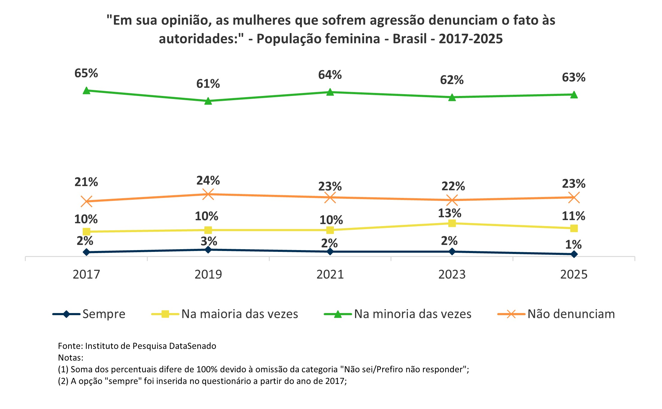 Quanto à percepção sobre as denúncias da violência às autoridades, a opinião das mulheres permanece estatisticamente igual desde 2017: elas acreditam que as mulheres que sofrem agressão denunciam na minoria das vezes. Além disso, nota-se redução de 15% para 12% na opinião que mulheres sempre denunciam ou denunciam na maioria das vezes ao sofrer agressão, entre 2023 e 2025.