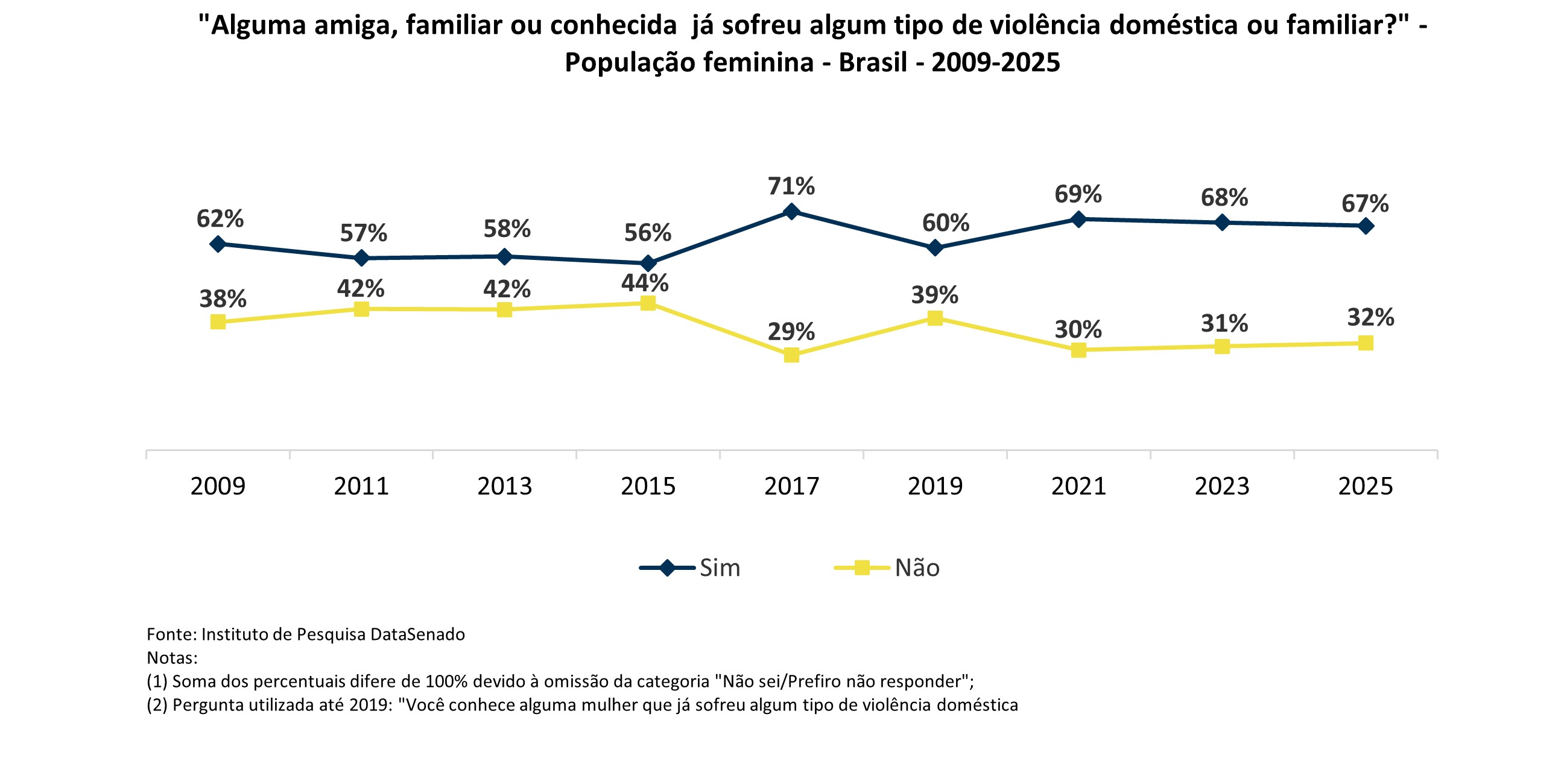 Essa aparente contradição abre espaço para investigações futuras, a fim de melhor identificar os elementos que confirmem ou não a continuidade da redução da violência doméstica e familiar sofrida pelas brasileiras, bem como as possíveis variações na percepção geral acerca do tema.