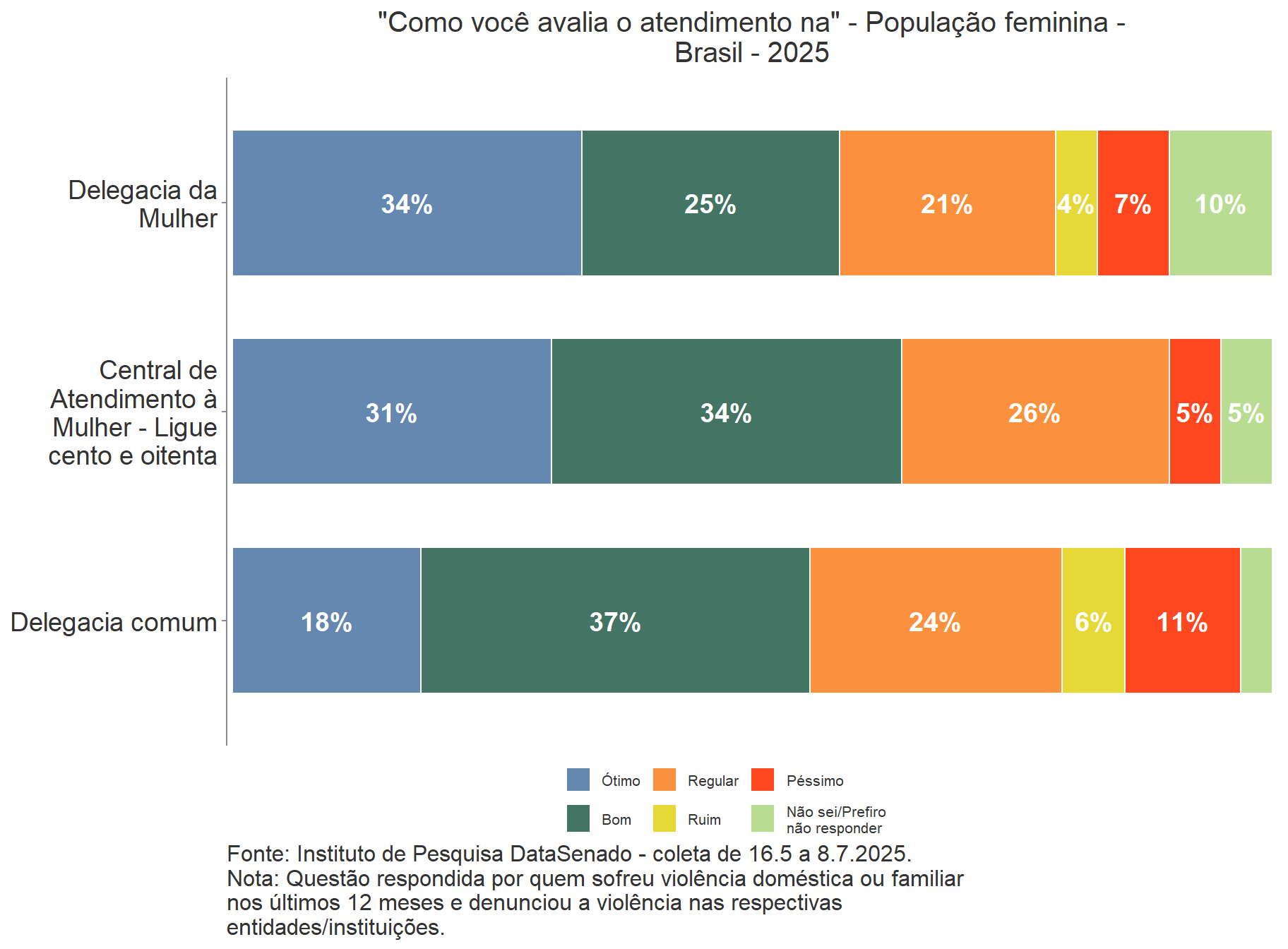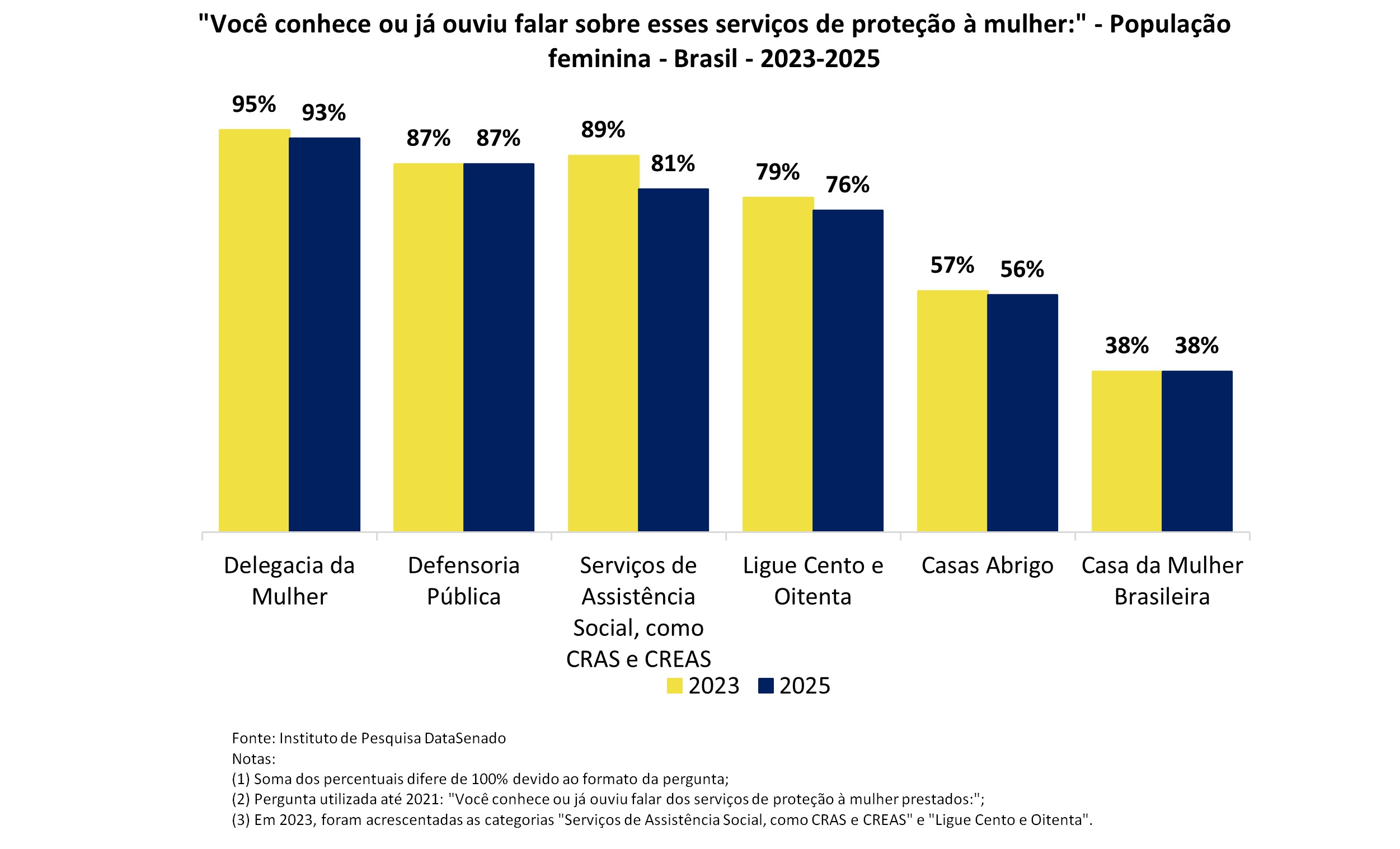 O conhecimento sobre serviços de apoio em casos de violência contra a mulher foi avaliado. Delegacias especializadas no atendimento à mulher são conhecidos por 93% das brasileiras, seguido pela Defensoria Pública, conhecida por 87%. A Casa da Mulher Brasileira é conhecida por apenas 38% das mulheres. Houve diminuição de conhecimento sobre os seguintes locais de atendimento: CRAS ou CREAS (Centro de Referência de Assistência Social e Centro de Referência Especializado de Assistência Social, respectivamente) e Ligue Cento e Oitenta.