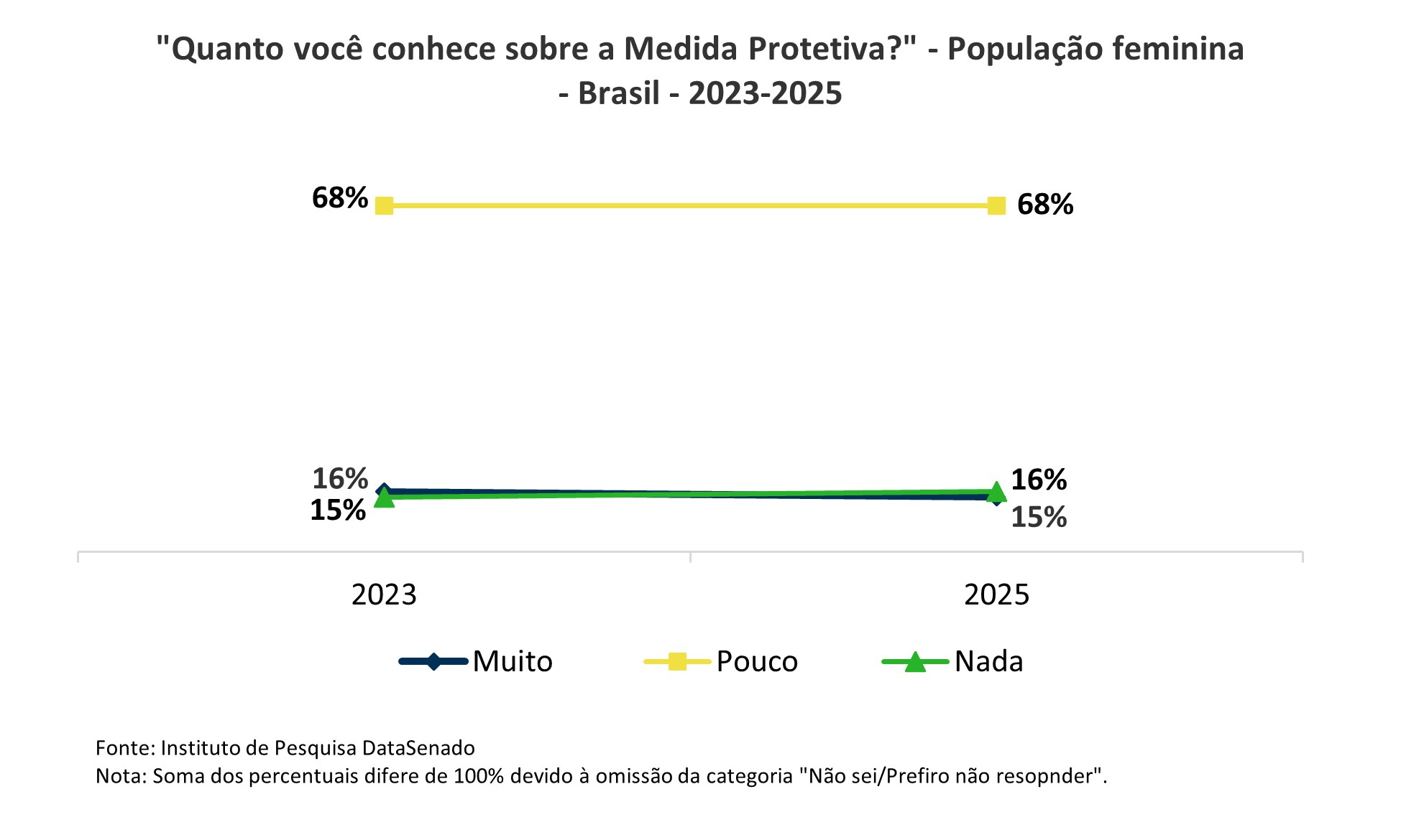 A percepção do próprio conhecimento sobre medidas protetivas não apresentou diferença em relação à 2023, com todas as opções variando na margem de erro. A crença de pouco conhecimento permaneceu em 68%, o que, em 2025, representa uma estimativa de 59 milhões de mulheres.