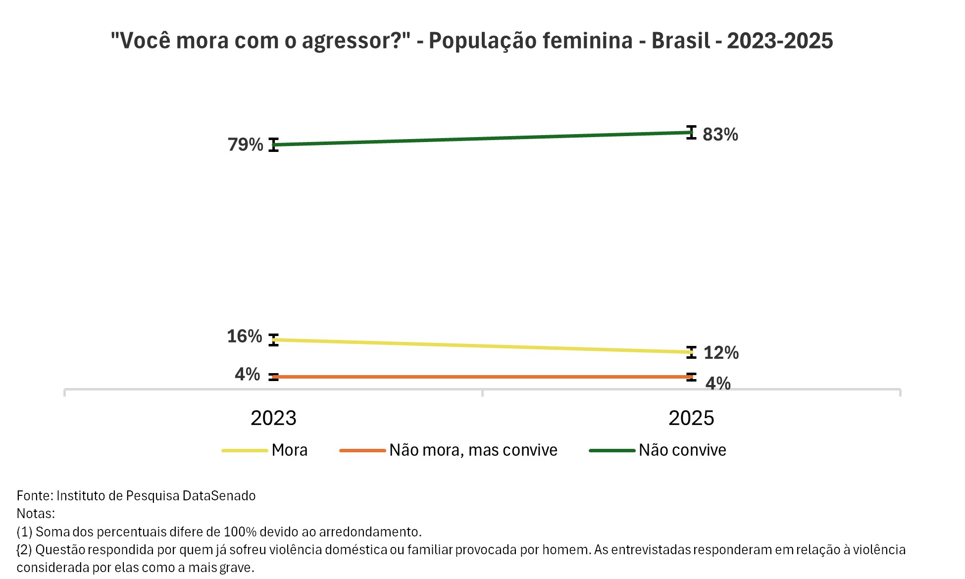 O número estimado de mulheres que convivem com o agressor no momento da entrevista é de 3,9 milhões, o que representa 17% das vítimas de agressão mais grave provocada por homem. Esse percentual tem caído ao longo dos anos.