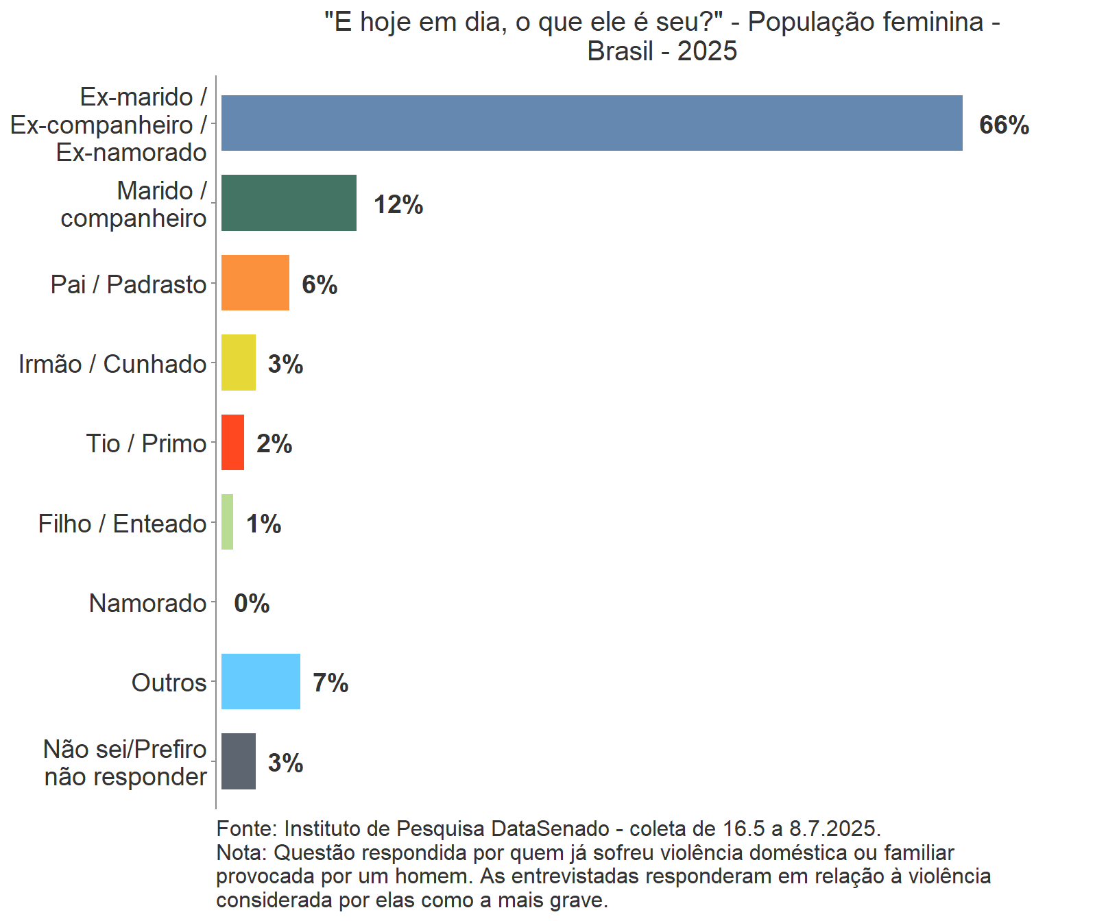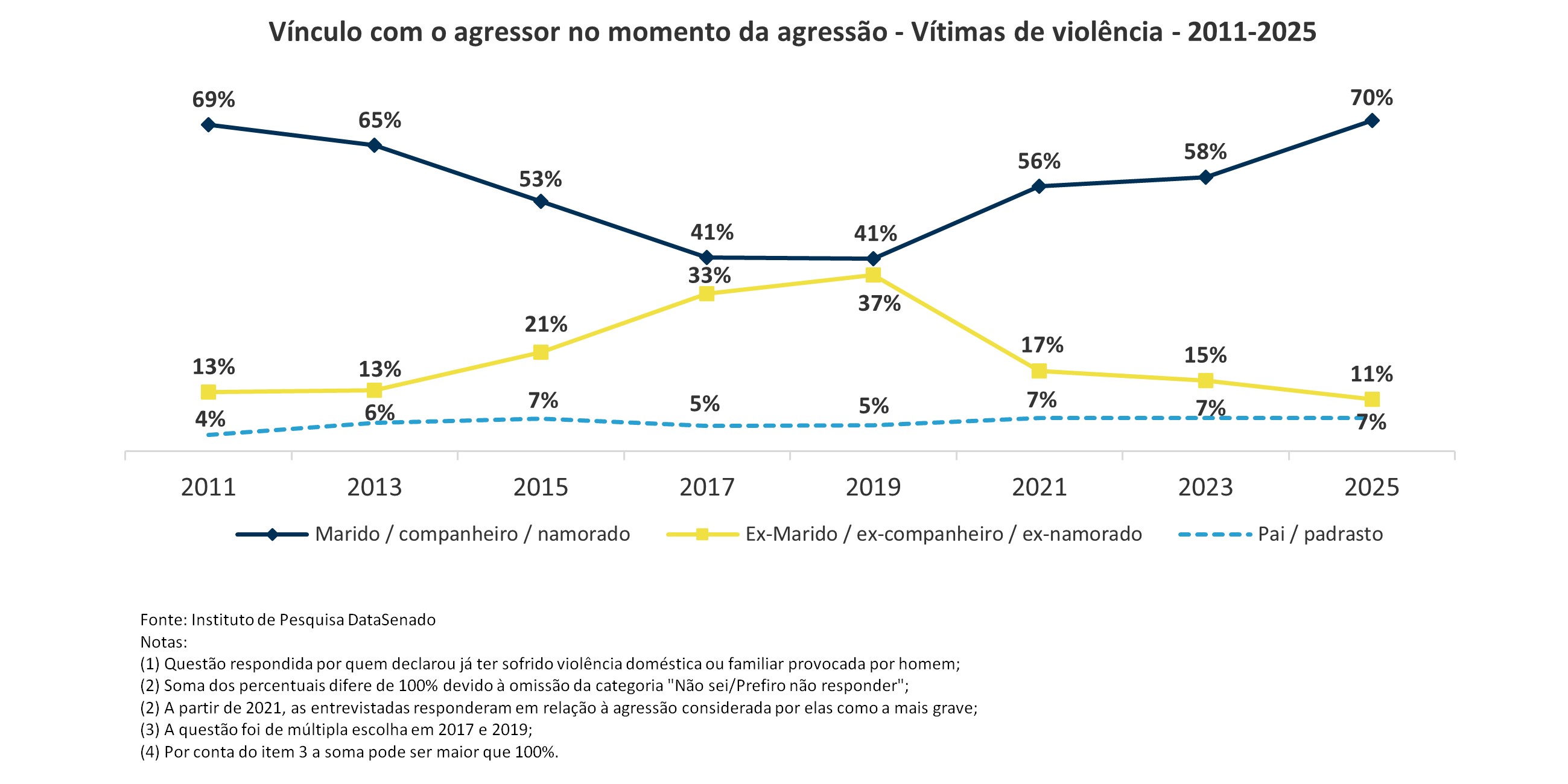 Em 2025, assim como em 2023, a relação mais comum entre agressor e vítima era afetiva (marido, companheiro ou namorado). Nessa rodada da pesquisa, entretanto, a estimativa aumentou de 58% para 70%.