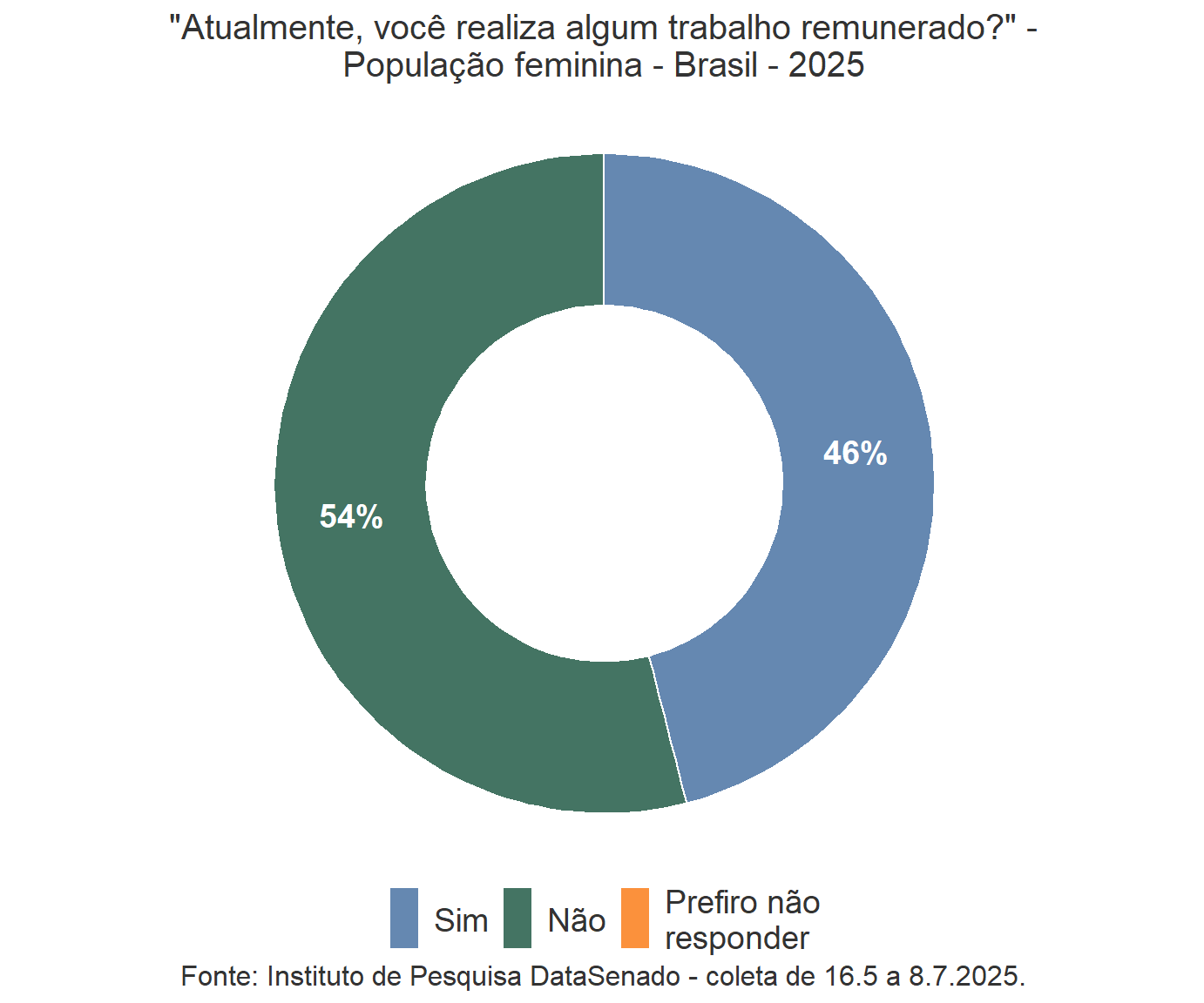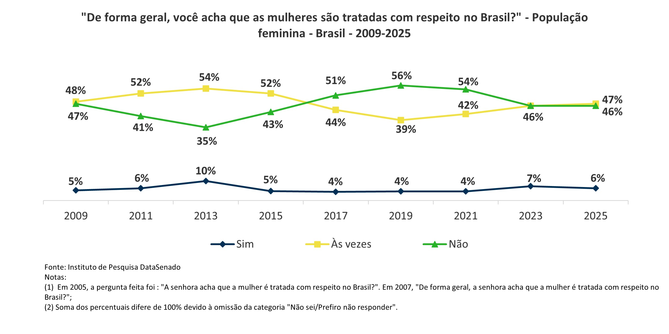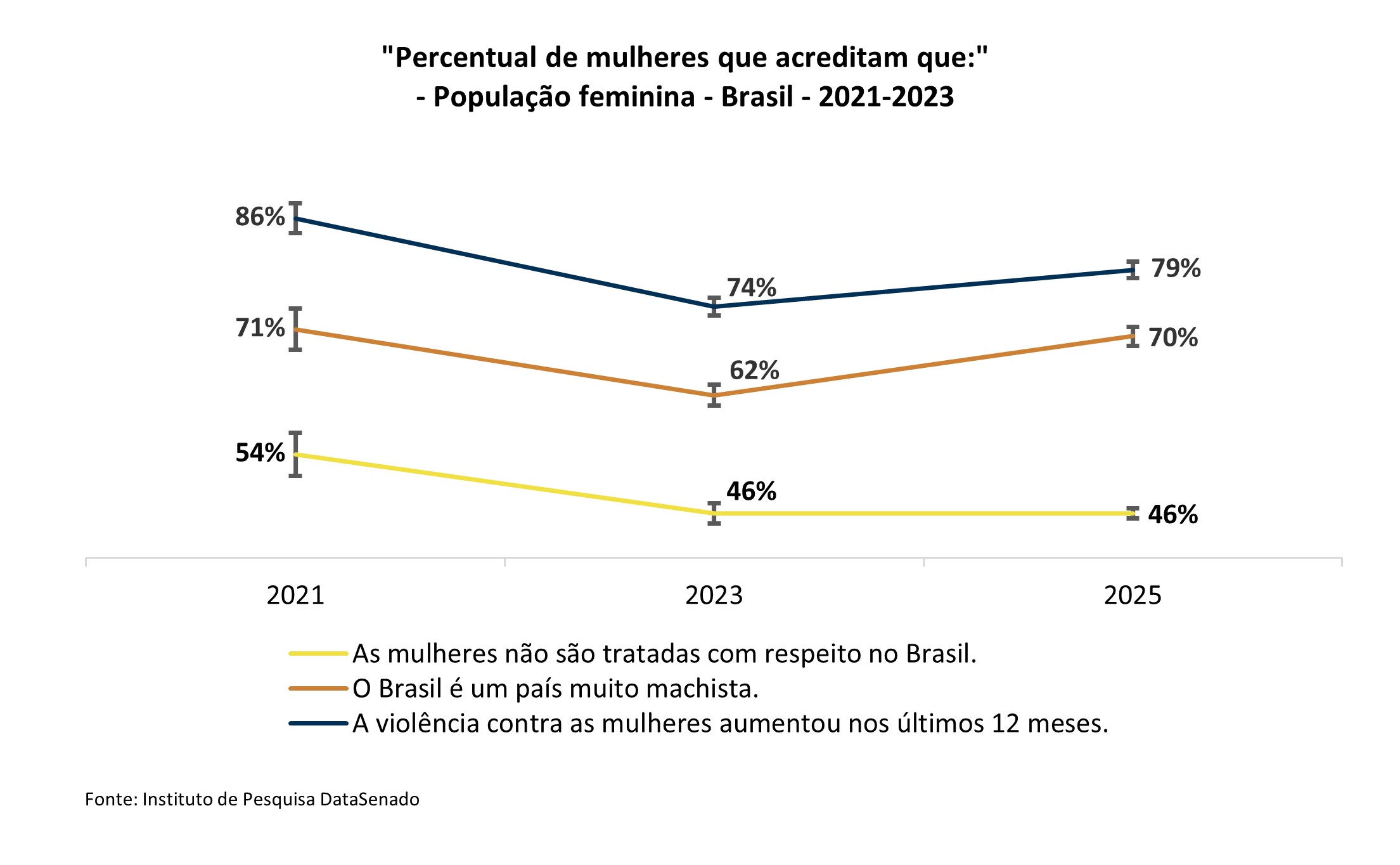 Por exemplo, a percepção de que as mulheres não são tratadas com respeito no Brasil permanece alta e estável, com os mesmos 46% em 2023 e 2025.