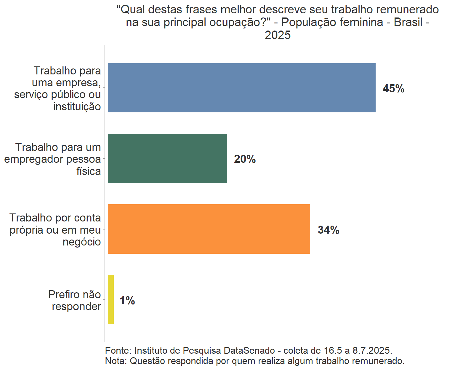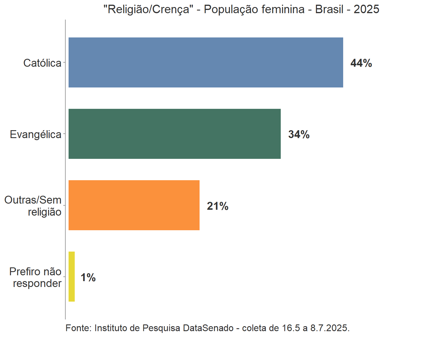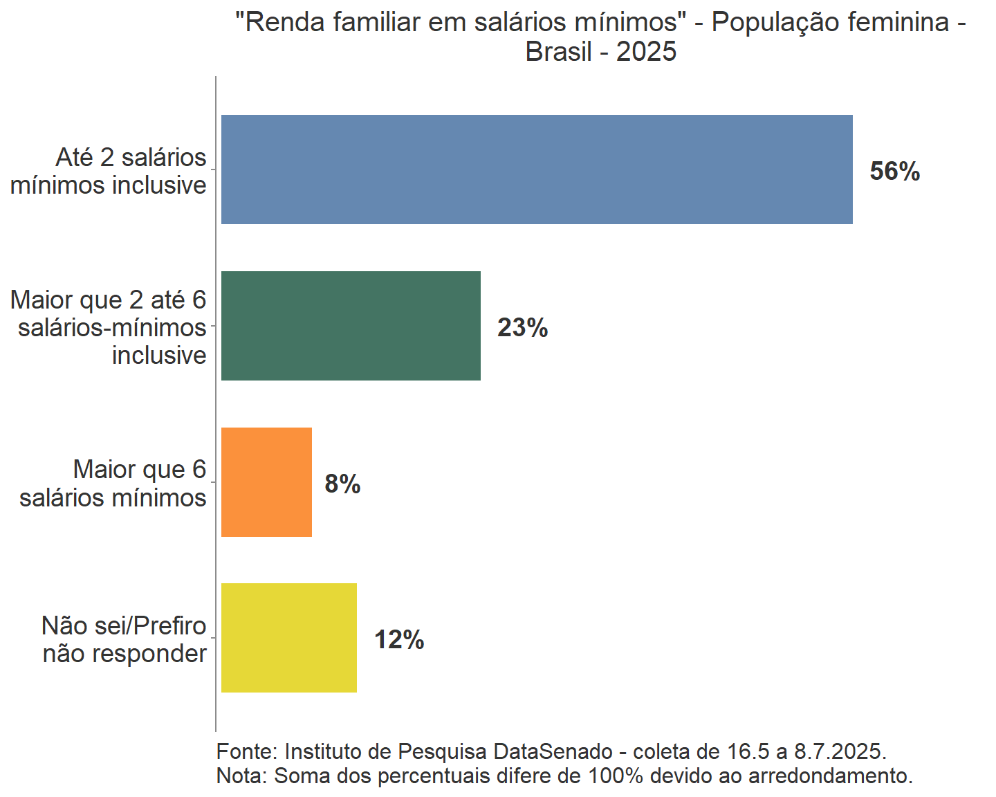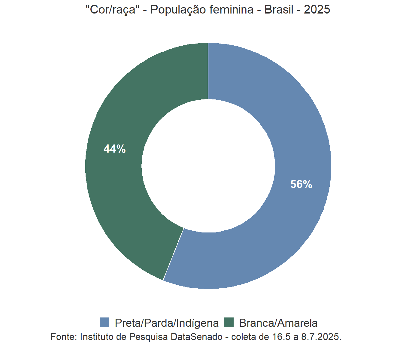 Por exemplo, a percepção de que as mulheres não são tratadas com respeito no Brasil permanece alta e estável, com os mesmos 46% em 2023 e 2025.
