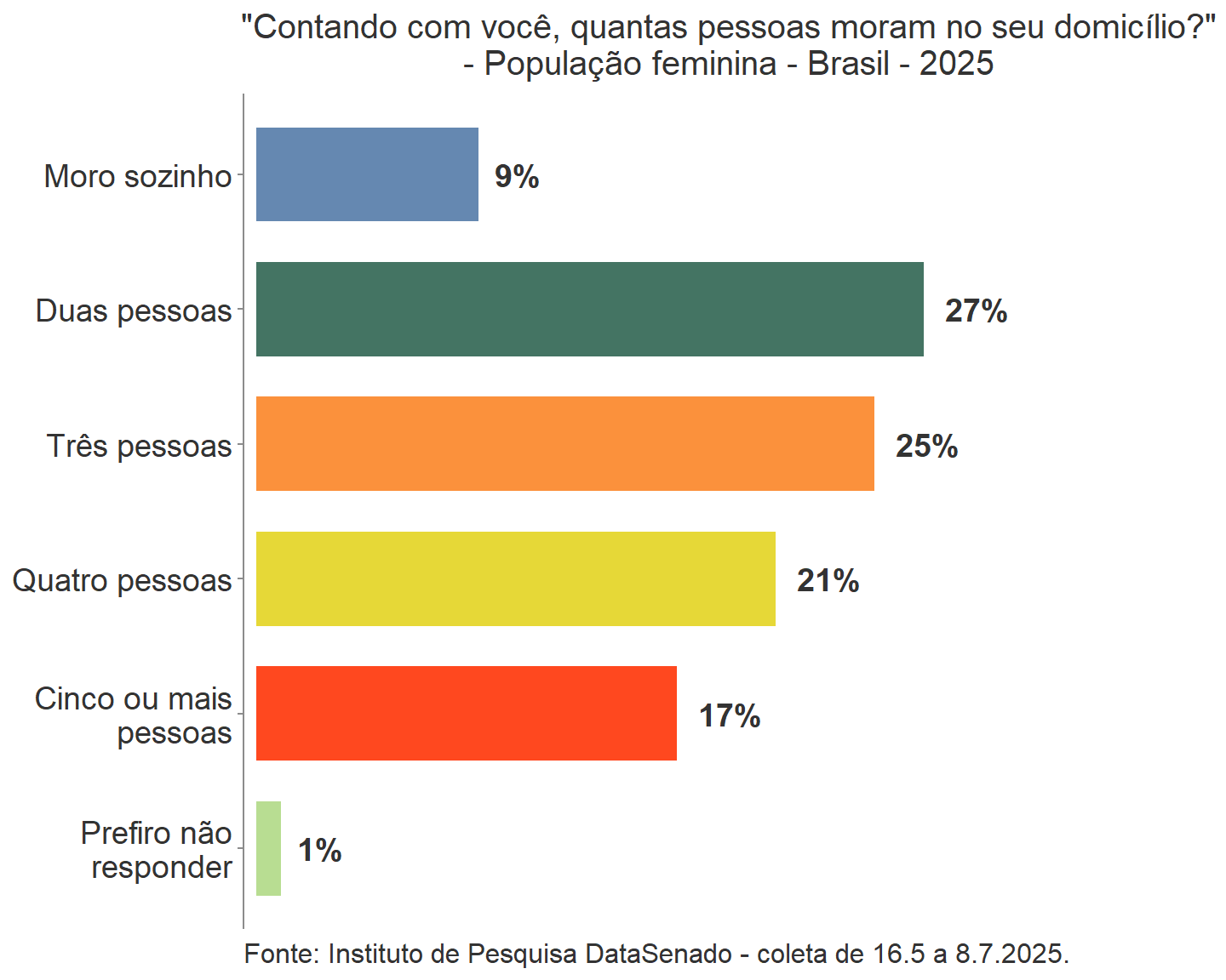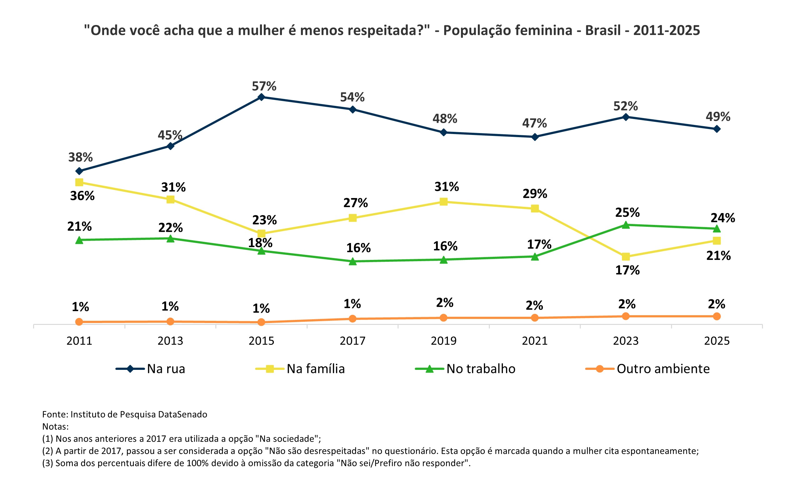 Houve mudanças na percepção dos tipos de espaços em que as mulheres consideraram que são menos respeitadas em 2025. A percepção da rua como o local de menor respeito apontou uma queda estatisticamente significante de 3%, entre as pesquisas de 2023 e 2025, enquanto o percentual do ambiente familiar apresentou aumento significativo de 4% no mesmo período. Em número estimado de mulheres, houve um aumento de pouco mais de 3,3 milhões para esse último, passando de 14,9 para 18,3 milhões mulheres estimadas que consideram o ambiente familiar como o local de menor respeito. Não houve alteração significativa na percepção de desrespeito no ambiente de trabalho.