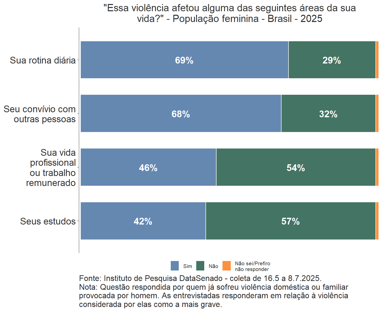 Sobre as consequências da violência mais grave sofrida, foi perguntado quais áreas na vida da vítima foram afetadas. Esse é a primeira vez, nos últimos 20 anos de pesquisa, que se investiga esse tema. A maioria das mulheres que declararam ter sofrido violência teve a vida afetada, primeiro, na rotina diária (69%) e, em segundo, no convívio com outras pessoas (68%). O impacto na vida profissional ou trabalho remunerado foi relatado por 46% das mulheres e, impacto nos estudos, por 42%.