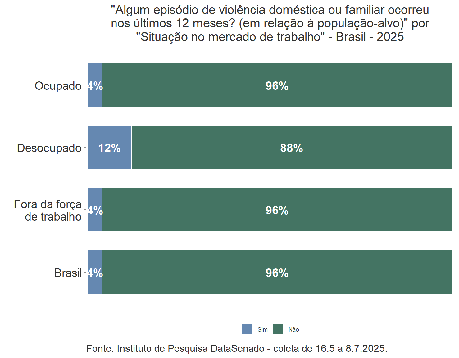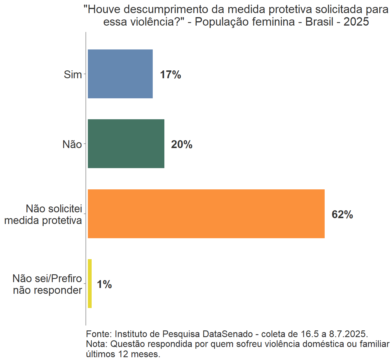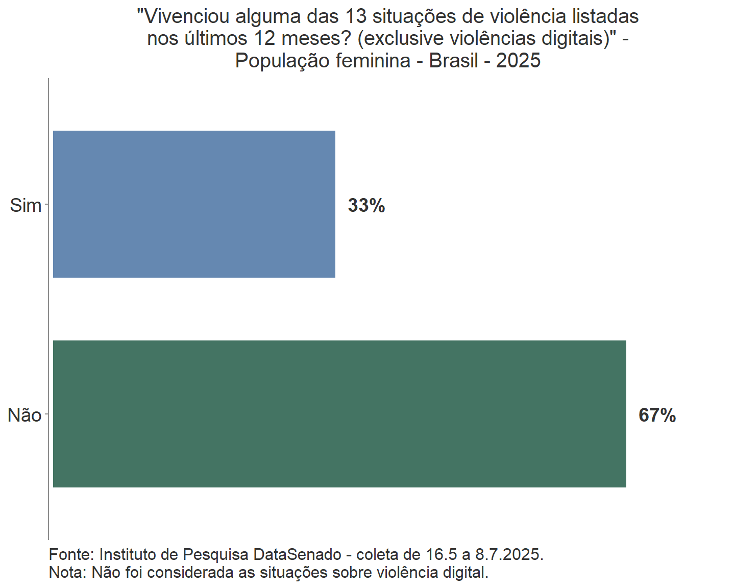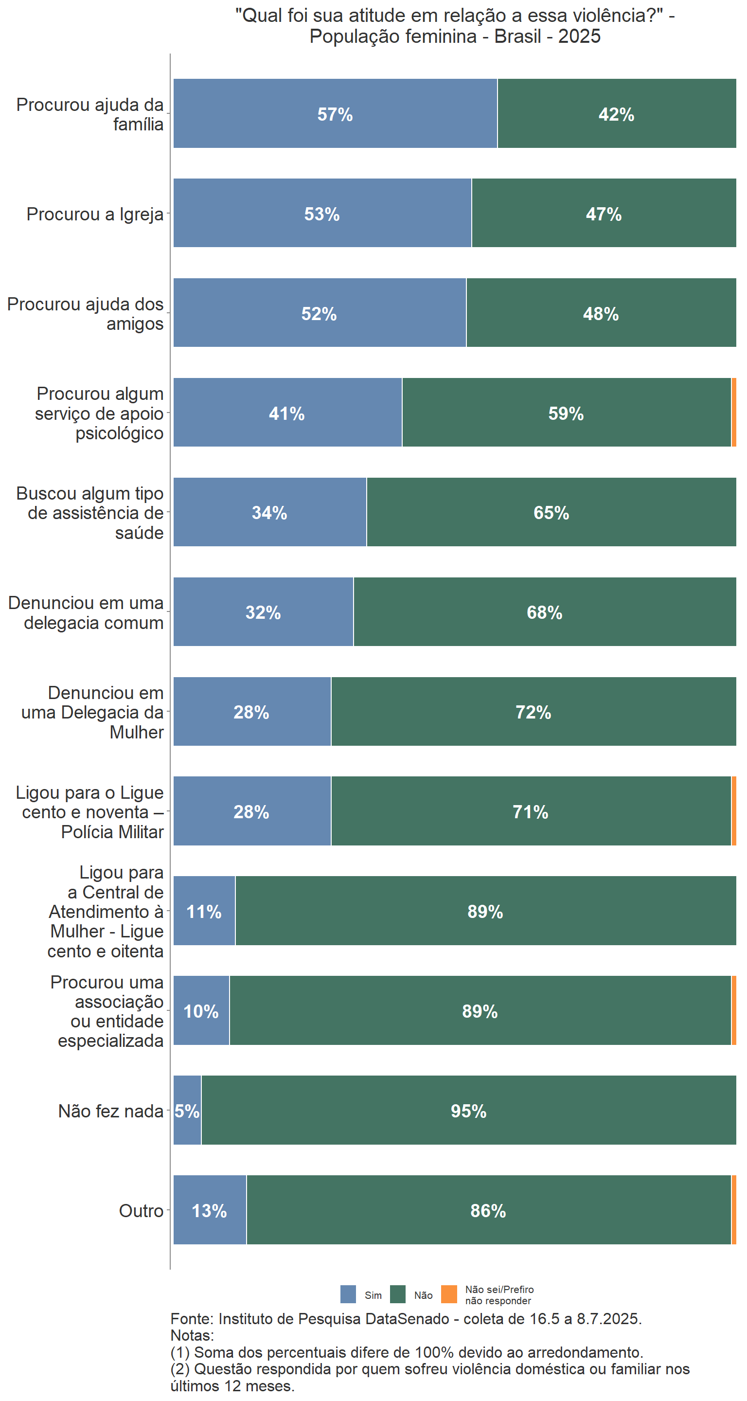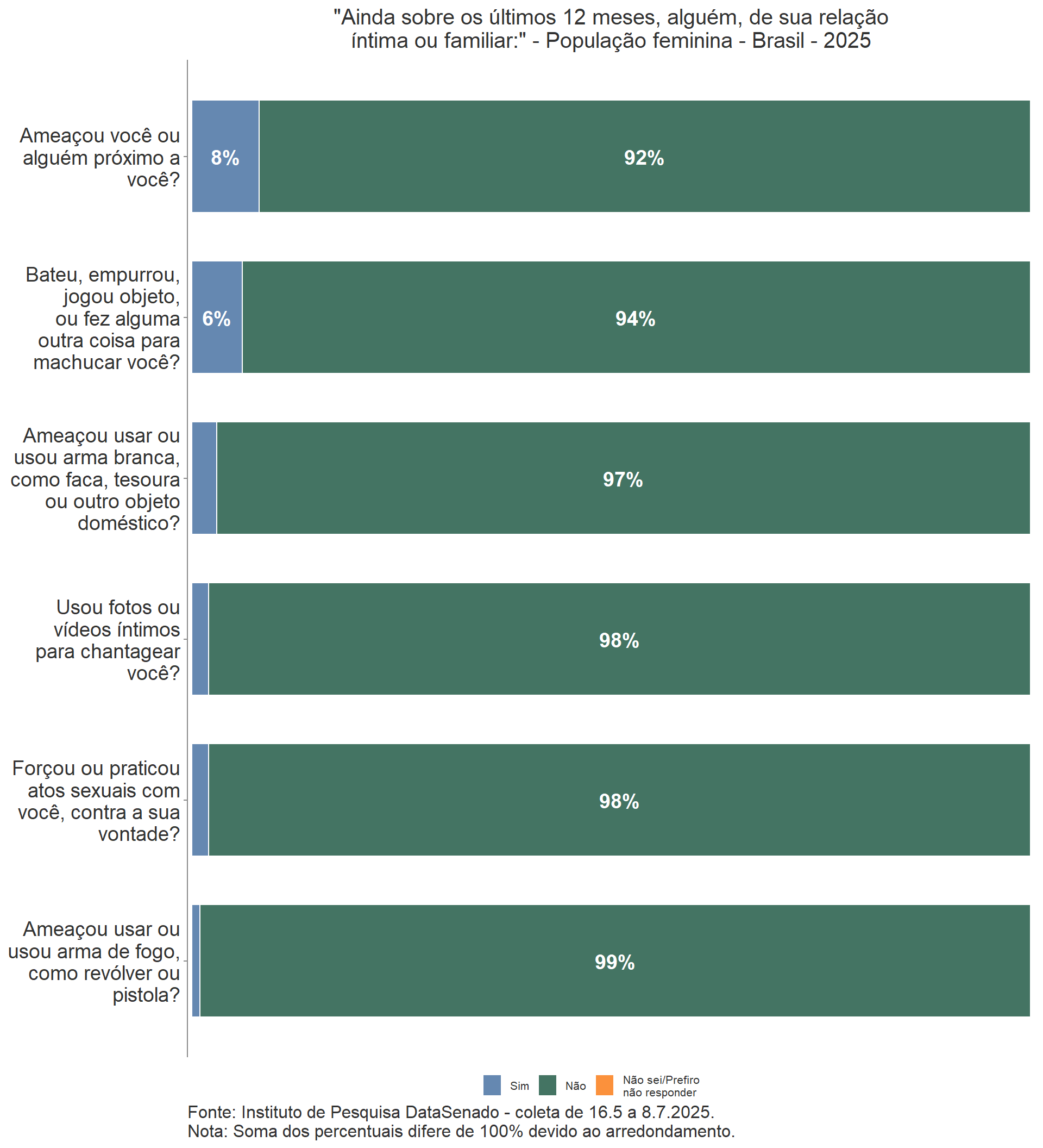 Por outro lado, o contrário não é verdadeiro, já que a maioria das mulheres que vivenciaram pelo menos uma situação específica de violência listado na pesquisa respondeu “não” à pergunta anterior, feita de forma genérica, se sofreu violência doméstica ou familiar nos mesmos últimos 12 meses.