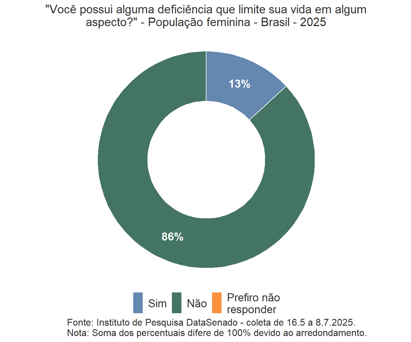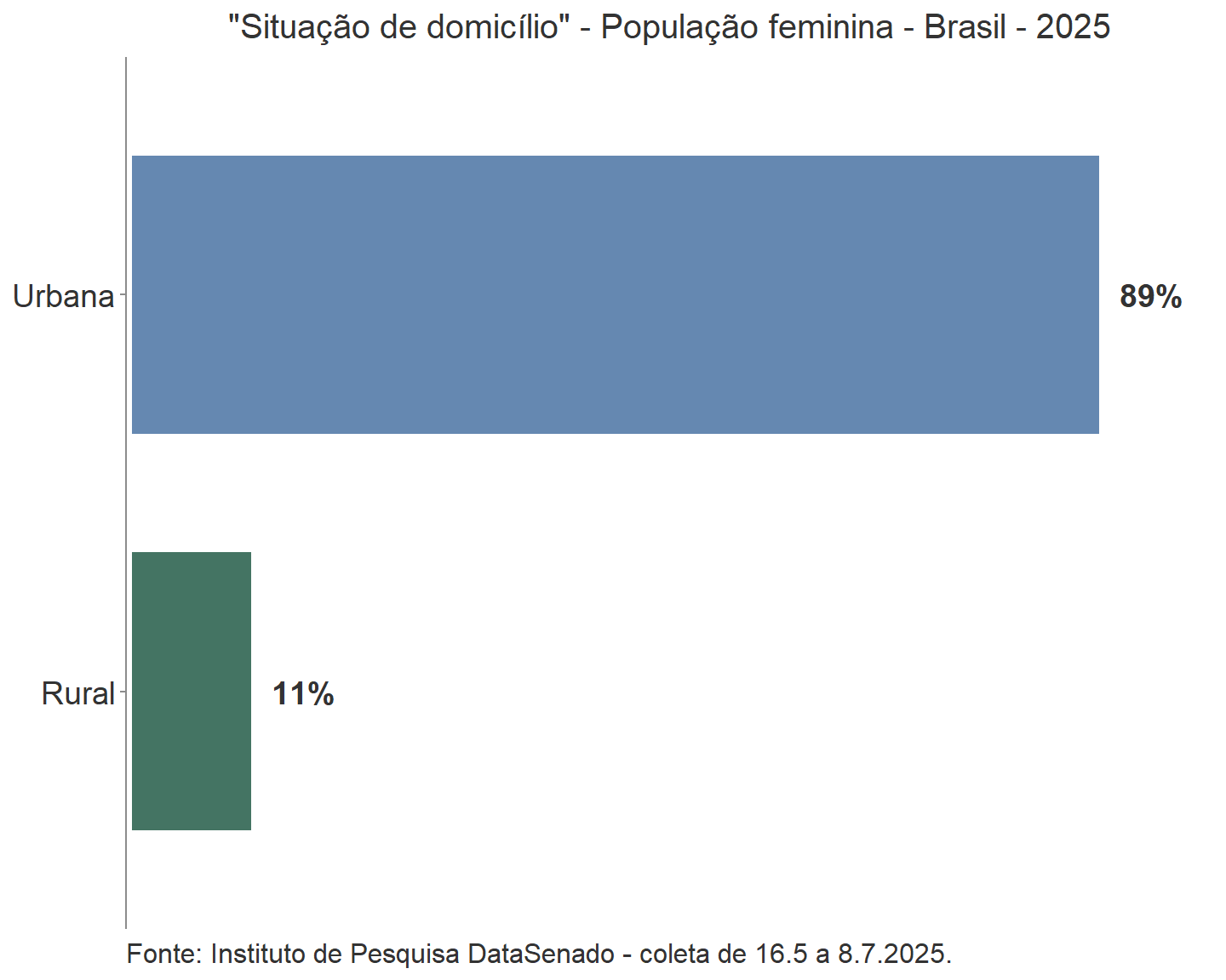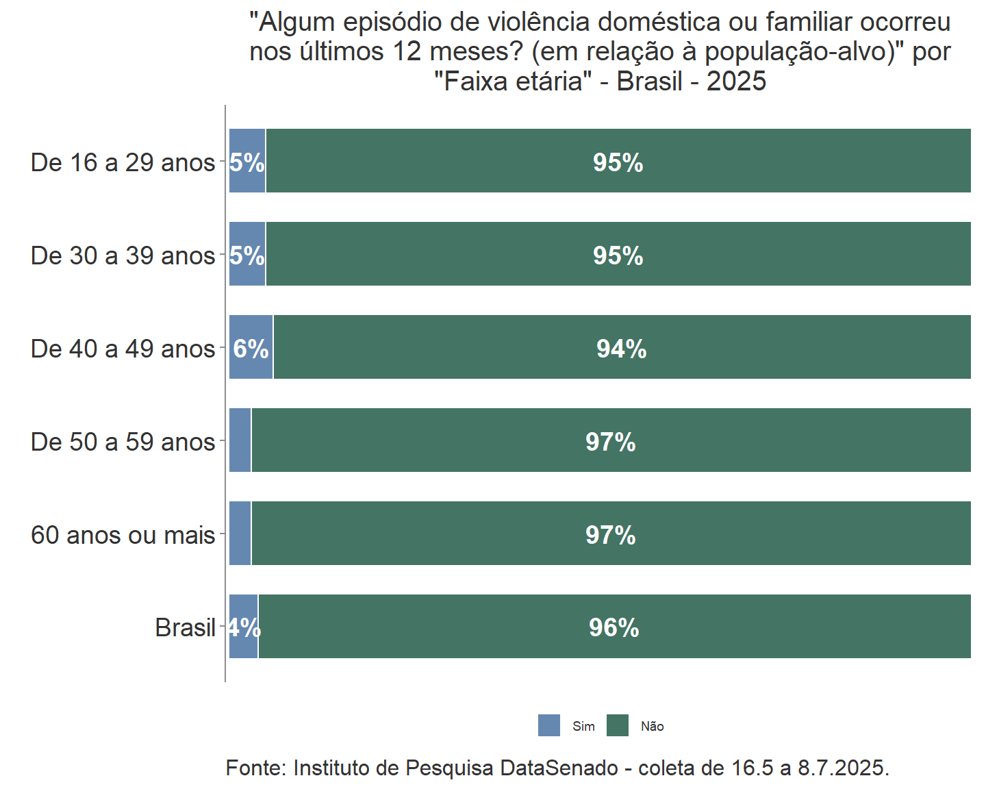 As amostras do DataSenado são totalmente probabilísticas, permitindo calcular a margem de erro para cada resultado com nível de confiança de 95%. Para estimativas simples envolvendo todas as 21.641 mulheres entrevistadas, a margem de erro média foi de 0,69 ponto percentual, com desvio padrão de 0,45 ponto percentual. As entrevistas foram distribuídas por todas as unidades da Federação, por meio de ligações para telefones fixos e móveis, com alocação uniforme por estado e Distrito Federal. As inferências apresentadas são válidas para toda a população-alvo da pesquisa.