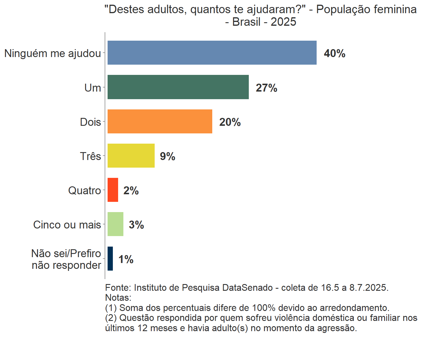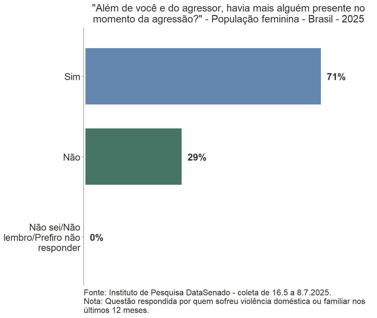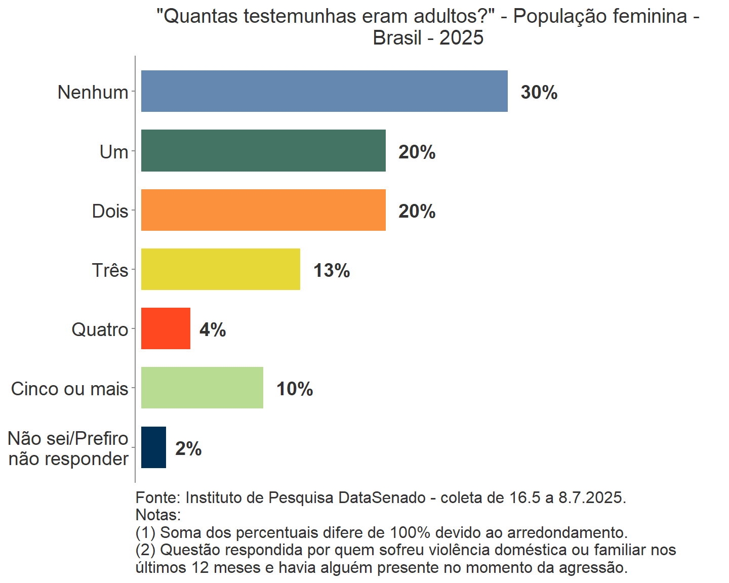 Quanto às pessoas que presenciaram as violências declaradas pelas mulheres, a pesquisa revela que 71% das agressões ocorridas nos últimos 12 meses foram testemunhadas por uma ou mais pessoas. Cerca de 22% dessas violências tiveram como testemunhas apenas crianças e 48%, ao menos um adulto. Verifica-se que, em 19% das violências havia algum adulto presente que não ajudou a vítima (margem de erro de ±4,7%).