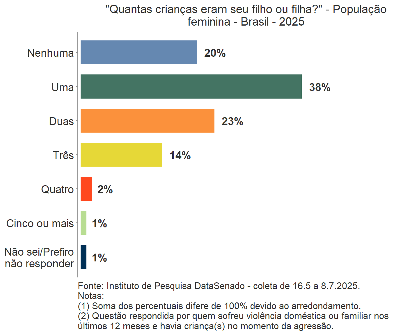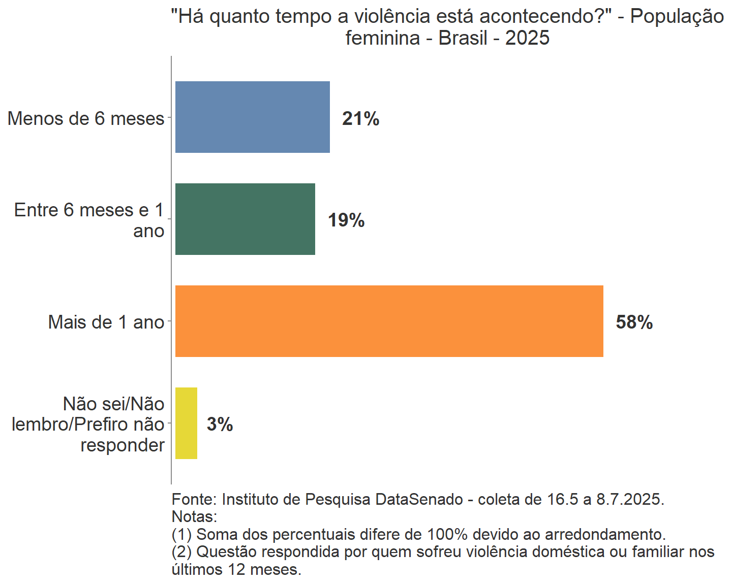 De 2021 em diante, passou-se a perguntar para as mulheres que já tinha sofrido alguma violência doméstica ou familiar na vida, se a violência mais grave foi provocada por homem ou por mulher. Cerca de 1% das brasileiras (893 mil, aproximadamente) sofreram essa violência outra mulher.
