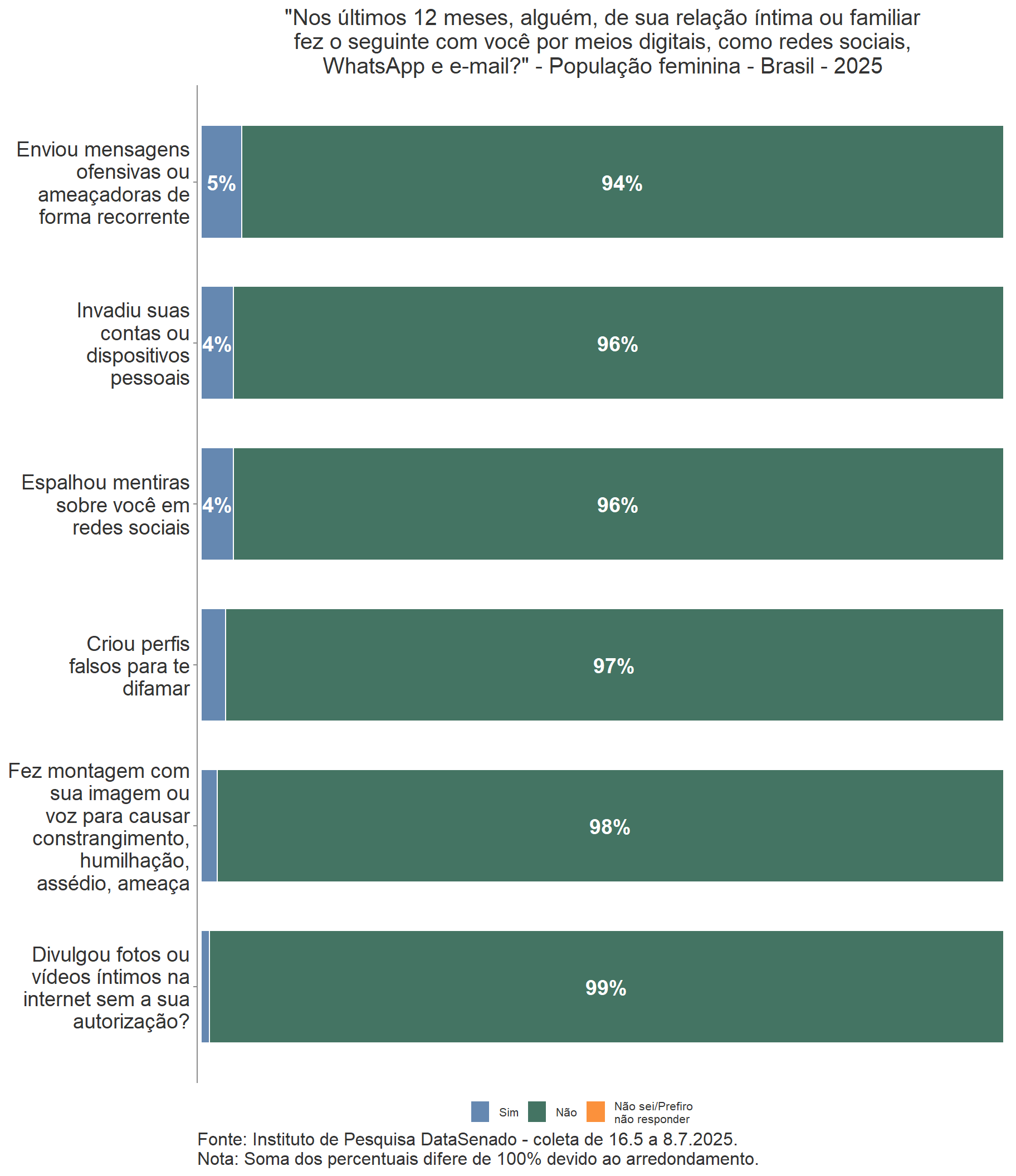 A pesquisa revela que 8,8 milhões de brasileiras (10% da população feminina de 16 anos ou mais) sofreram algum tipo de violência digital nos últimos 12 meses, a maioria desses casos se referindo ao envio de mensagens ofensivas ou ameaçadoras de forma recorrente (ver análise mais detalhada na subseção Violências vividas, ainda que nem sempre percebidas).
