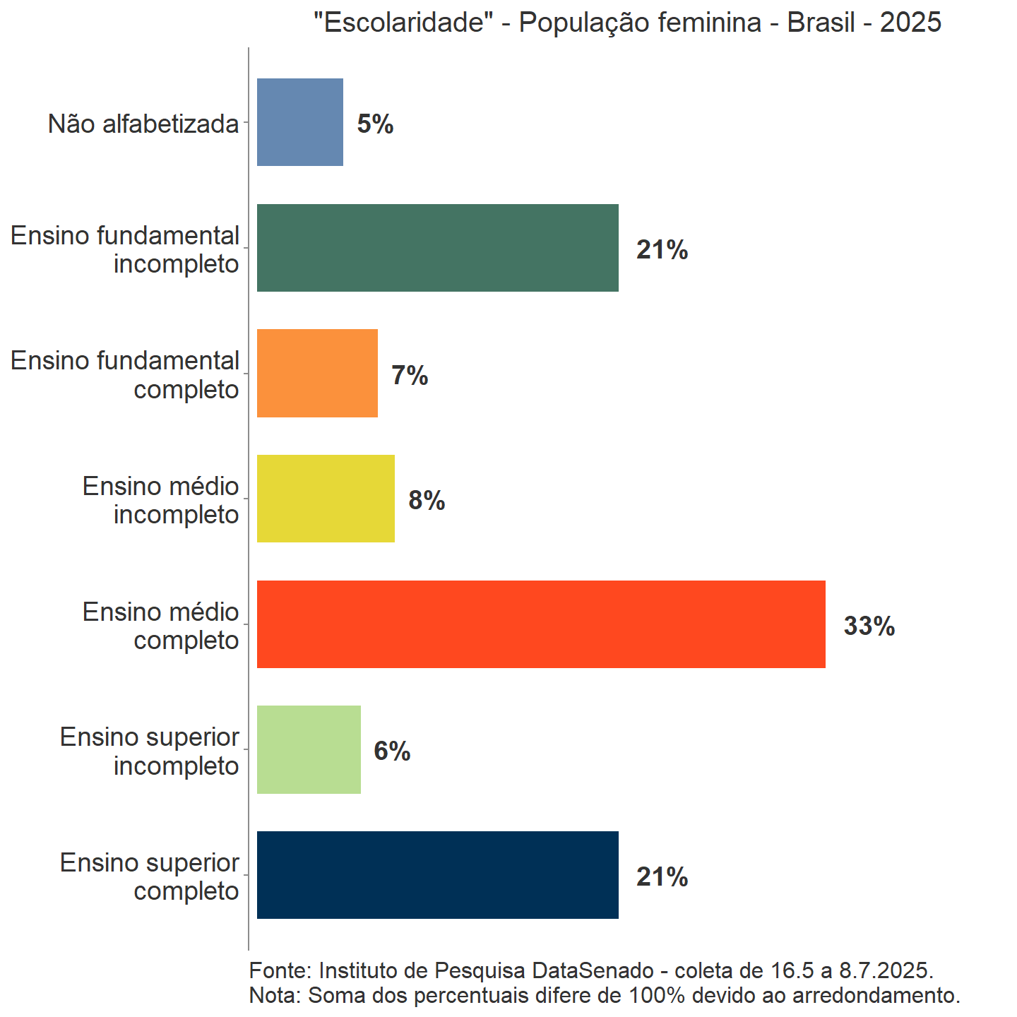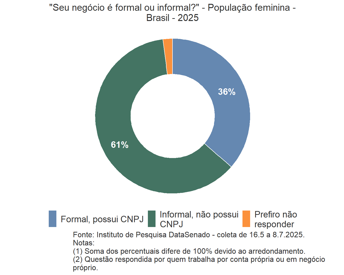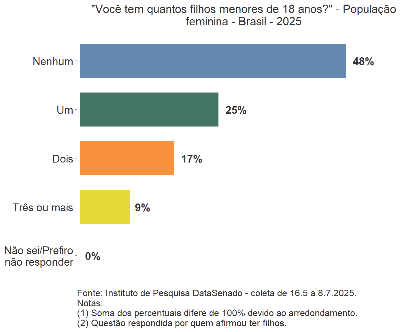Os percentuais estimados e divulgados no relatório foram arredondados de acordo com o seguinte critério: para números com decimal menor que 0,5, foi mantida a parte inteira; e para números com decimal maior ou igual a 0,5, adicionou-se uma unidade à parte inteira do número. O uso desse método de arredondamento faz com que, em alguns casos, a soma dos percentuais de gráficos e de algumas colunas das tabelas seja diferente de 100%, para mais ou para menos, sem que isso implique em erro de cálculo.