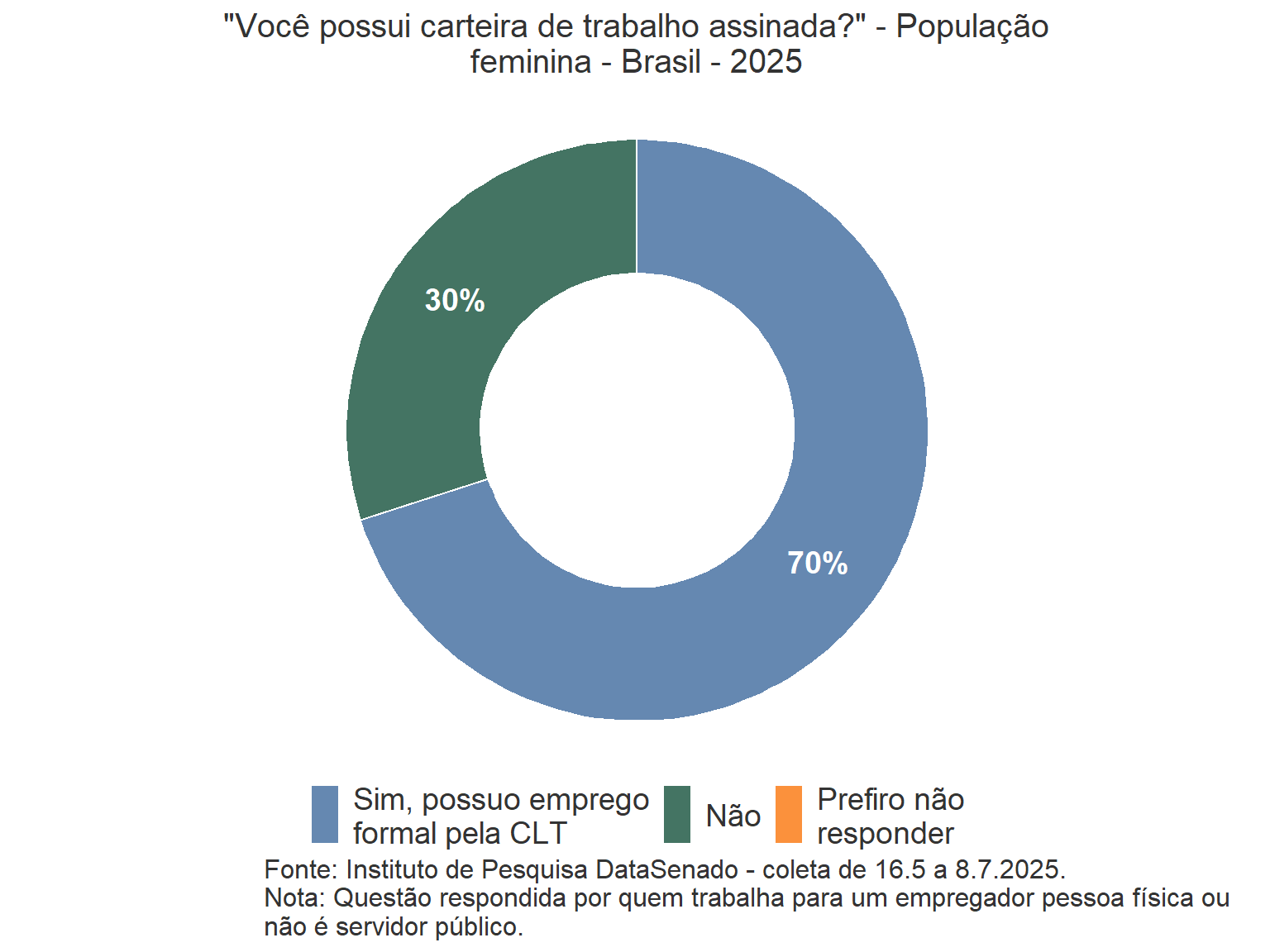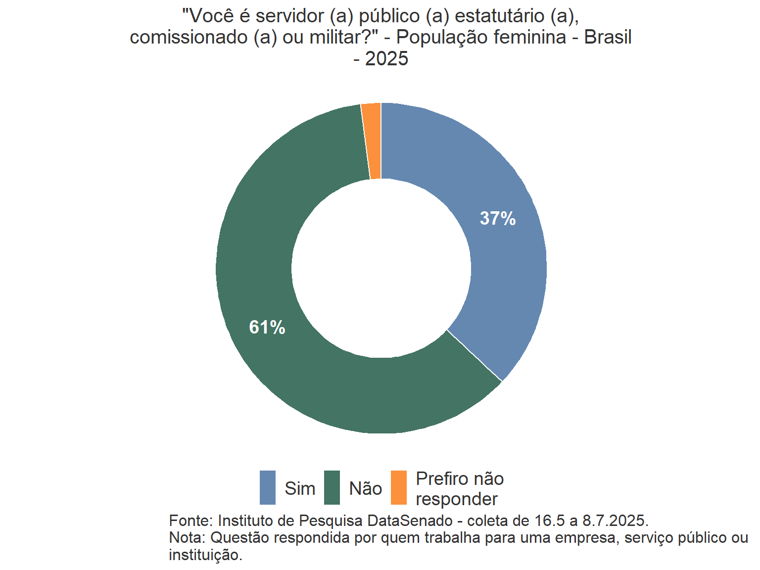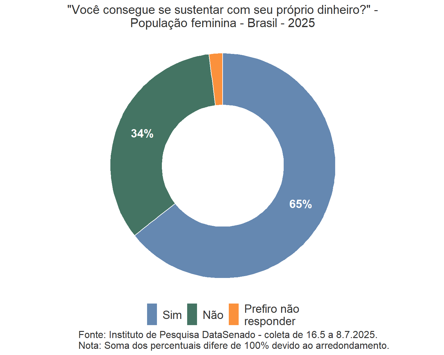 A rodada de 2025 da pesquisa revela que a percepção de que as mulheres são tratadas com respeito no Brasil não apresentou mudanças em relação à rodada de 2023, ao considerar a margem de erro. Da mesma forma, as respostas “Às vezes” e “Não” mantiveram o patamar de 2023, também dentro da margem de erro, indicando que a percepção quanto ao respeito às mulheres permanece estável.